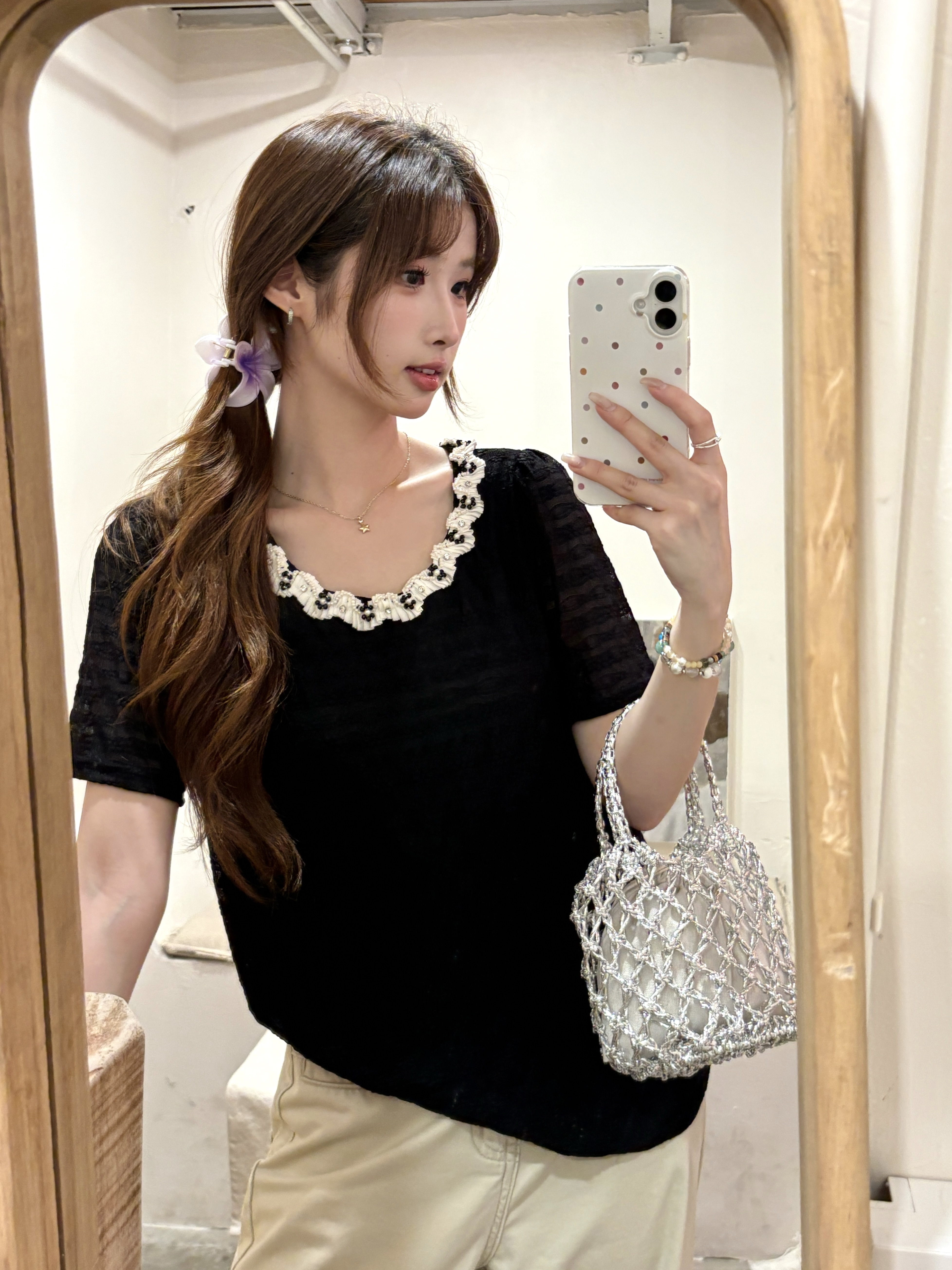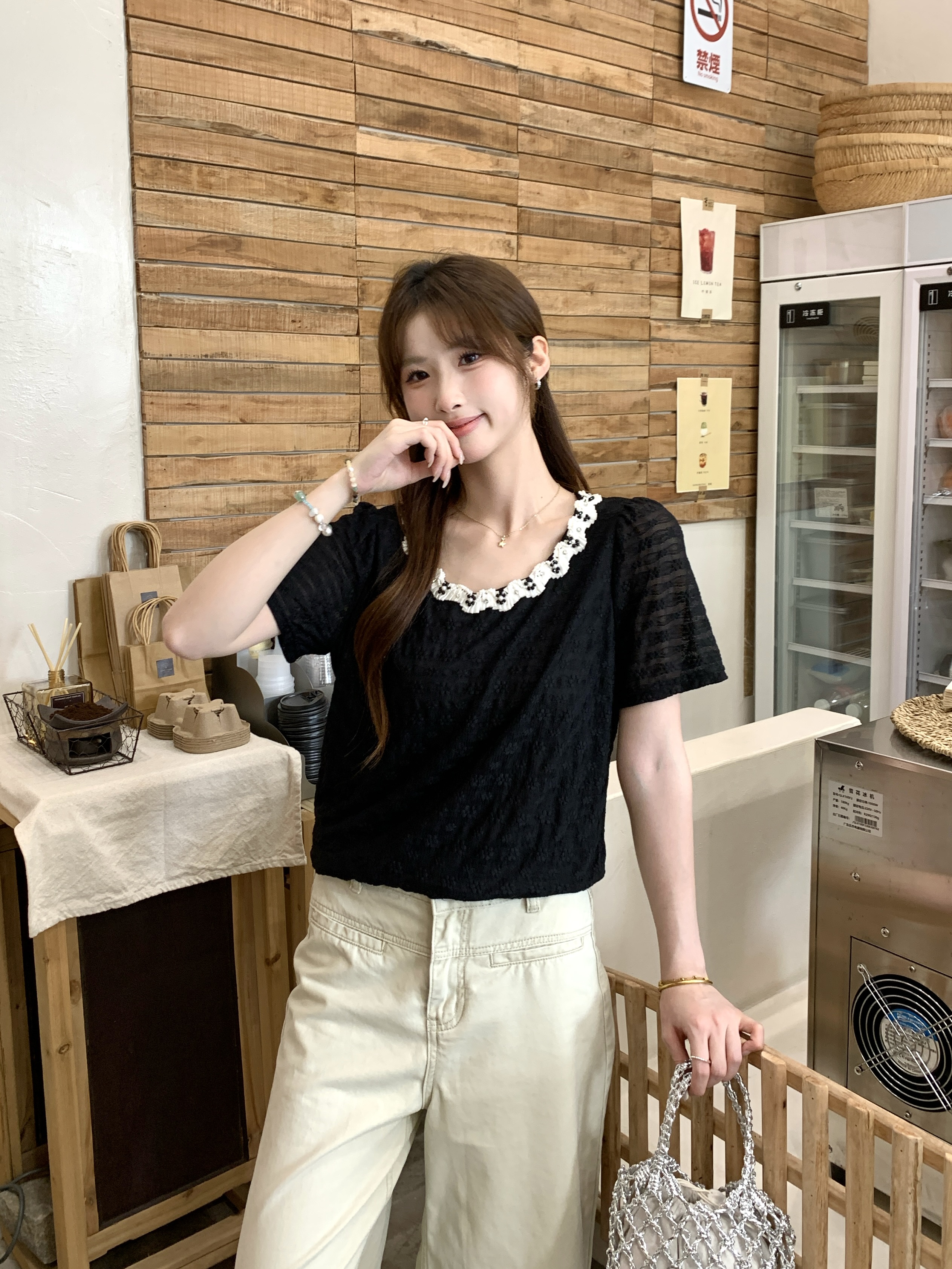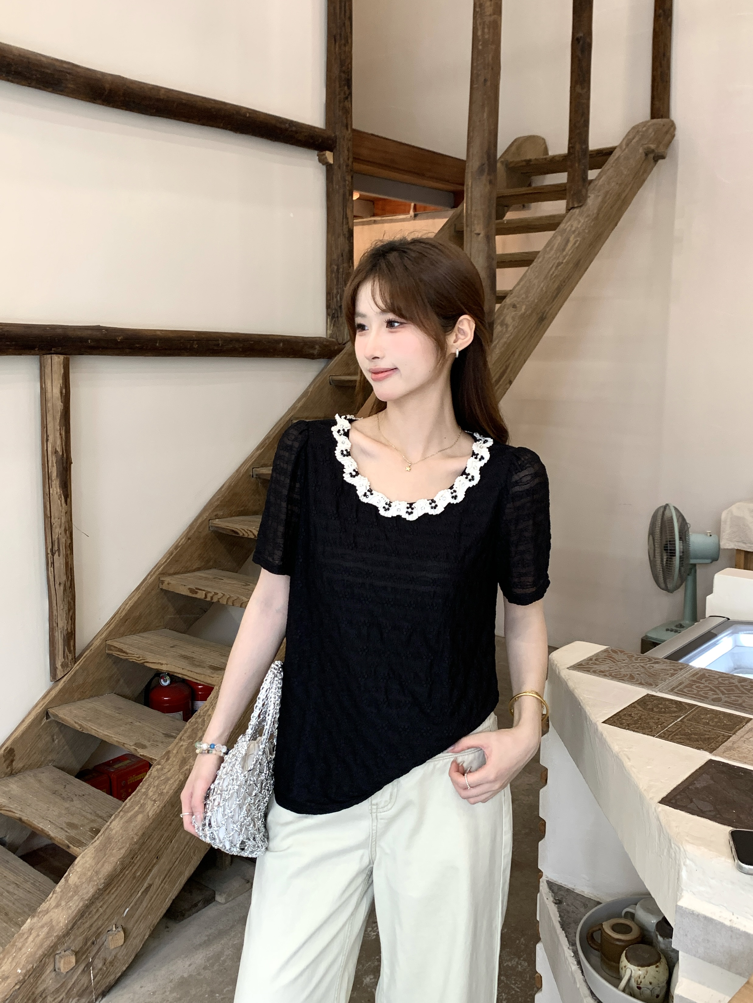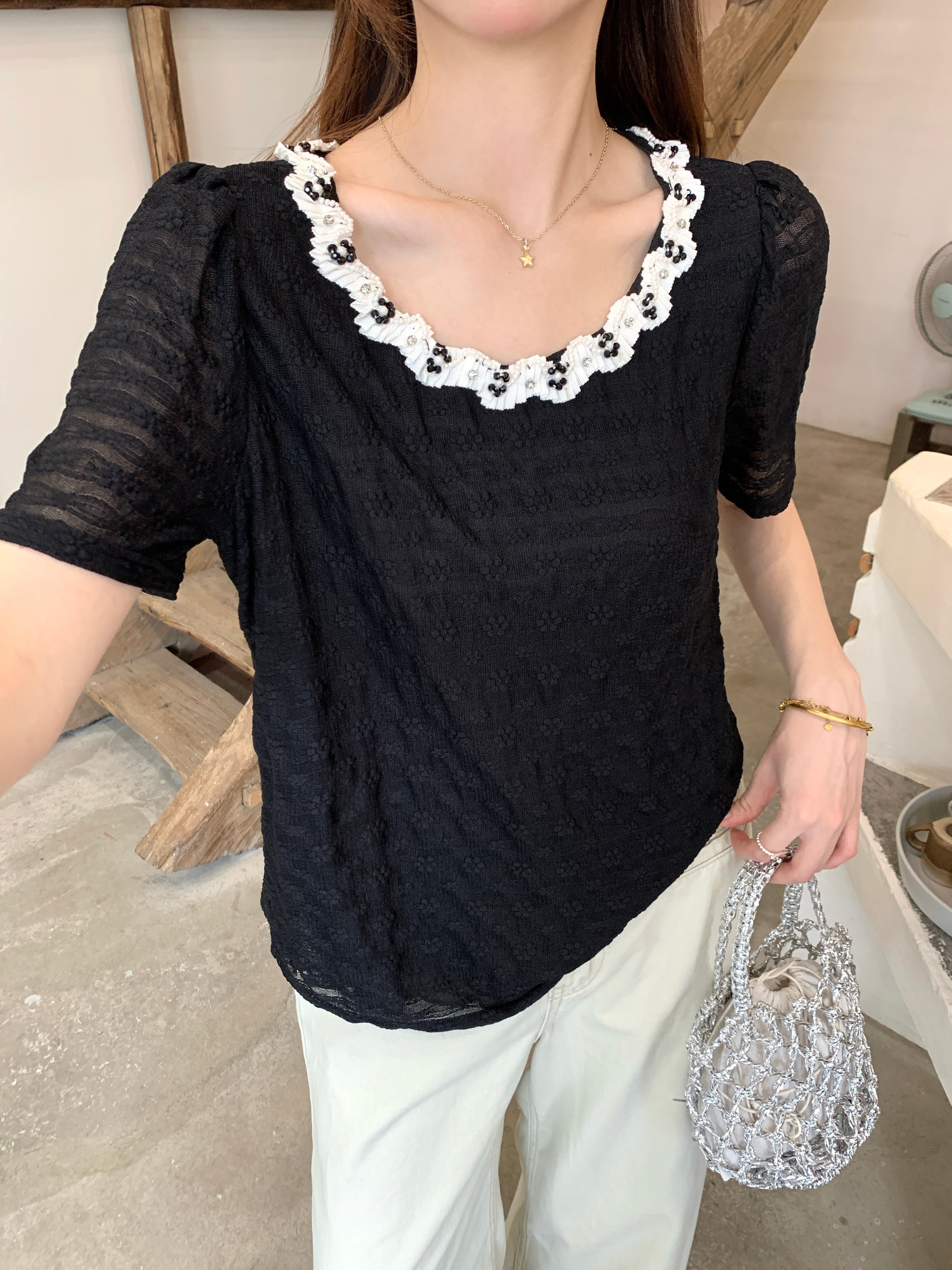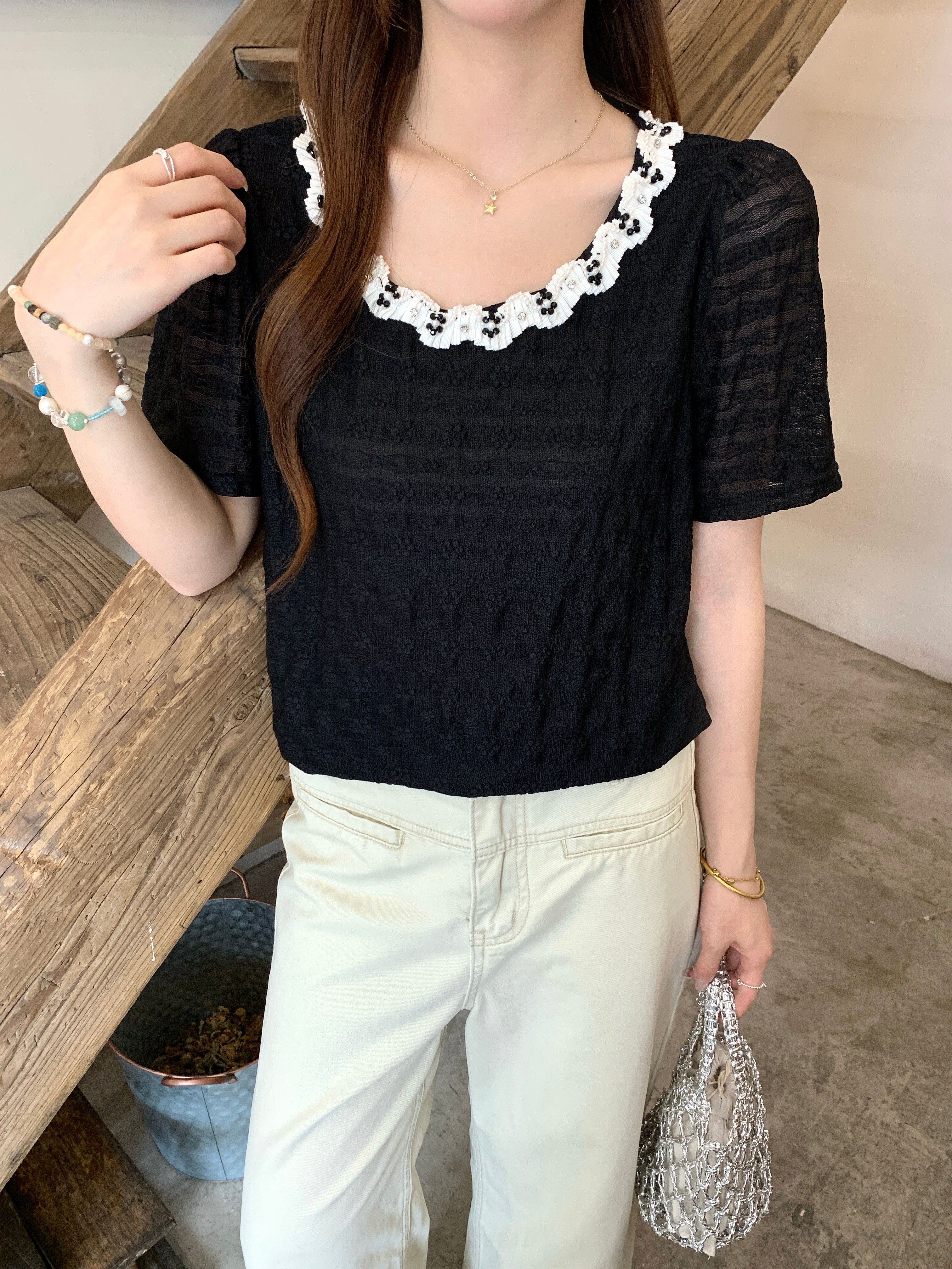 빅 사이즈 프랑스식 빛 럭셔리 검정색 무거운 작업 비즈 박기 레이스 레이스 니트 스웨터 여름 지방 mm 슬림해 보이는 반팔 티셔츠 여성