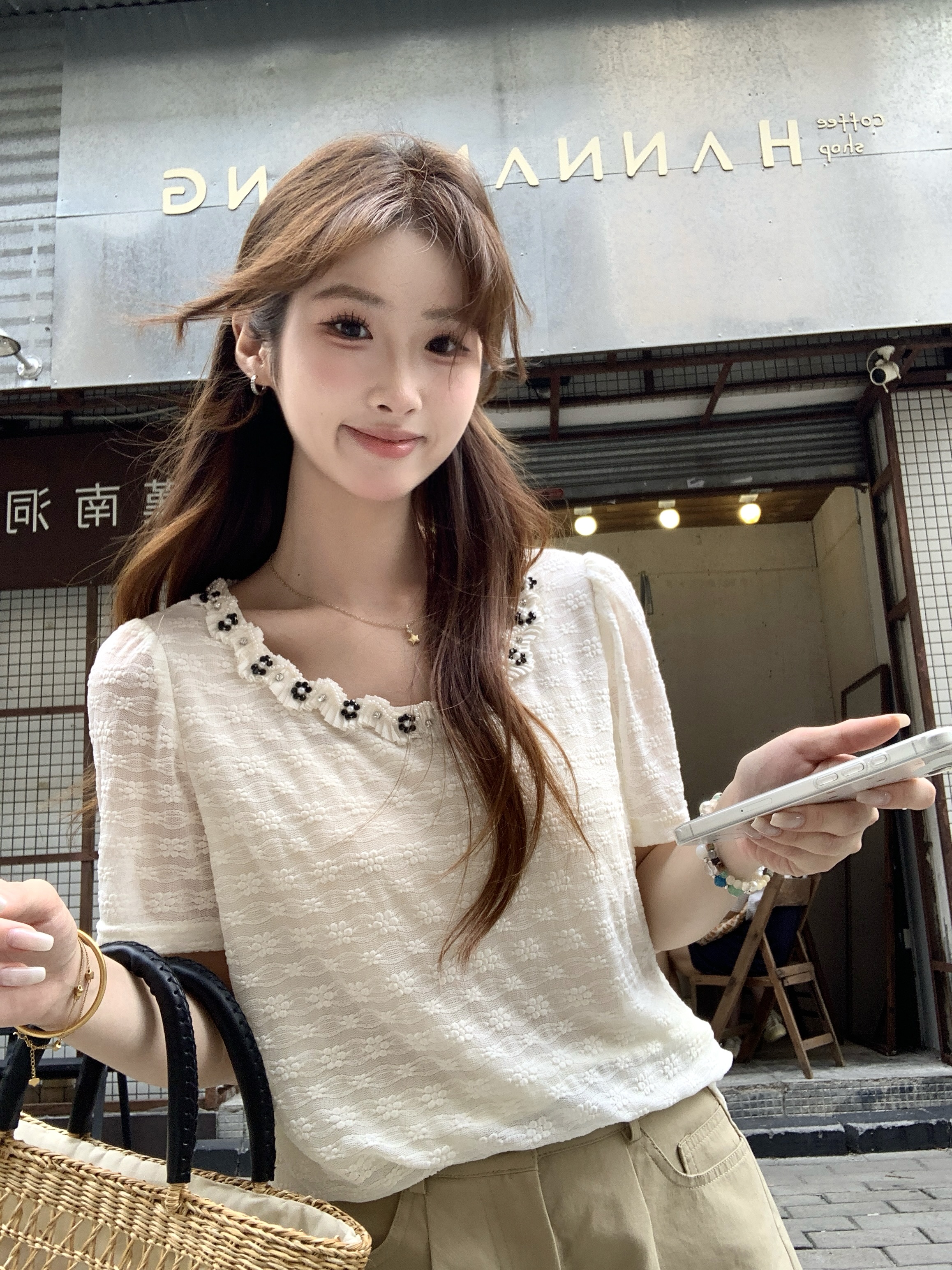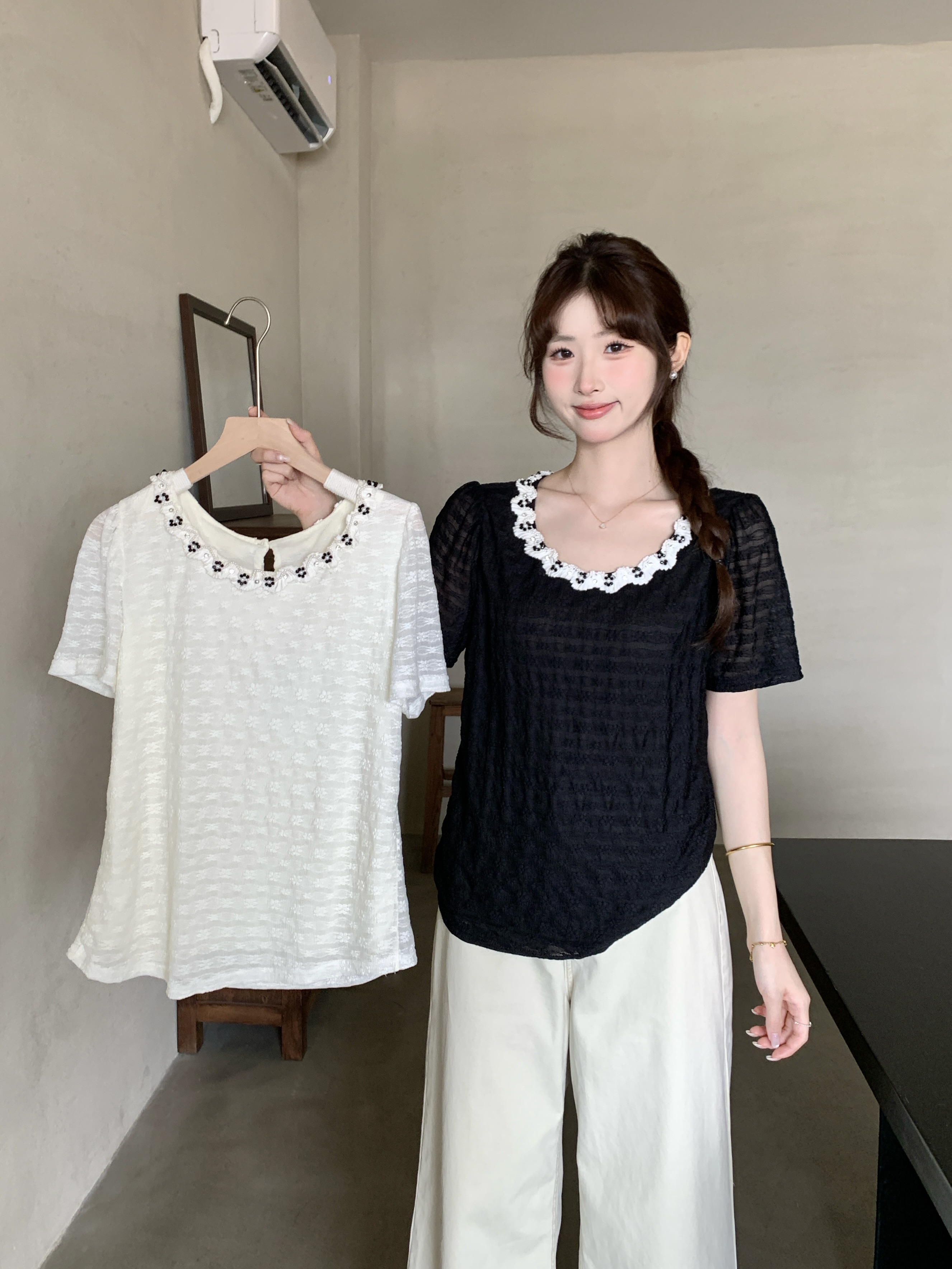 실사 2026 여름 새로운 지방 mm 빅 사이즈 프랑스식 고급 센스 빛 럭셔리 반팔 티셔츠 디자인 센스 비즈 박기 맨위