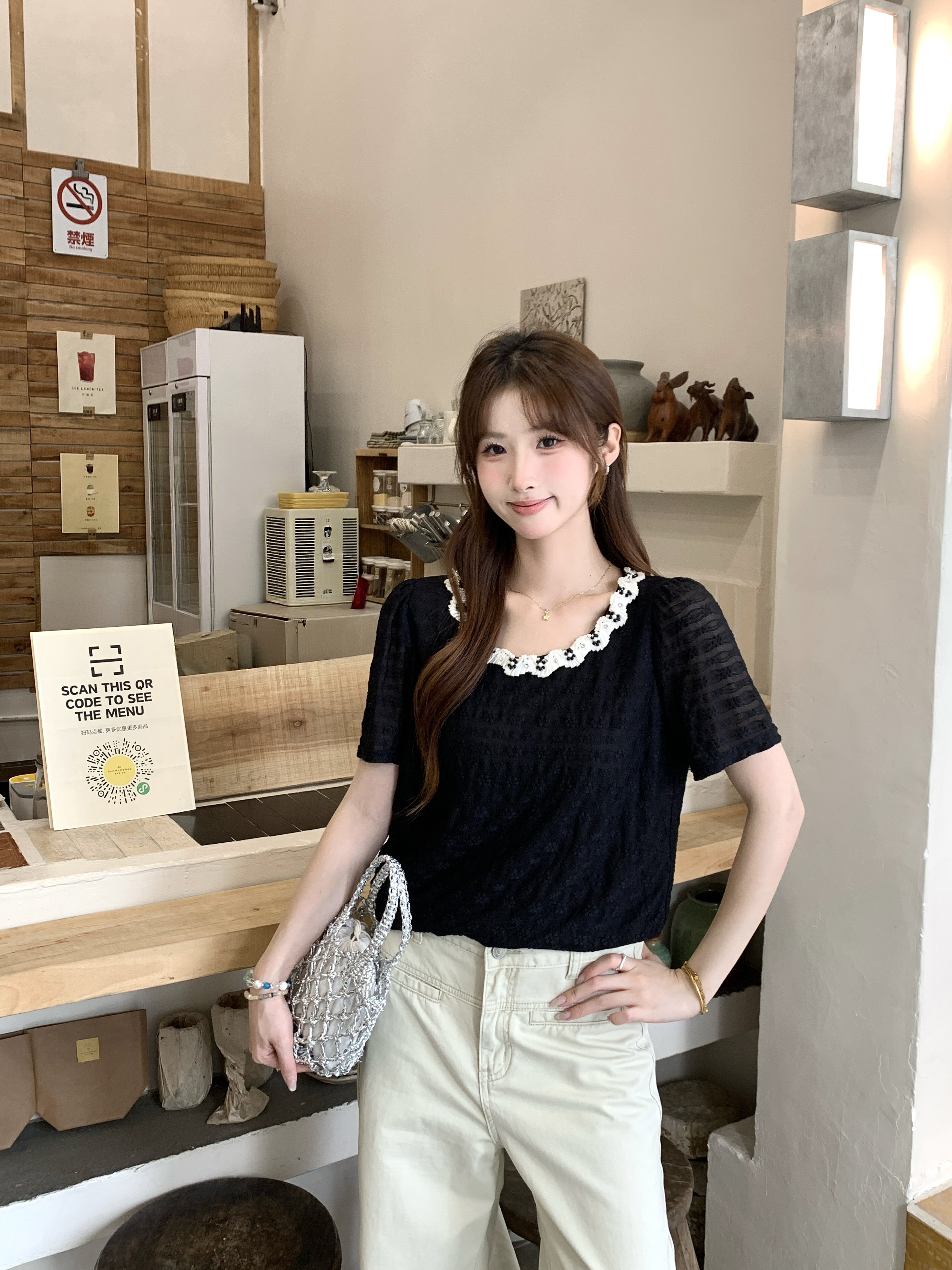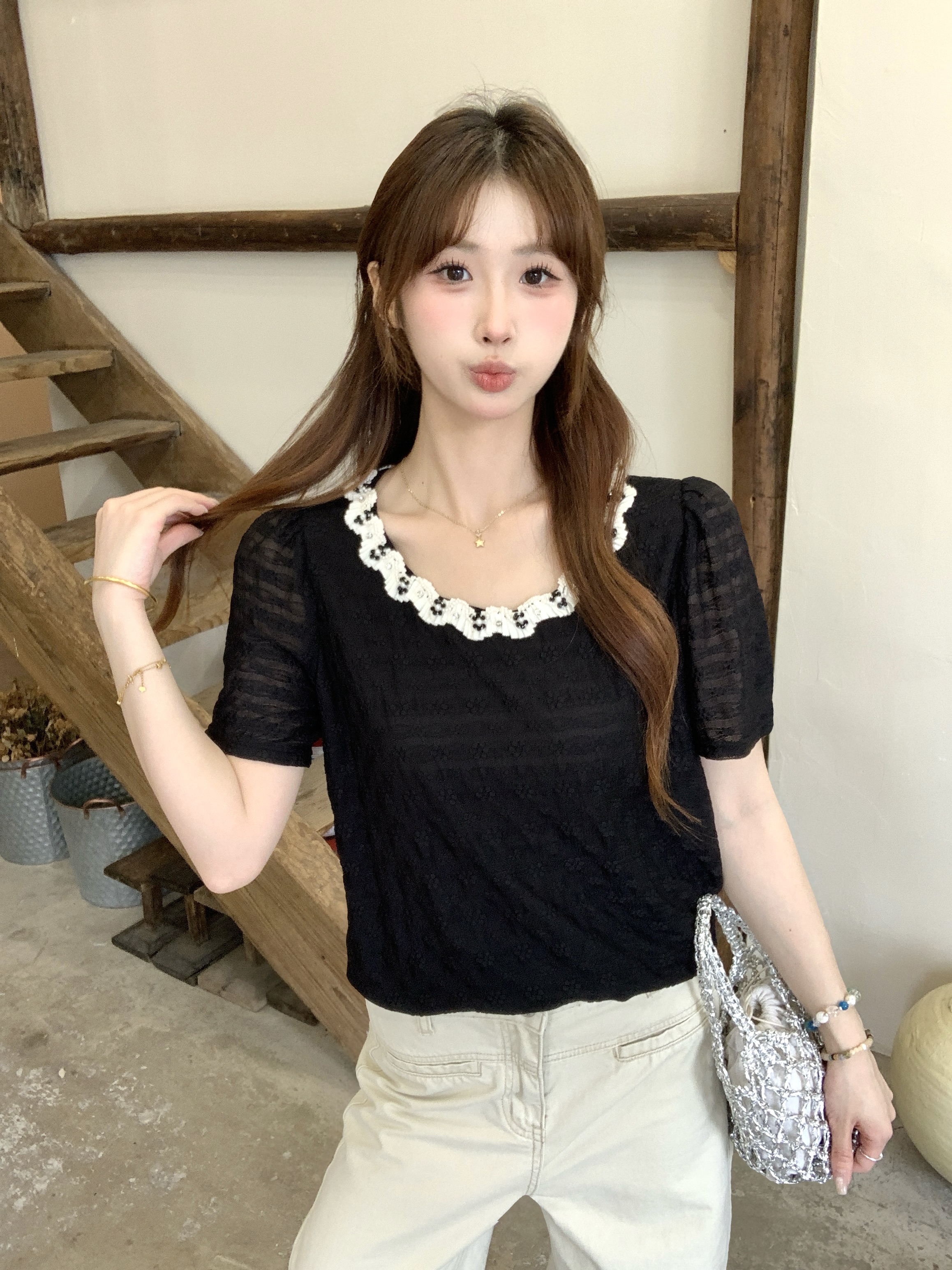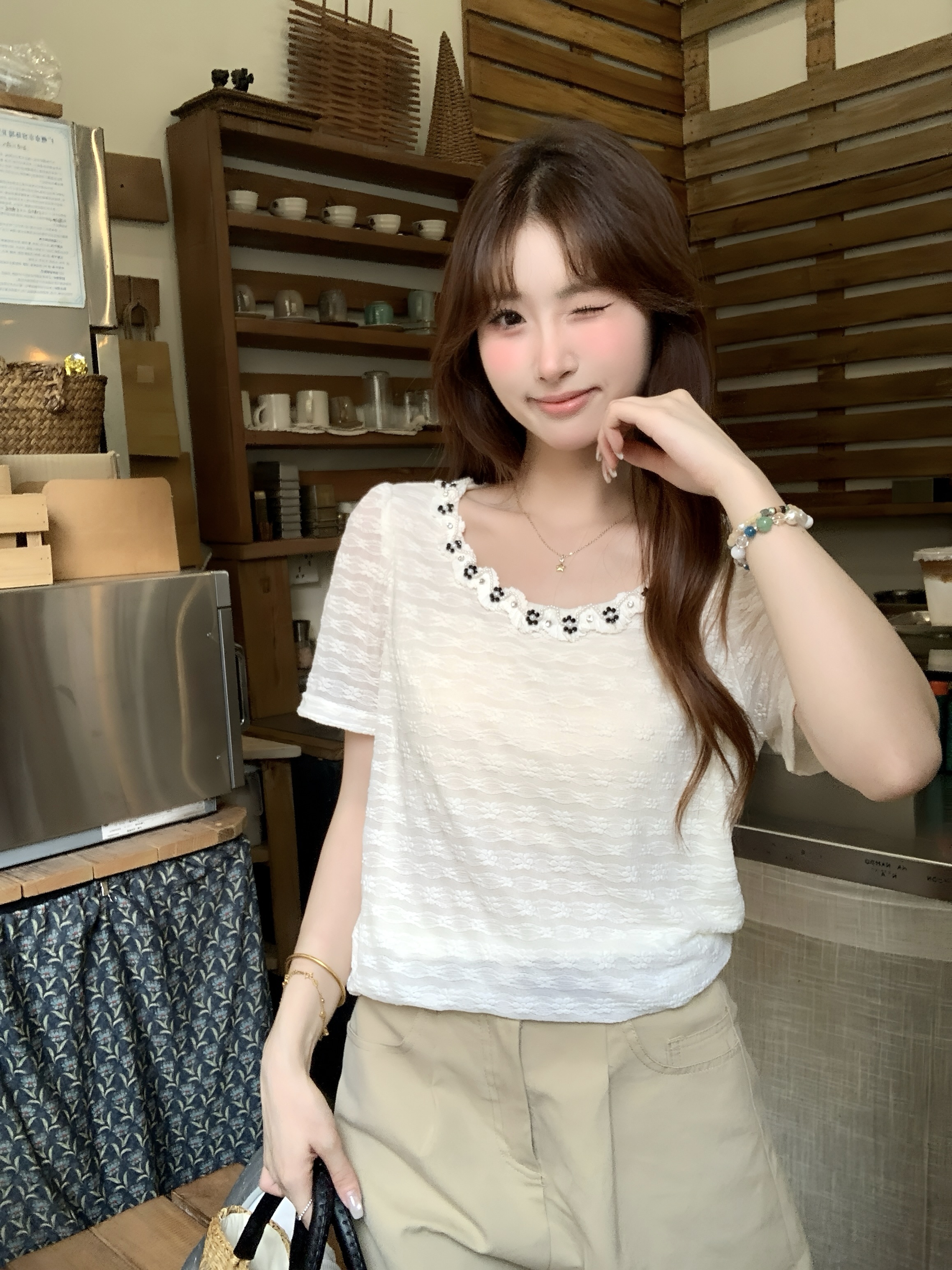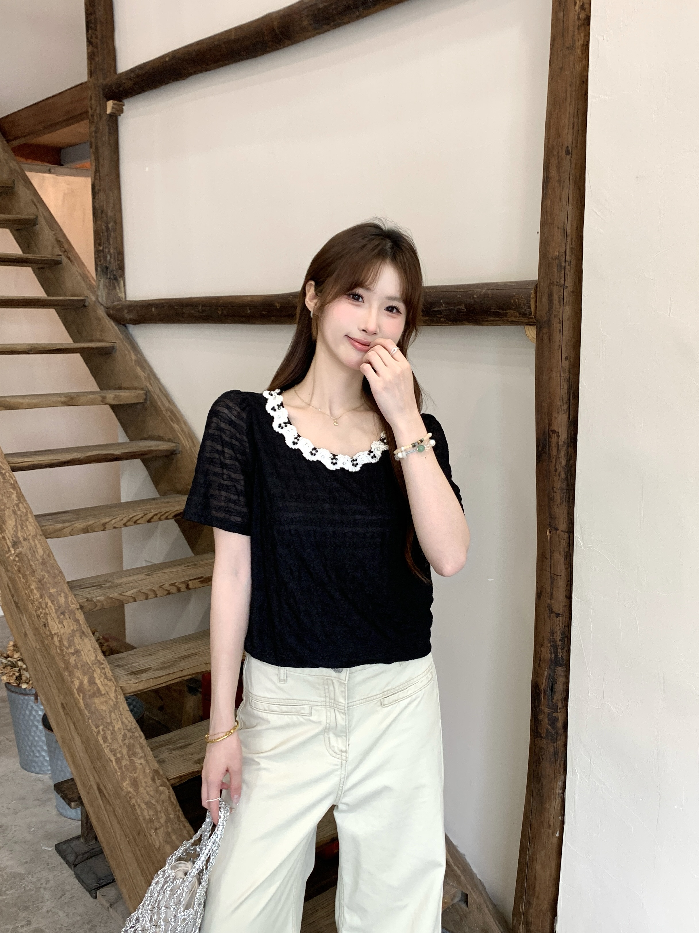 2026 조기 봄 새로운 행침 목 칼라 긴팔 레이스 조각 십자가 네클라인 기본 셔츠 몸매 가꾸기 슬림해 보이는 여성 셔츠