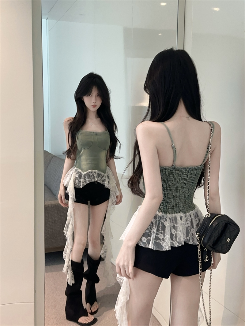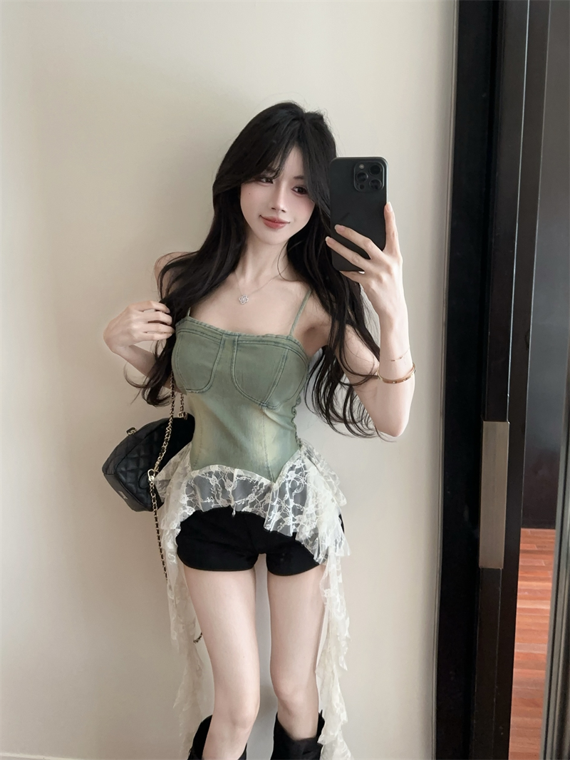 여름 보트넥 패치워크 레이스 불규칙 슬립 섹시함 허리 수축 순수한 욕망 바람 슈퍼 몸매 가꾸기 데님 조끼 슬립