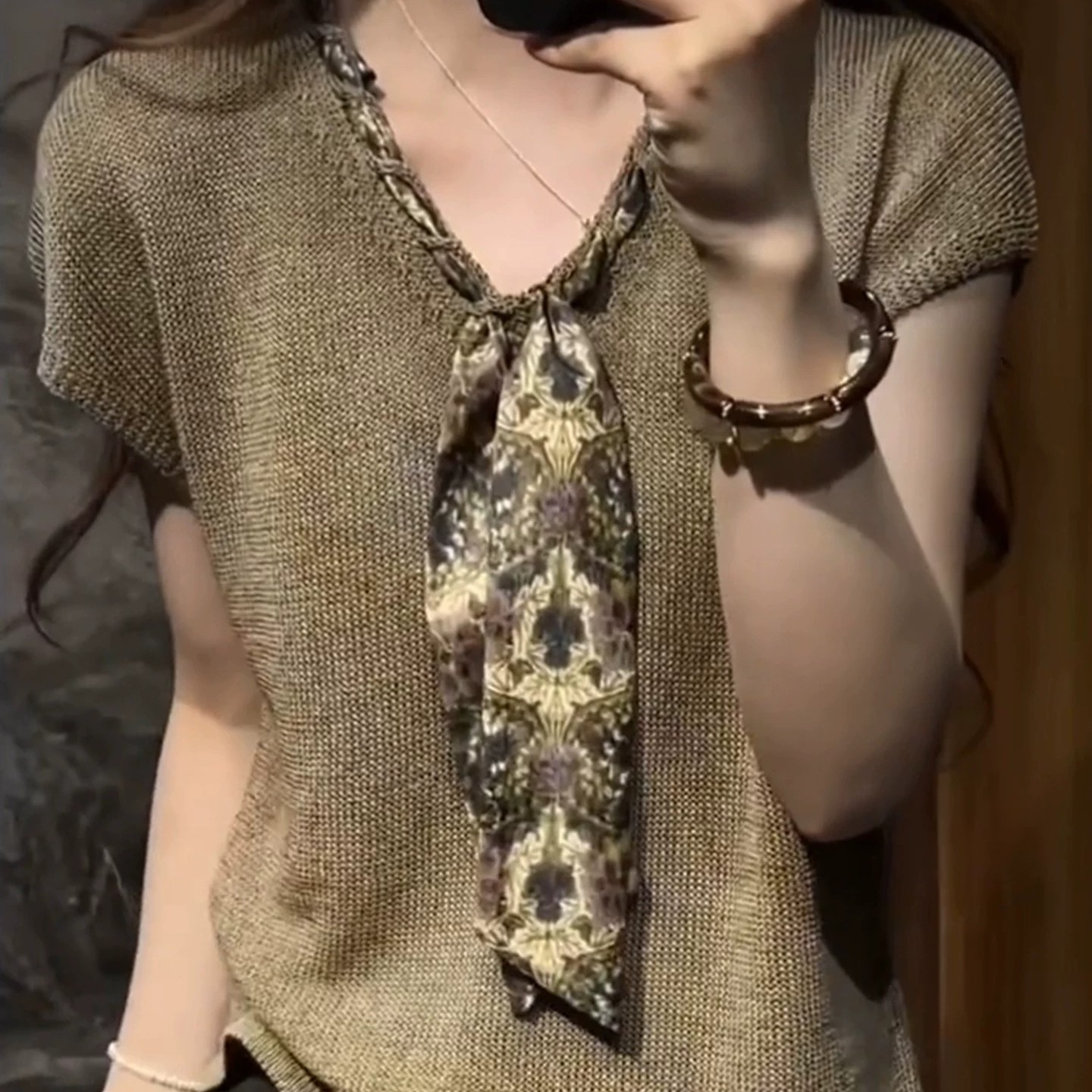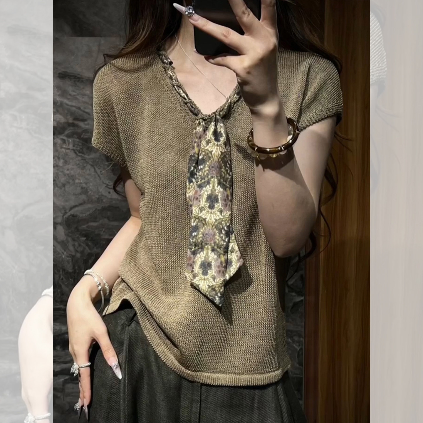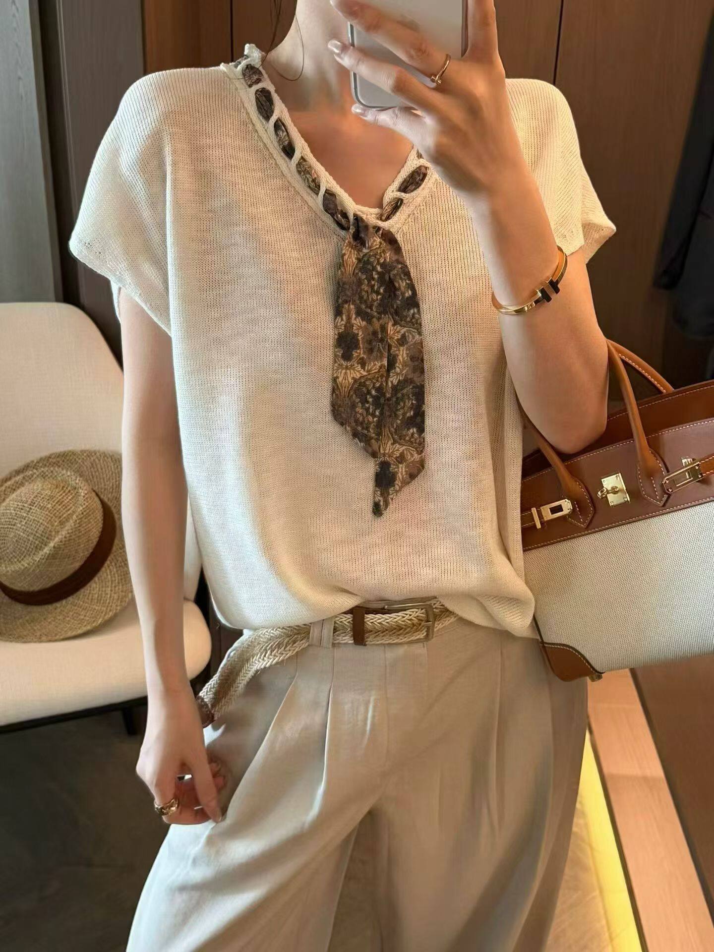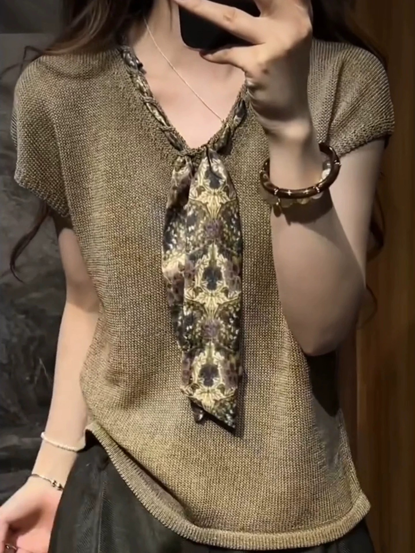 한 부서 착용 가져 가라. 낙타 스카프 V넥 니트 반팔 티셔츠 여성 여름 고급 센스 품격 긍정적 인 어깨 작은 맨위
