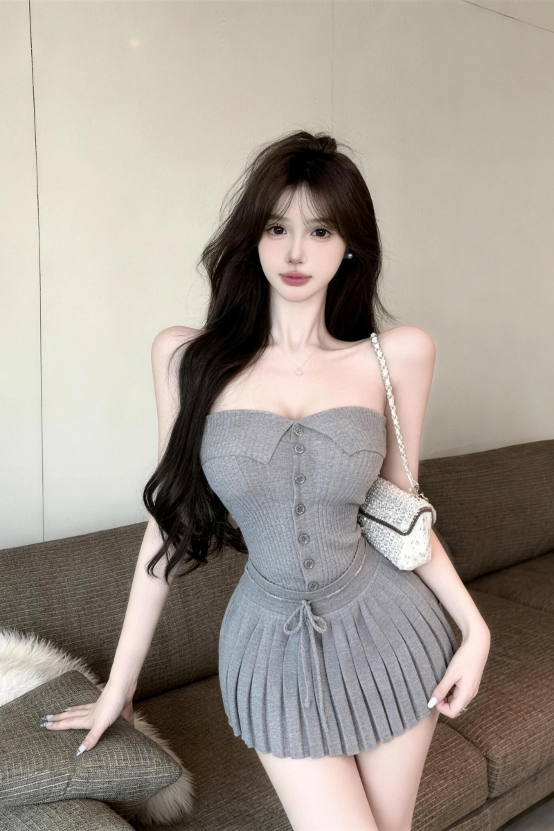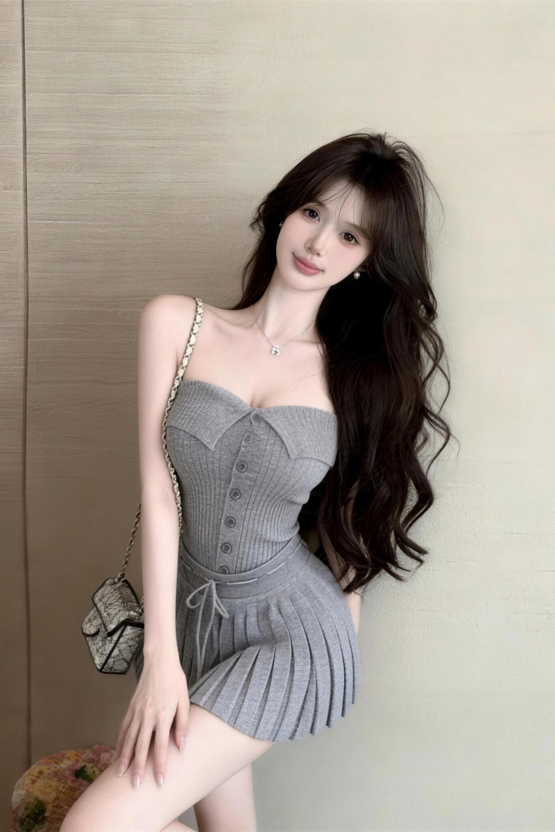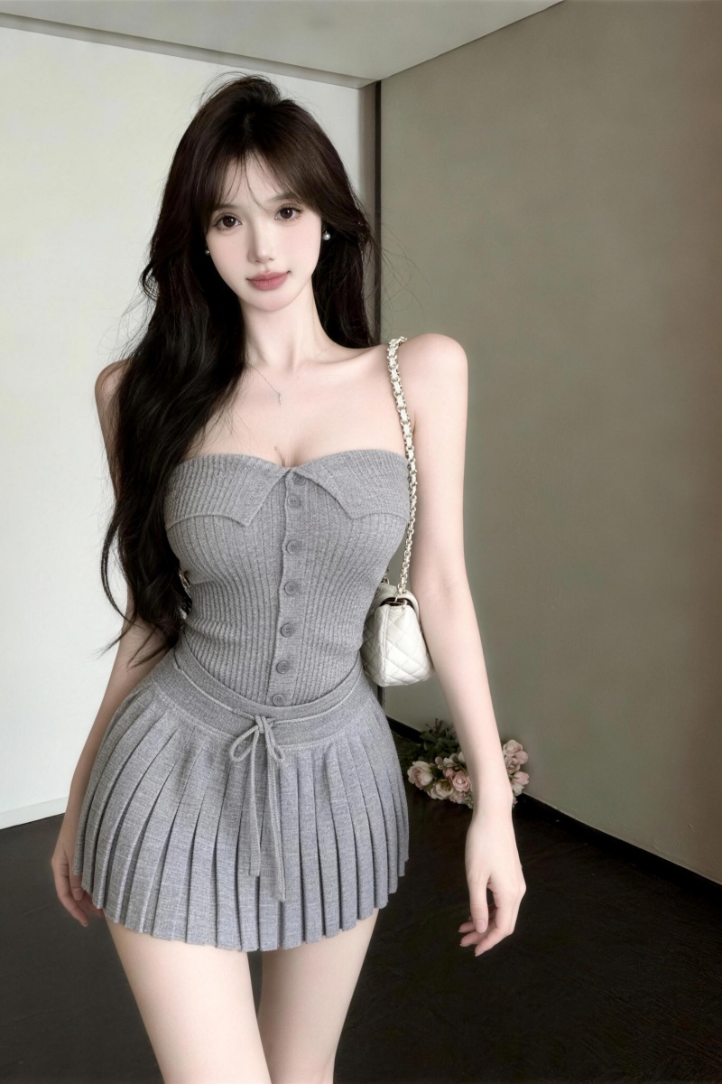 실사 정가 순수한 욕망 바람 회색 아름다움 뒤로 니트 튜브탑 조끼 플리츠 반신 스커트 투피스 세트