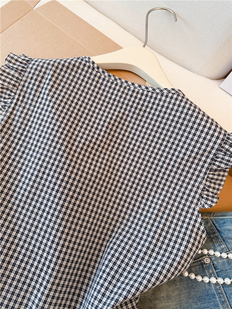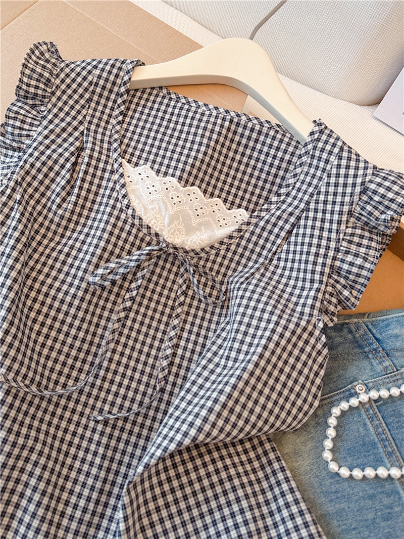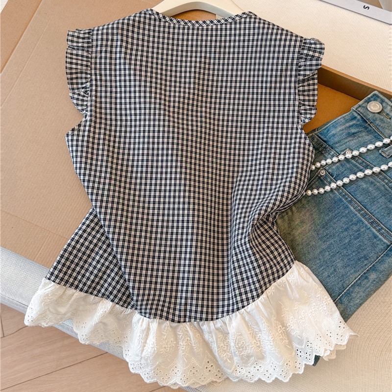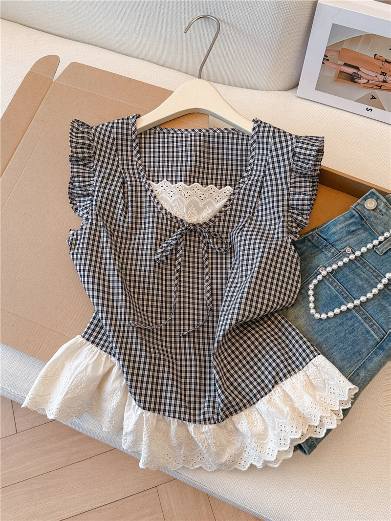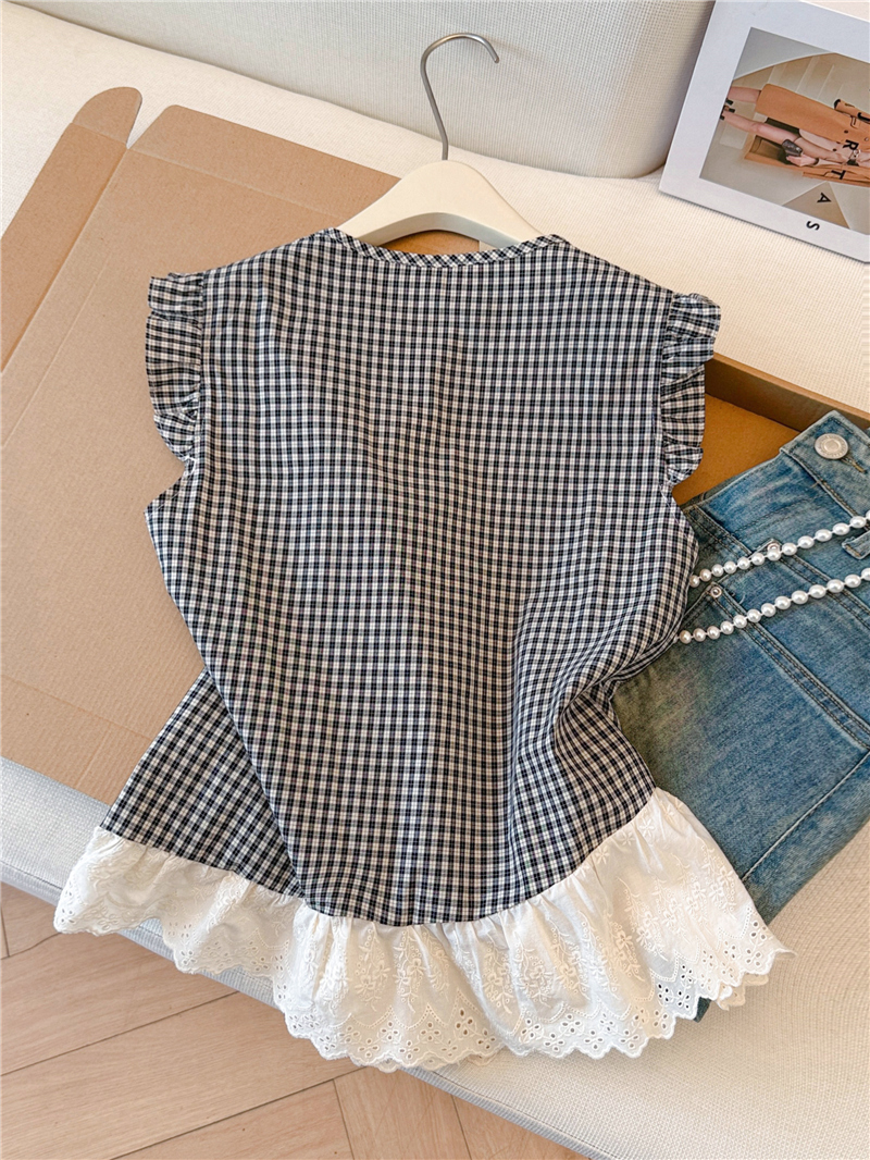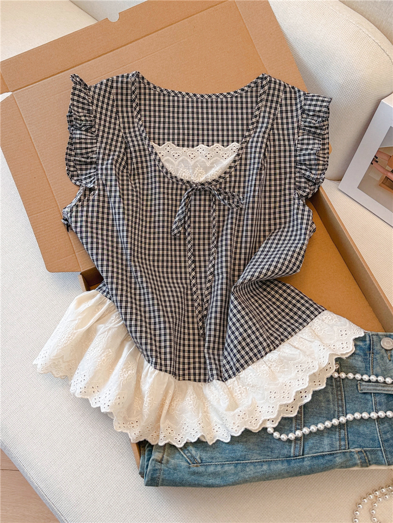 프랑스식 검정색 체크무늬 작은 날다 소매 여성 셔츠 2026 여름 새로운 레이스 조각 민소매 인형 셔츠 셔츠 맨위