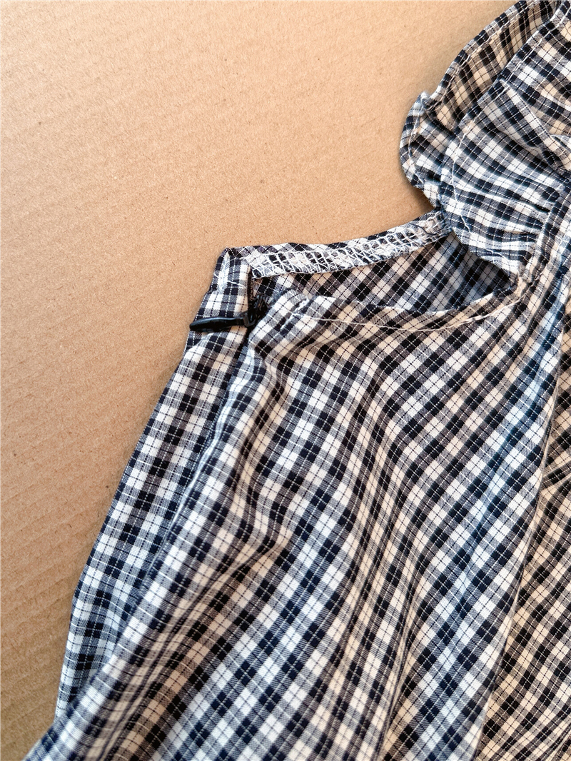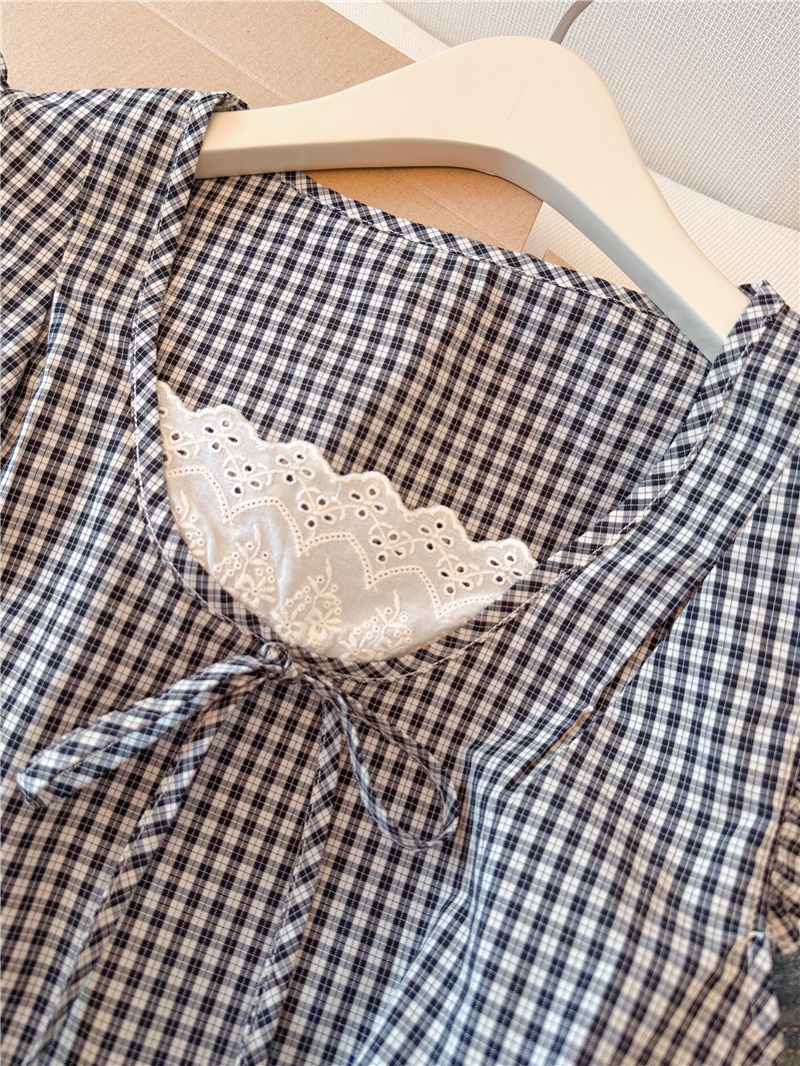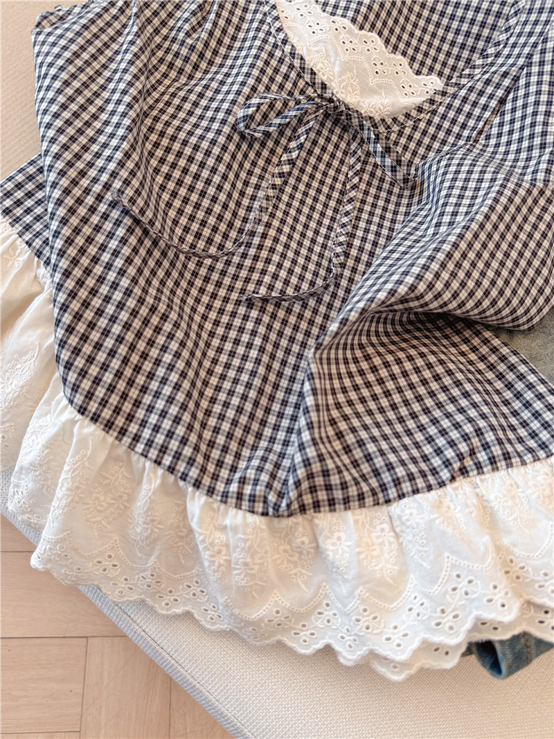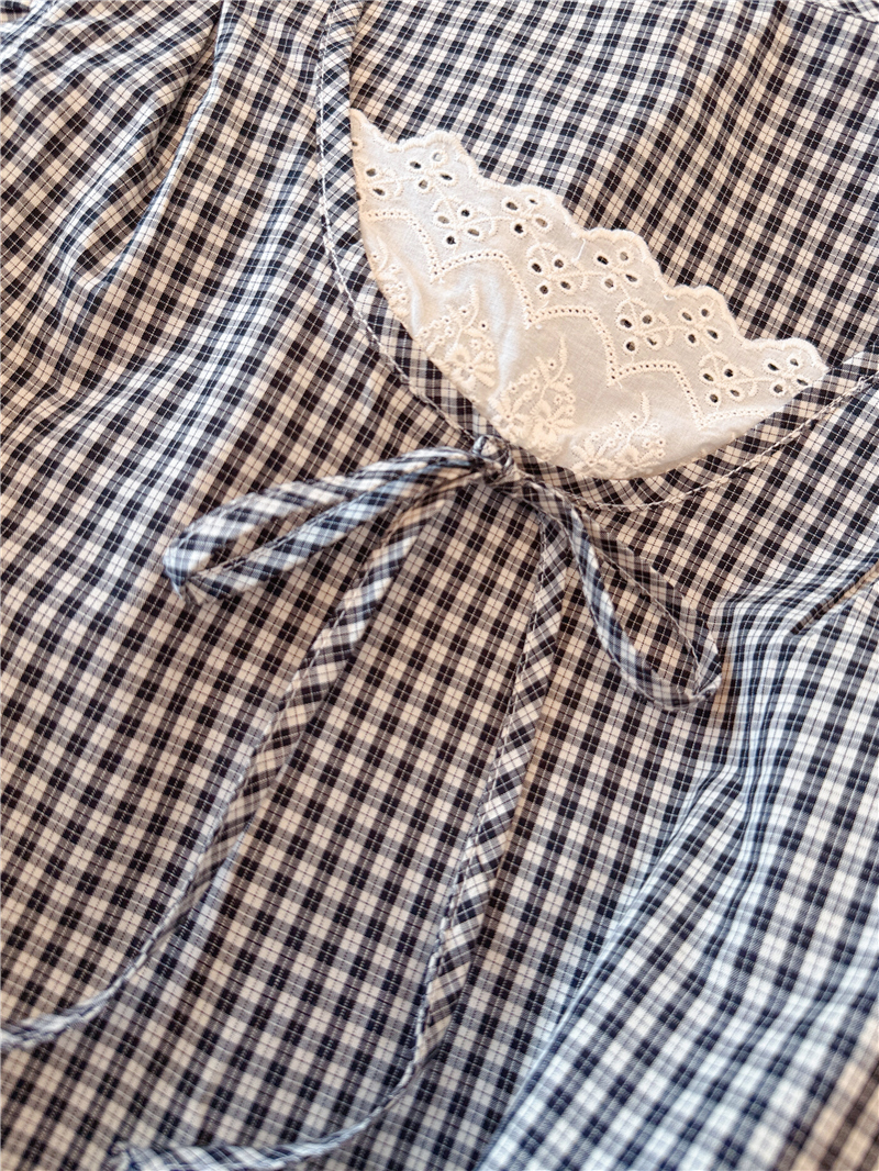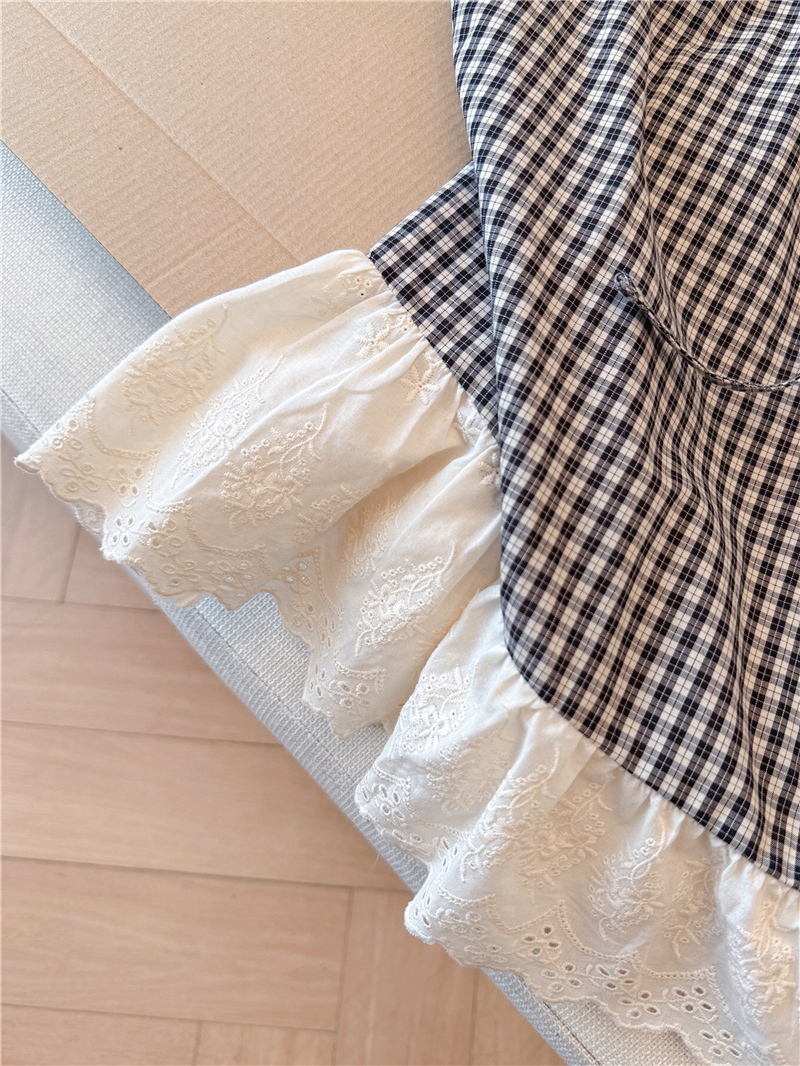 프랑스식 검정색 체크무늬 작은 날다 소매 여성 셔츠 2026 여름 새로운 레이스 조각 민소매 인형 셔츠 셔츠 맨위