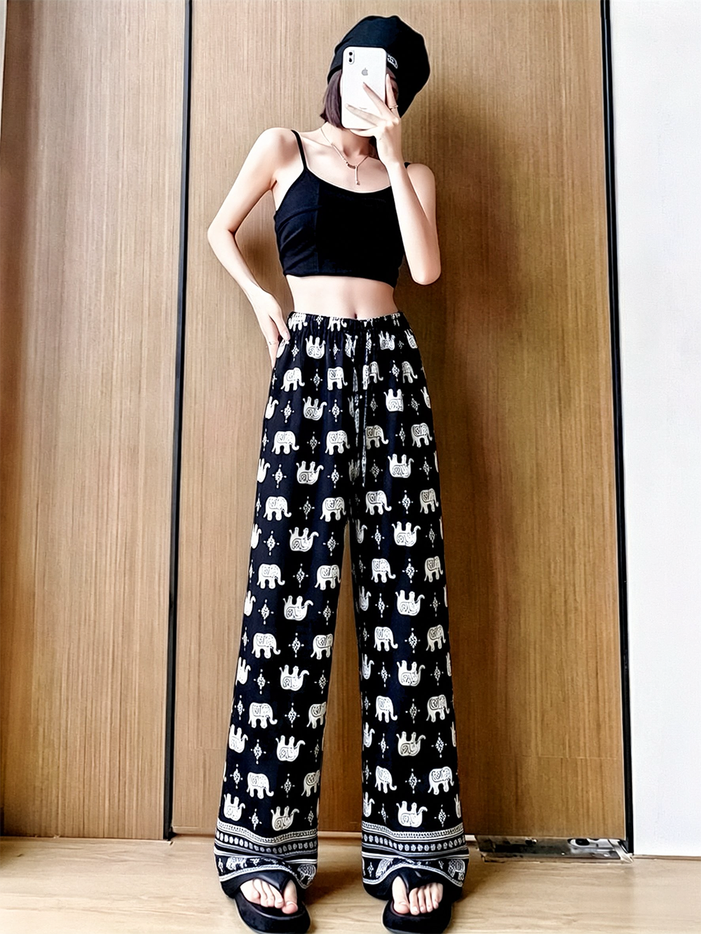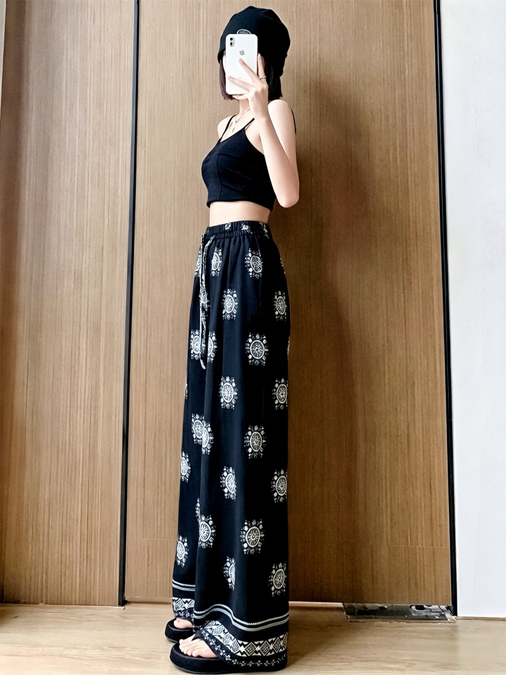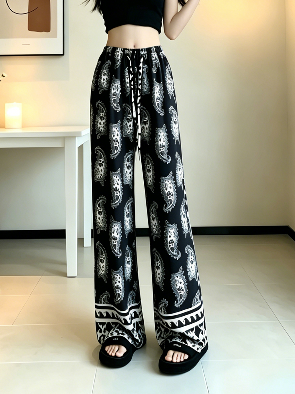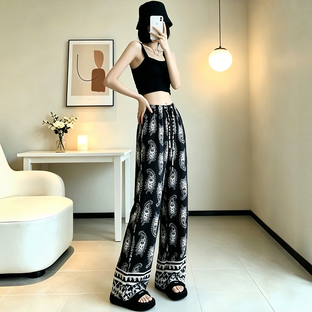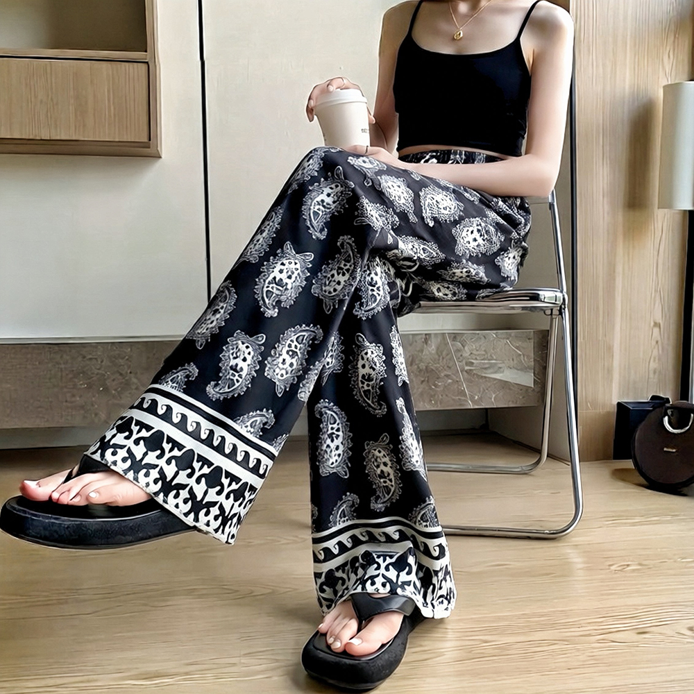 일본과 한국 트렌드 와이드 레그 팬츠 보헤미안 면 실크 루즈핏 캐주얼 바지 여성 자외선 차단 슬림해 보이는 프린트 롱 바지