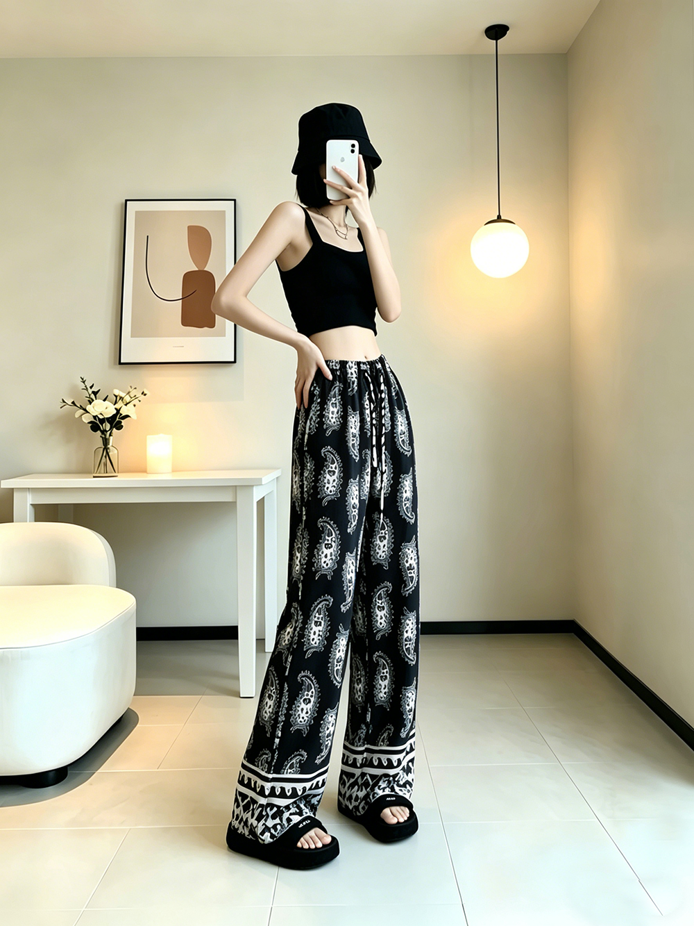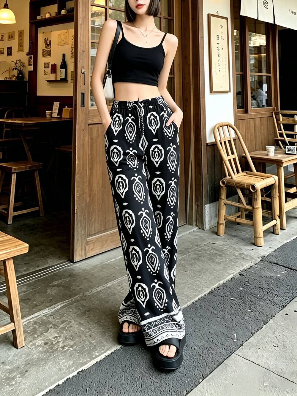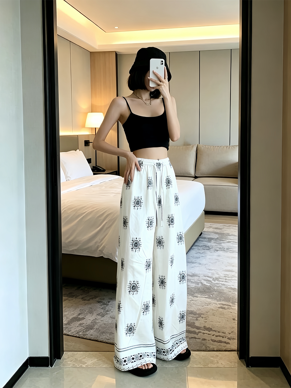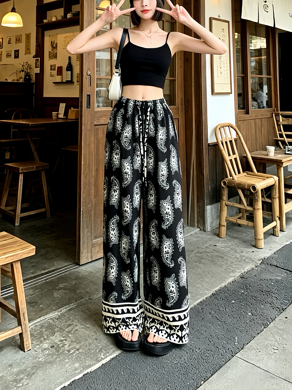 일본과 한국 트렌드 와이드 레그 팬츠 보헤미안 면 실크 루즈핏 캐주얼 바지 여성 자외선 차단 슬림해 보이는 프린트 롱 바지