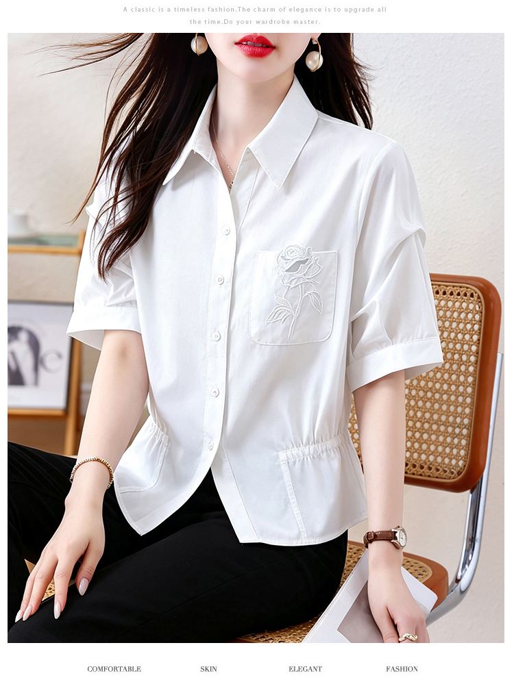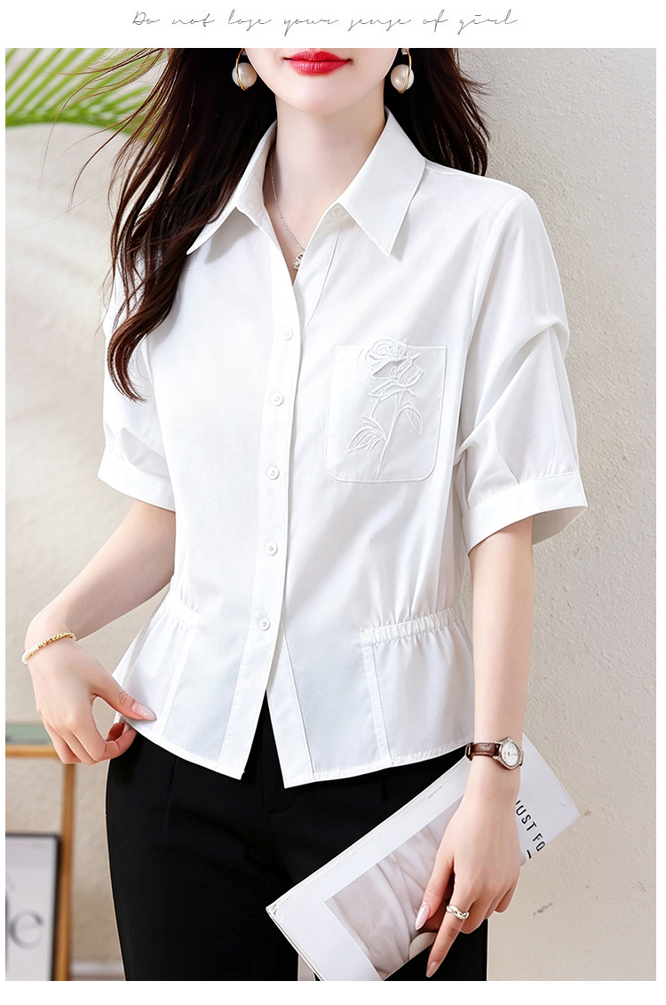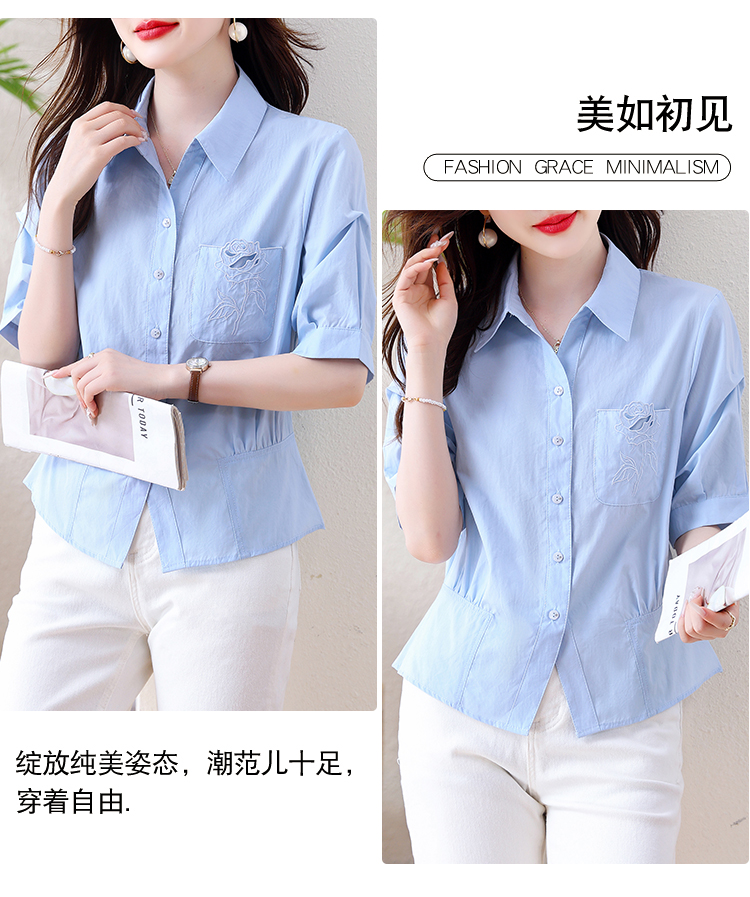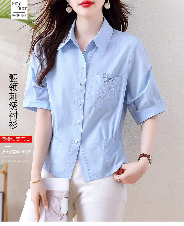 면 100% 자수 폴로 칼라 반팔 여성 셔츠 허리 수축 슬림해 보이는 맨위 여름 새로운 빛 요리 한 디자인 센스 미니멀리즘 출퇴근