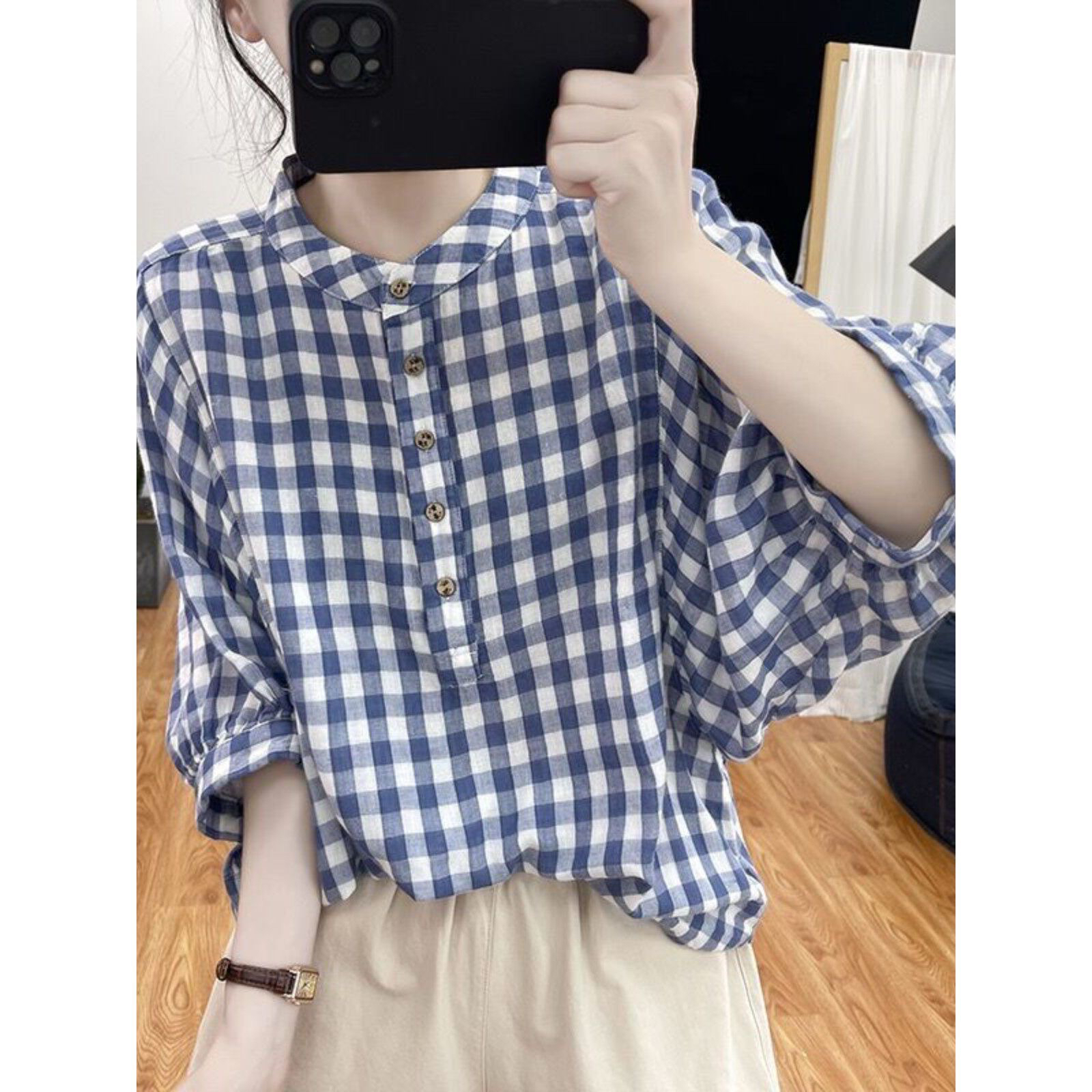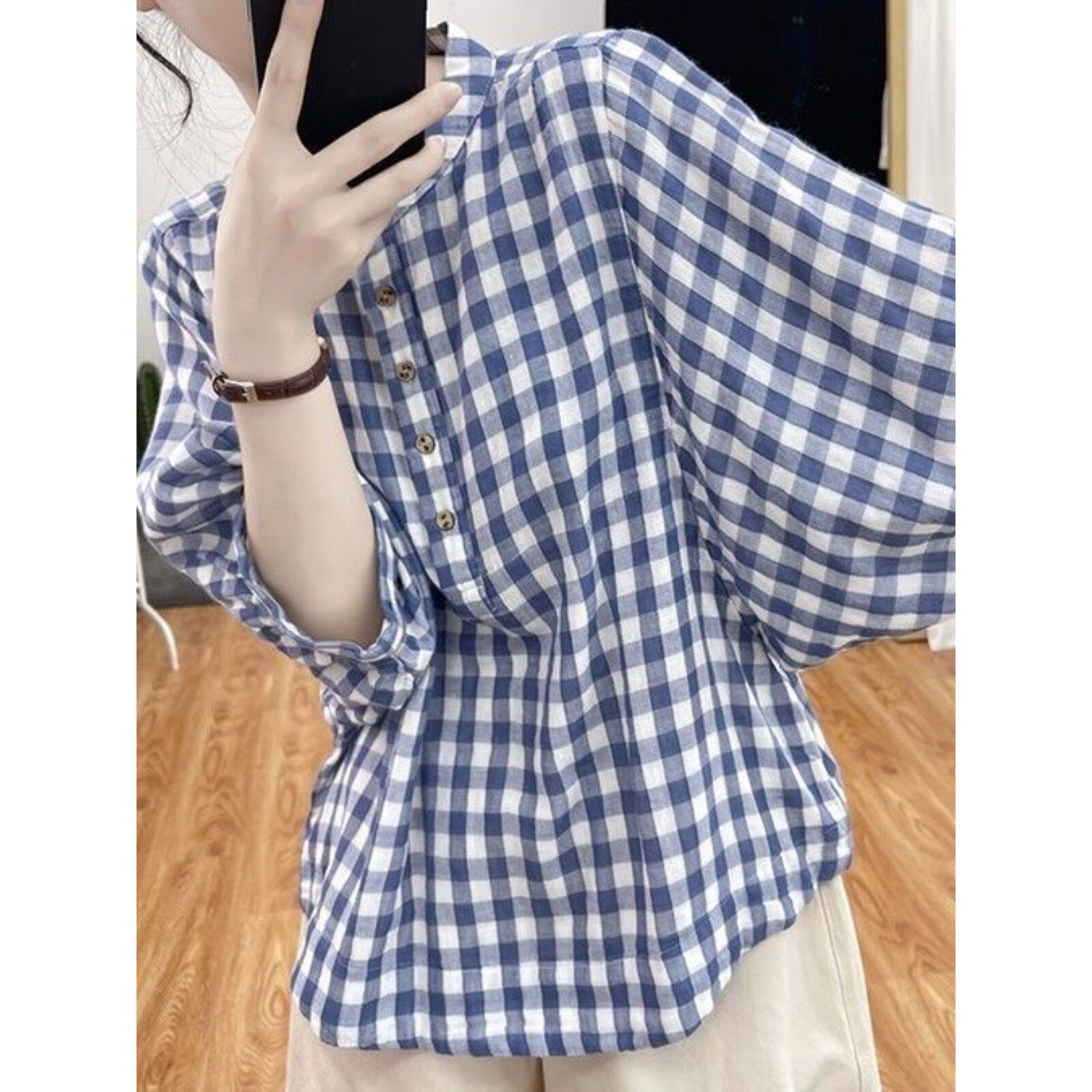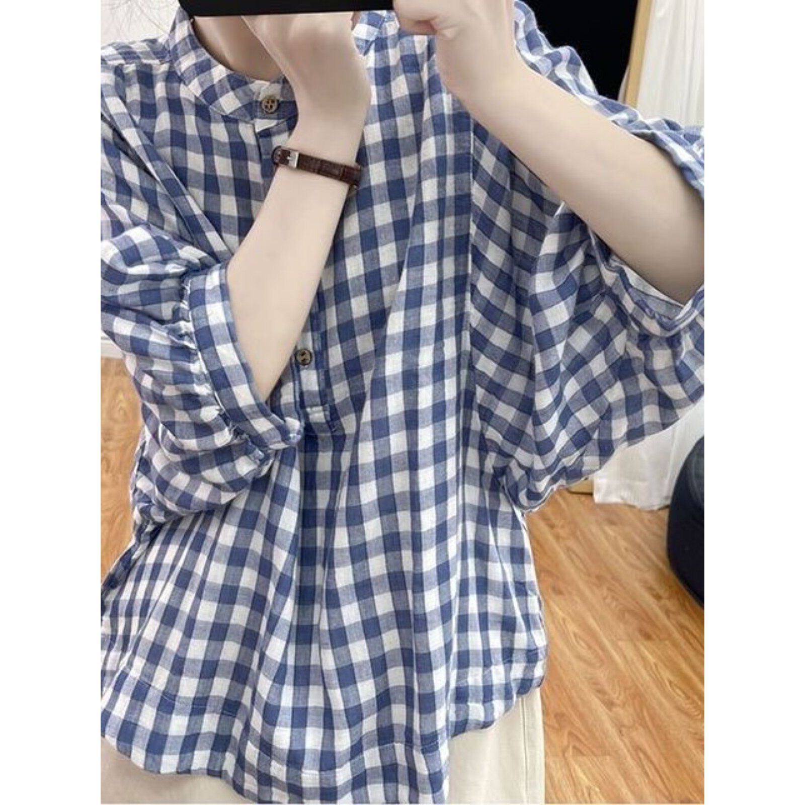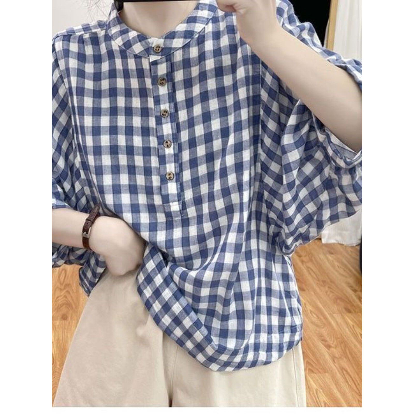 여름 얇은 스타일 면 린넨 체크무늬 맨위 여성 배트윙 소매 블루 화이트 작은 격자 셔츠 루즈핏 연령 감소