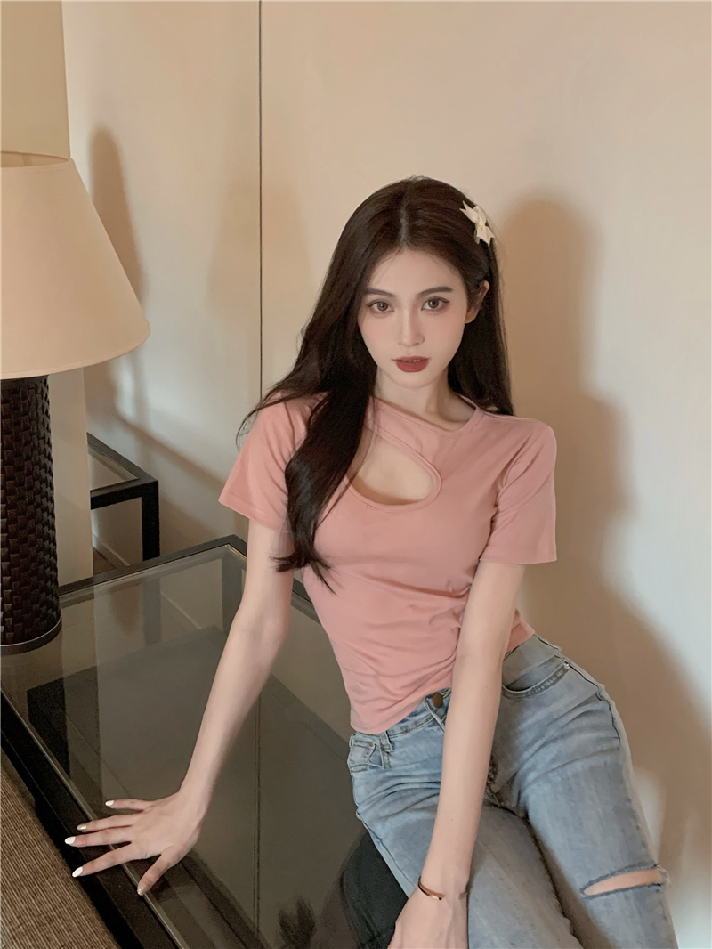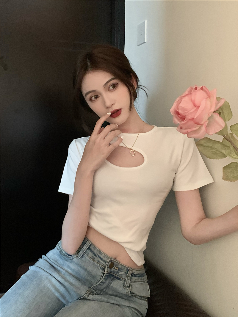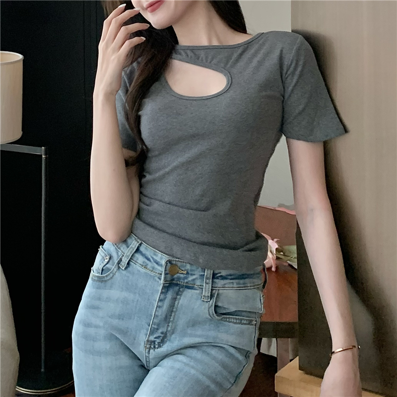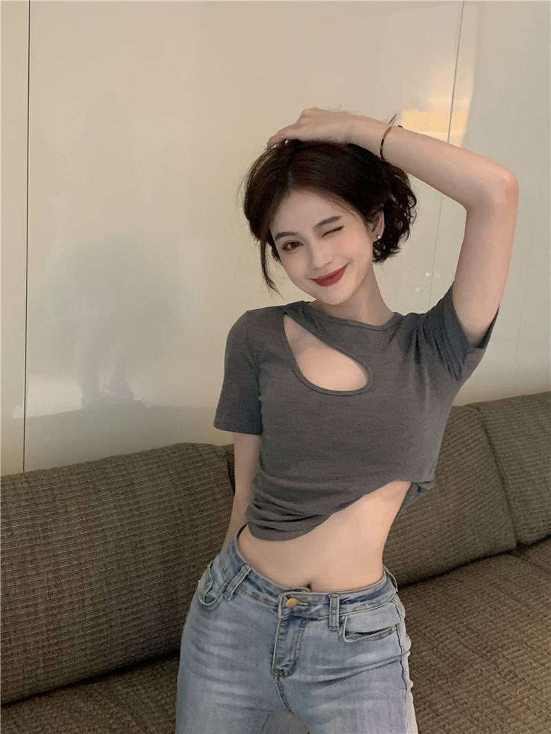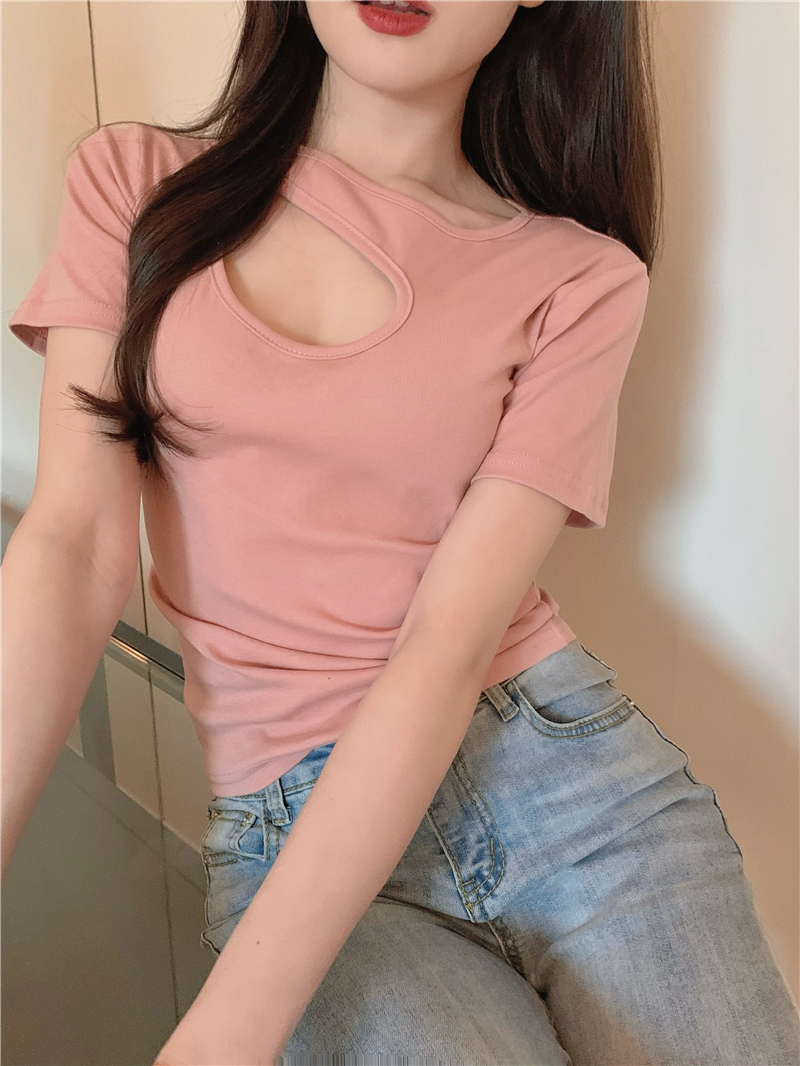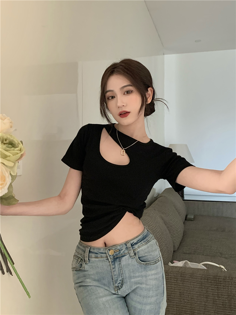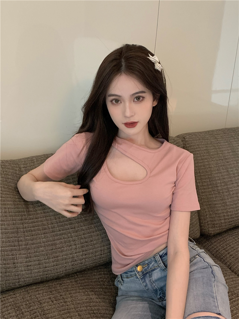 실사 정가 홀로우 아웃 섹시함 이슬 쇄골 반팔 심장 기계 몸매 가꾸기 슬림해 보이는 티셔츠 맨위