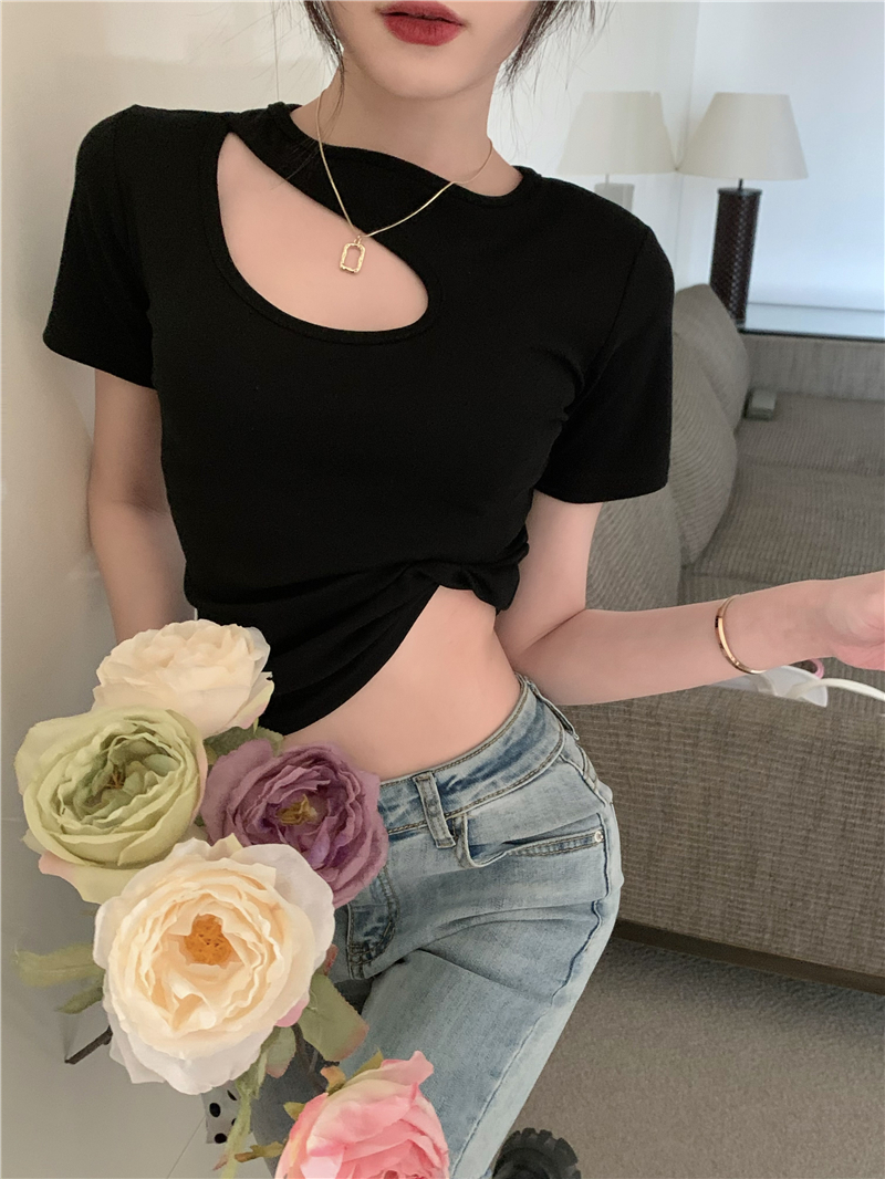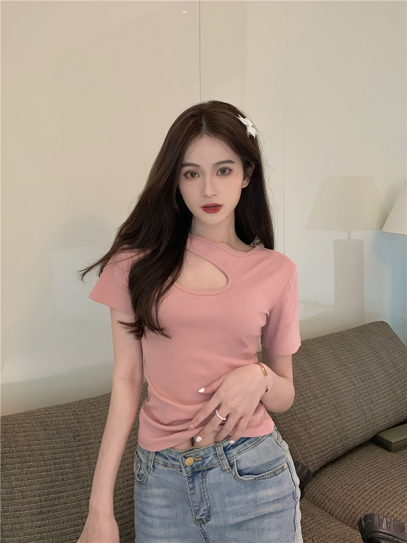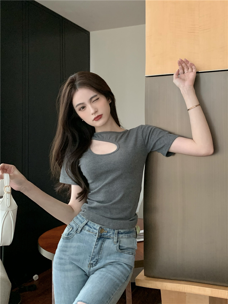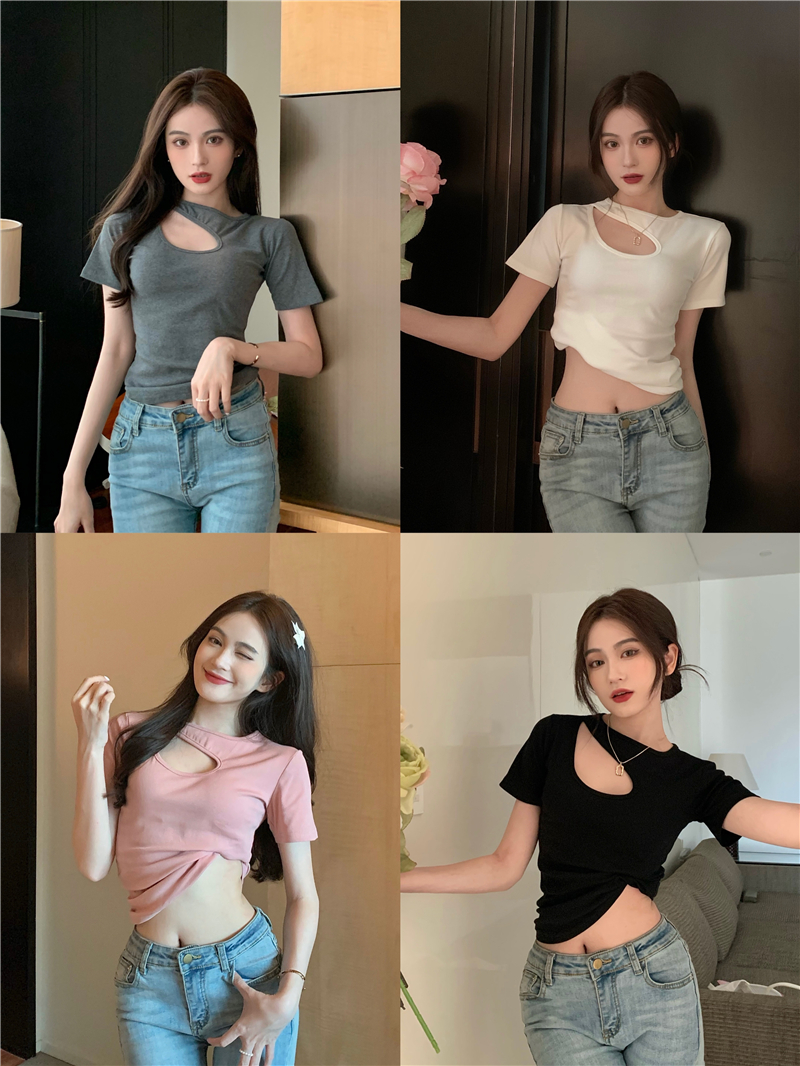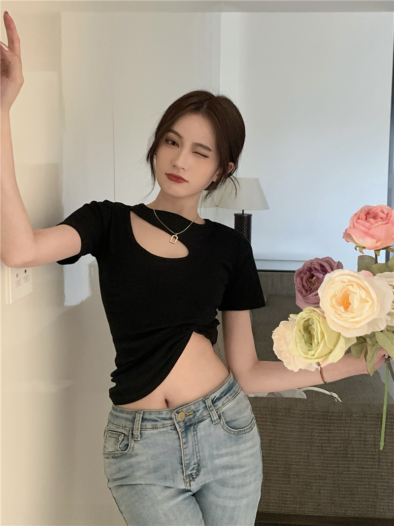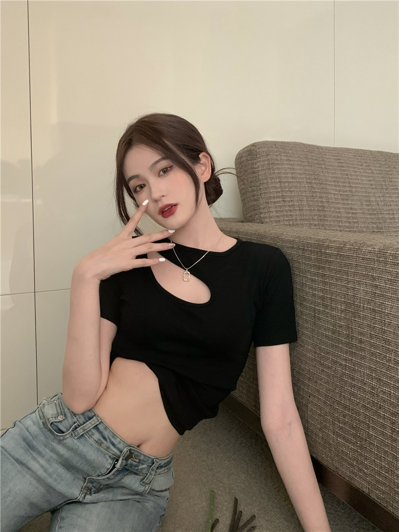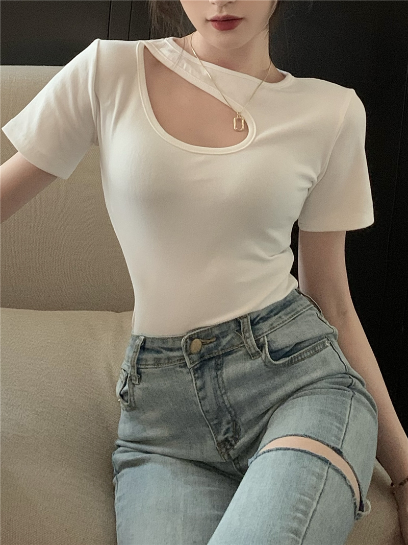 실사 정가 홀로우 아웃 섹시함 이슬 쇄골 반팔 심장 기계 몸매 가꾸기 슬림해 보이는 티셔츠 맨위