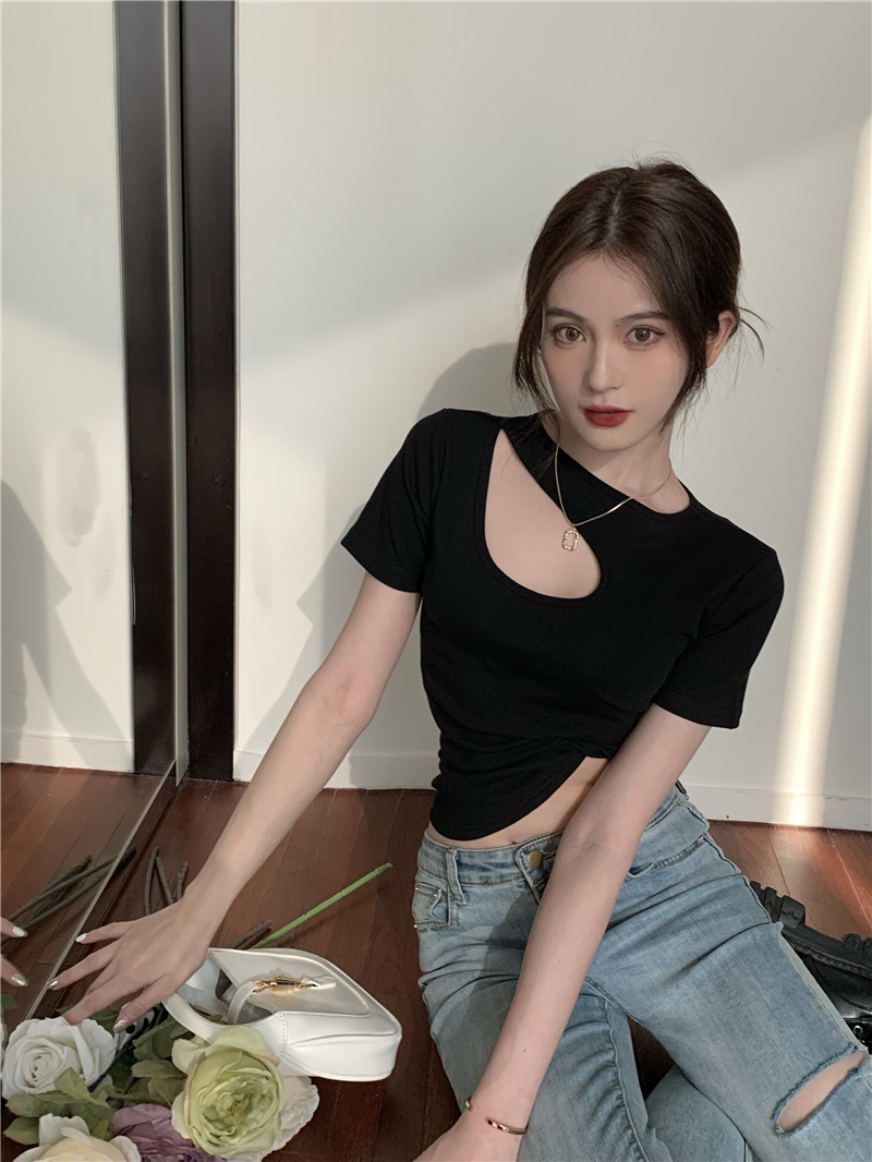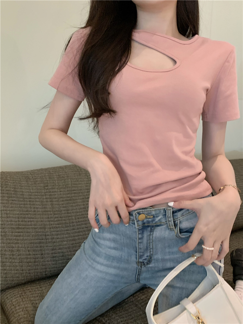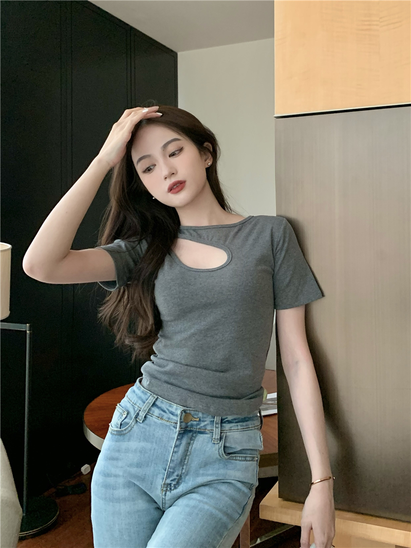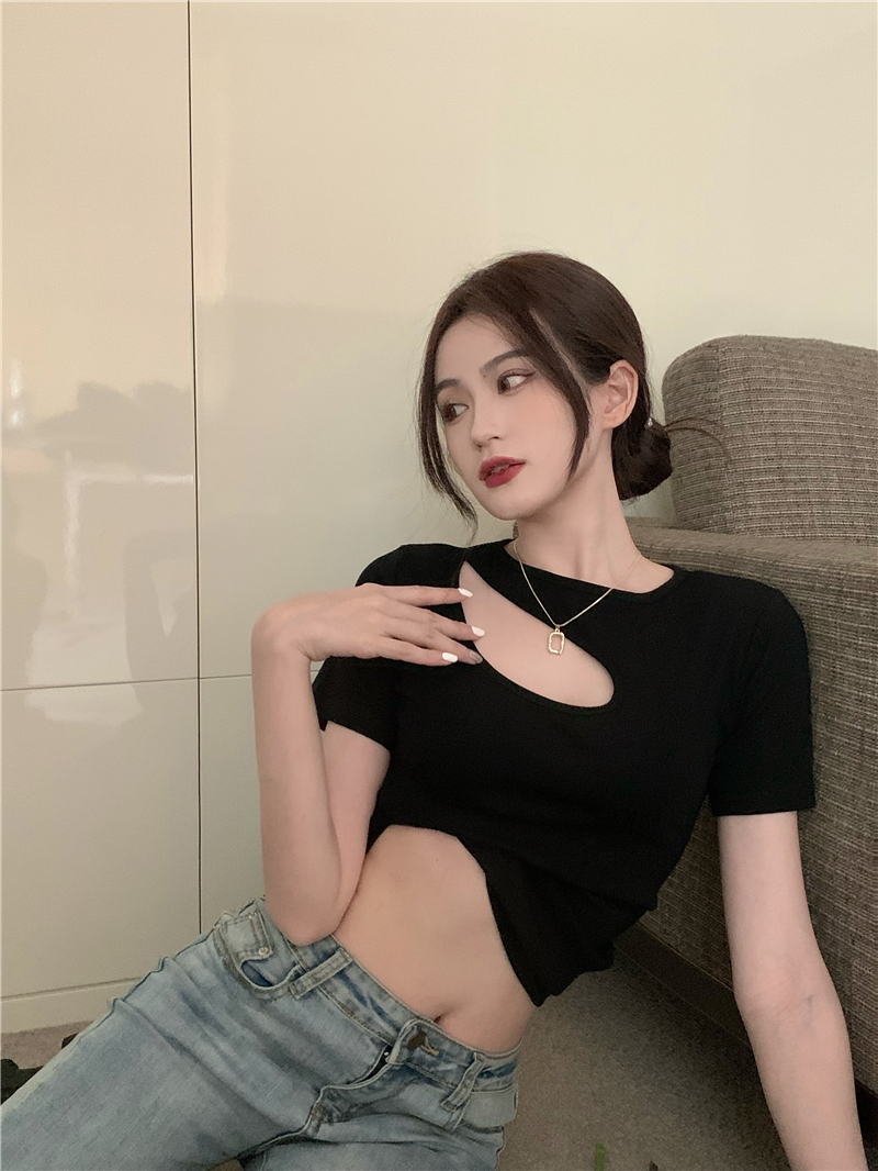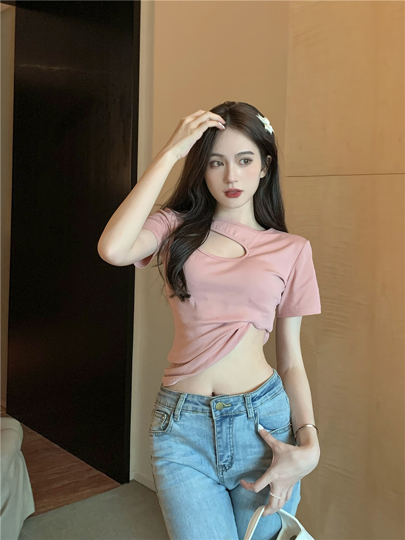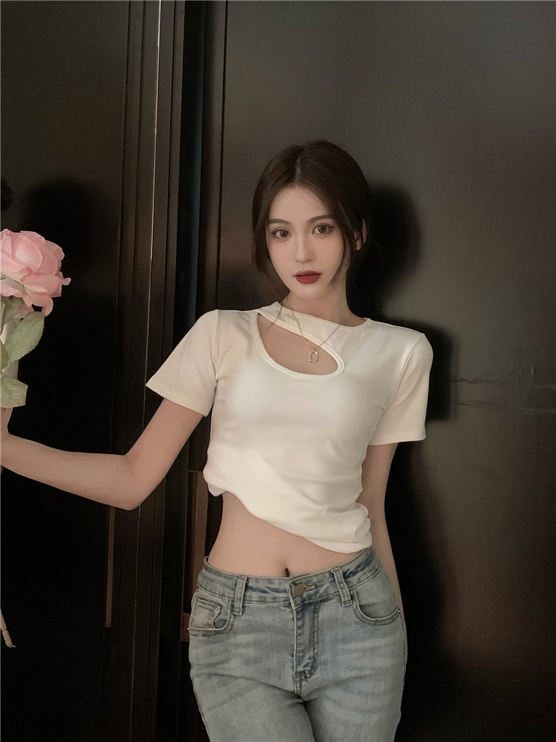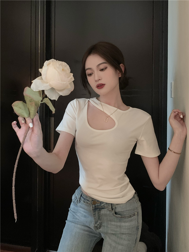 실사 정가 홀로우 아웃 섹시함 이슬 쇄골 반팔 심장 기계 몸매 가꾸기 슬림해 보이는 티셔츠 맨위