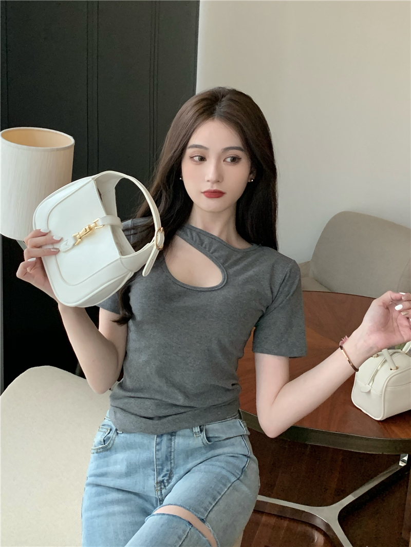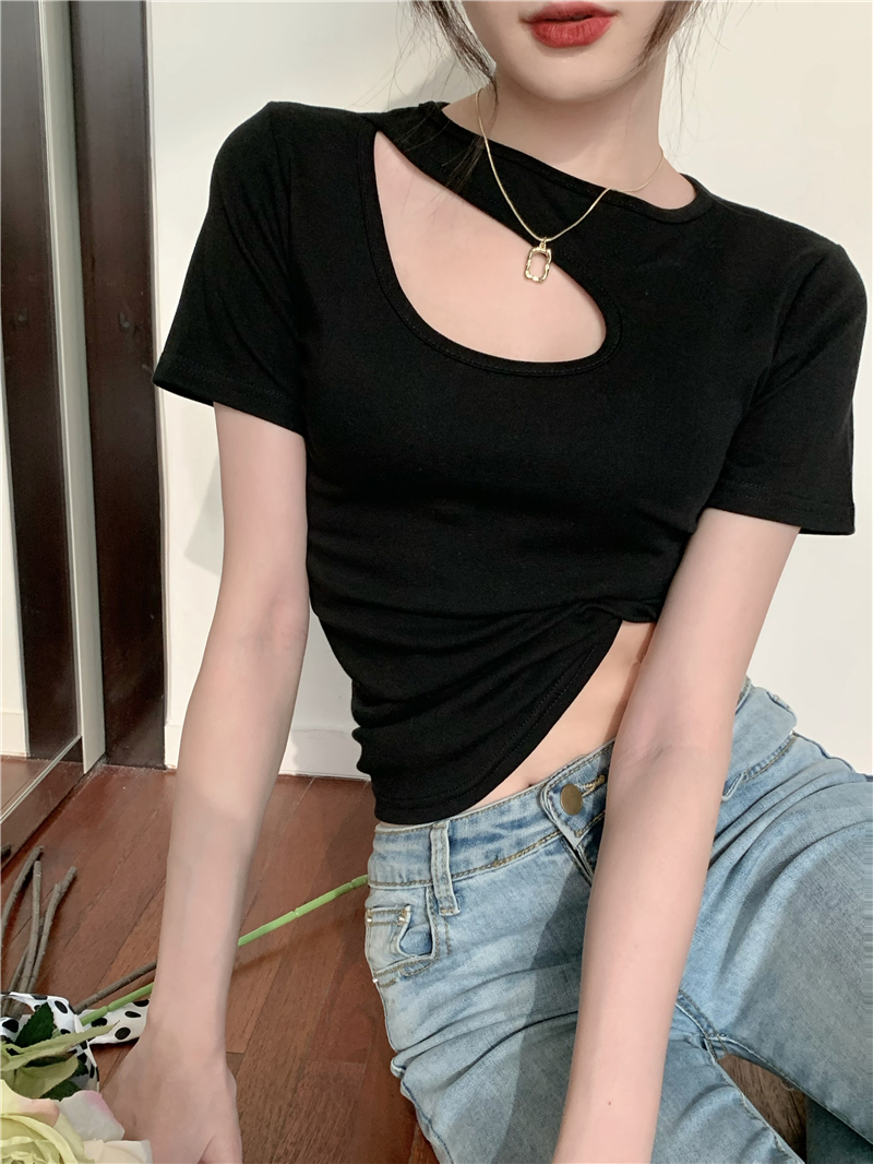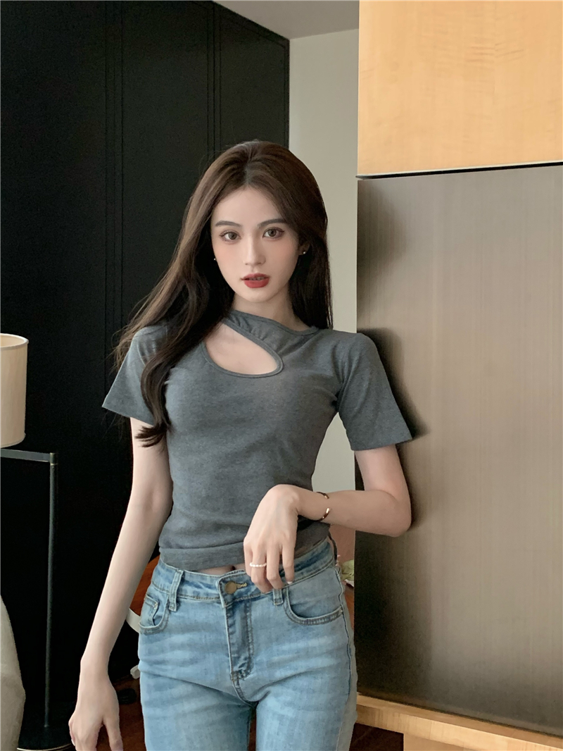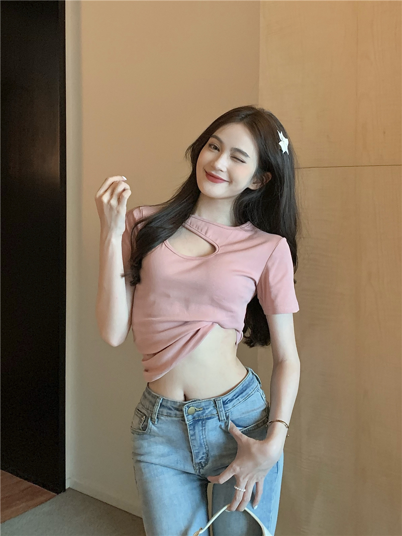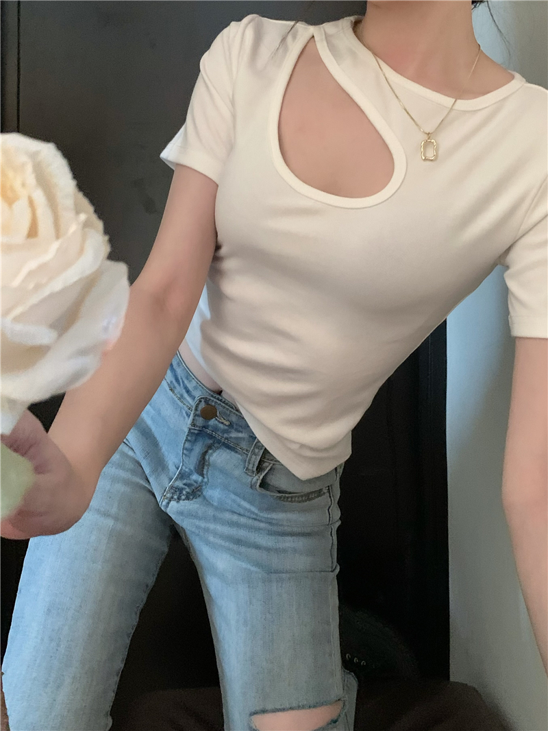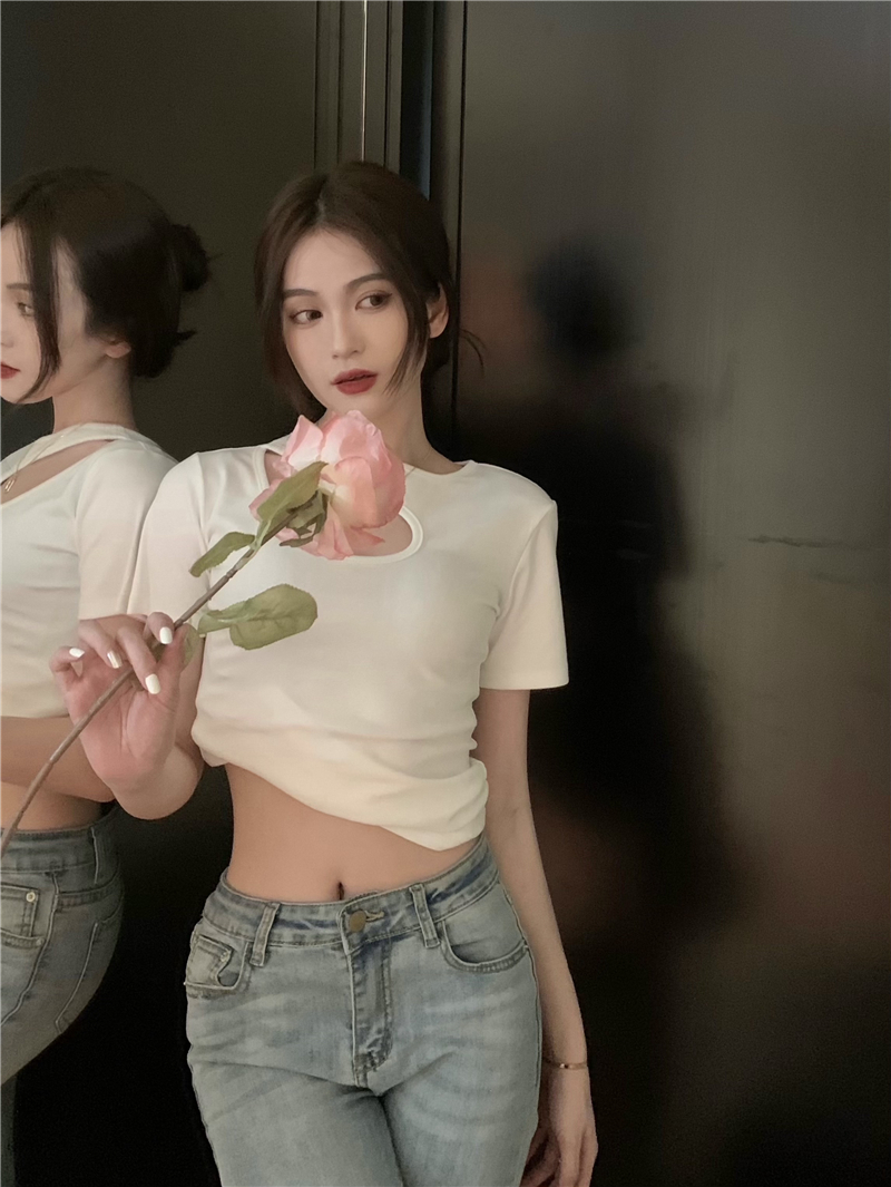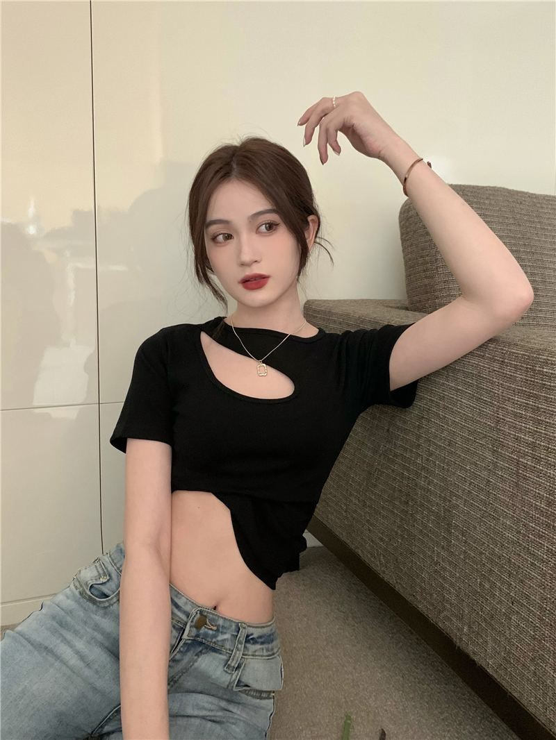 실사 정가 홀로우 아웃 섹시함 이슬 쇄골 반팔 심장 기계 몸매 가꾸기 슬림해 보이는 티셔츠 맨위