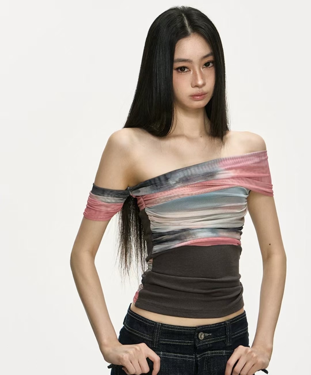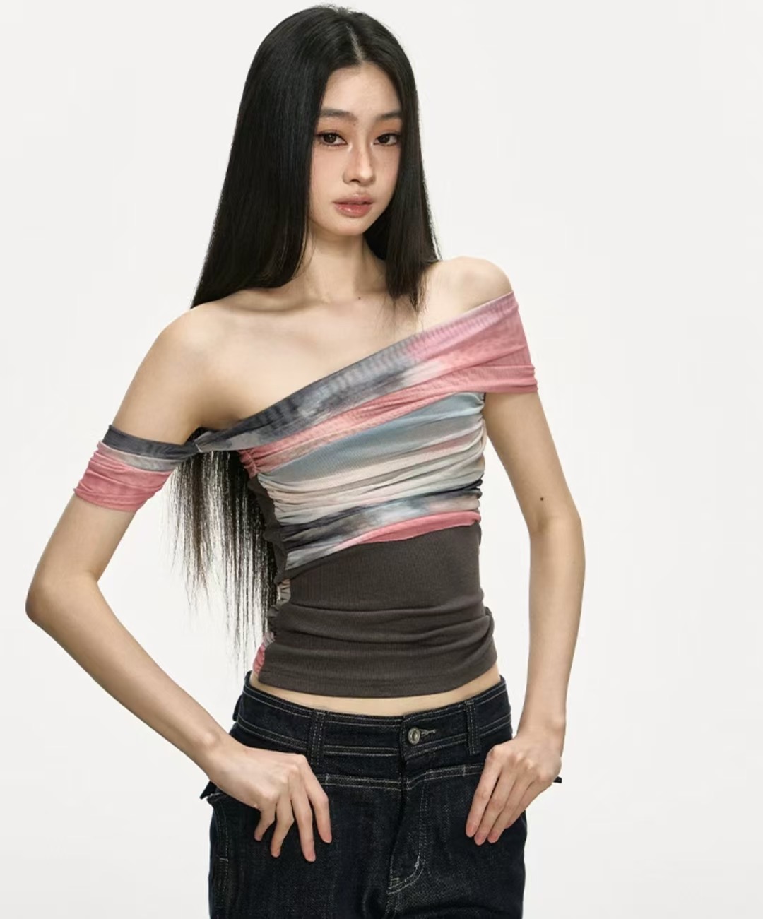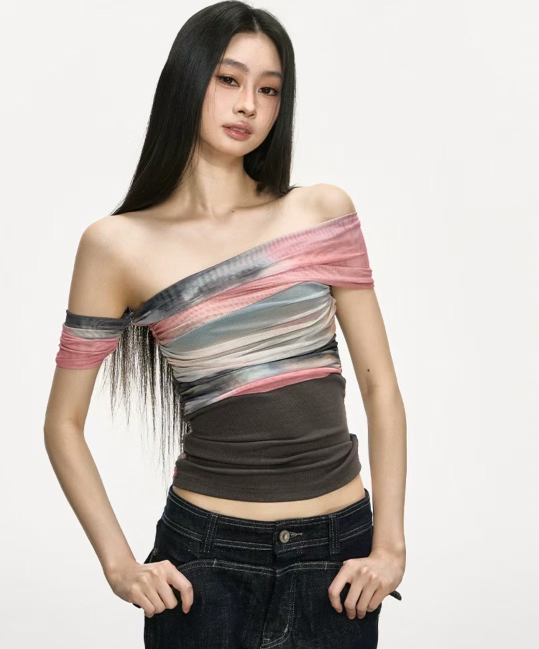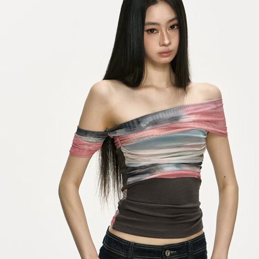 아름다운 헤일로 염색 망사 패치워크 오프숄더 맨위 여성 2026 새로운 여름 고급 센스 주름 허리 수축 티셔츠