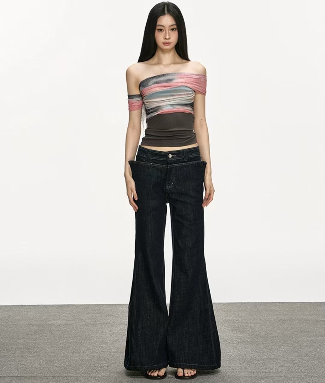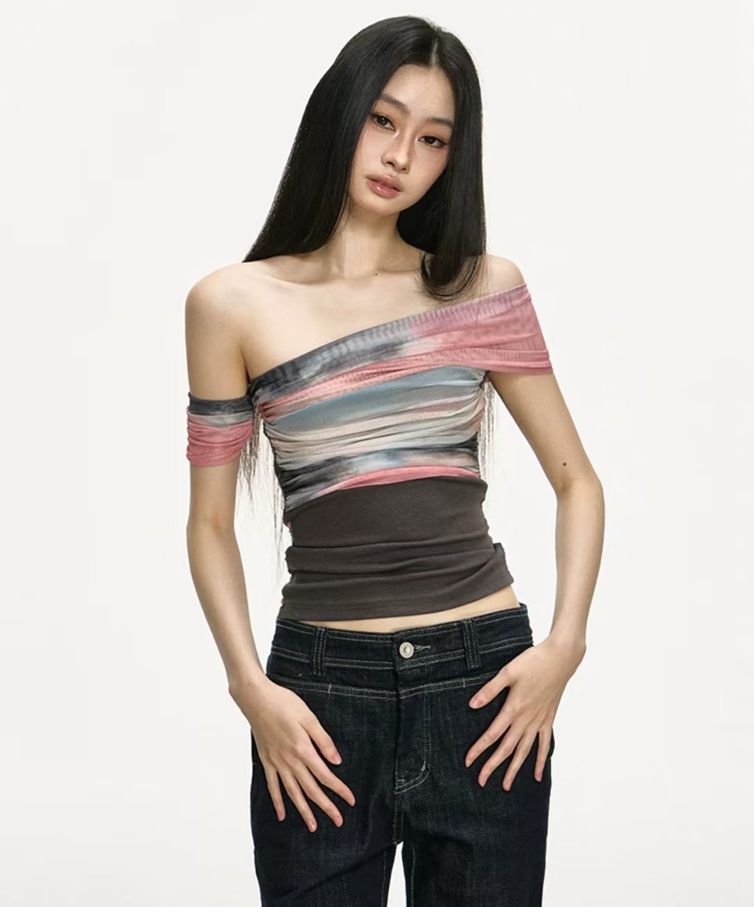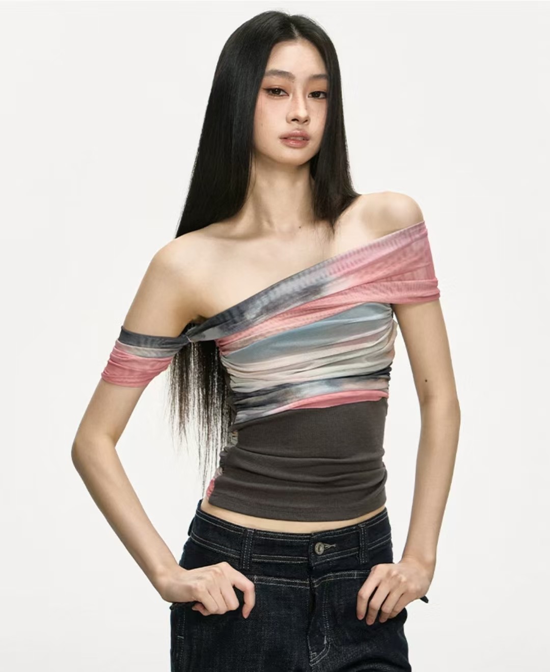 아름다운 헤일로 염색 망사 패치워크 오프숄더 맨위 여성 2026 새로운 여름 고급 센스 주름 허리 수축 티셔츠