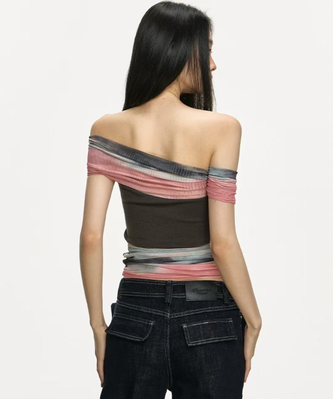 예술 헤일로 염색 망사 작은 대중 디자인 센스 비대칭 패치워크 오프숄더 티셔츠 여성 핫걸 민소매 튜브탑 맨위