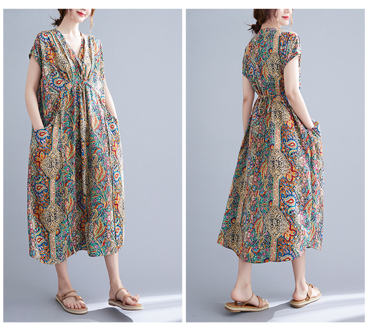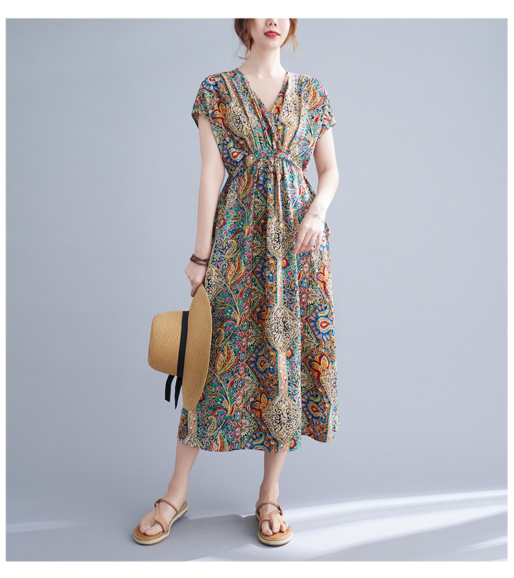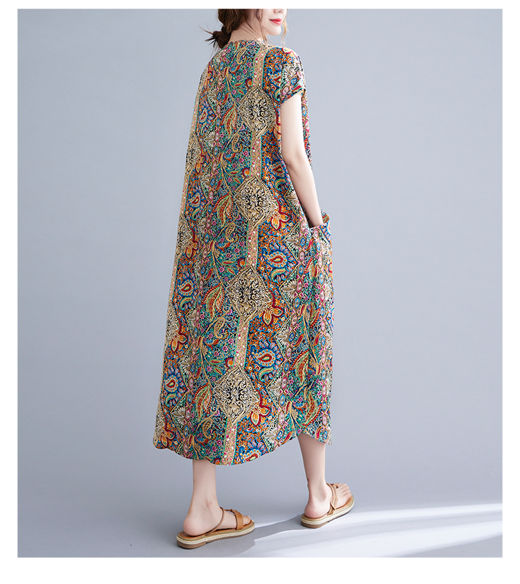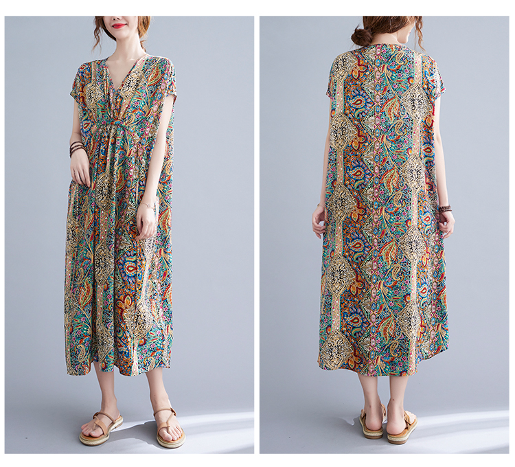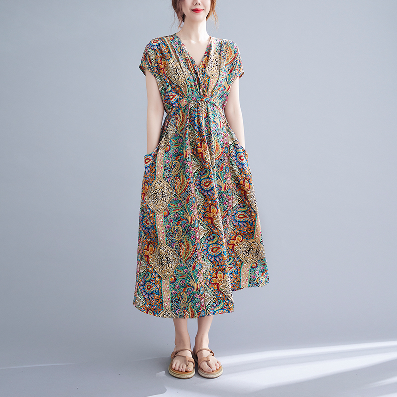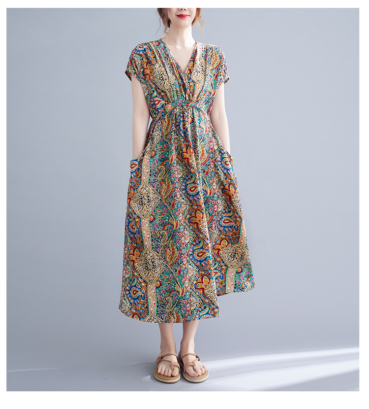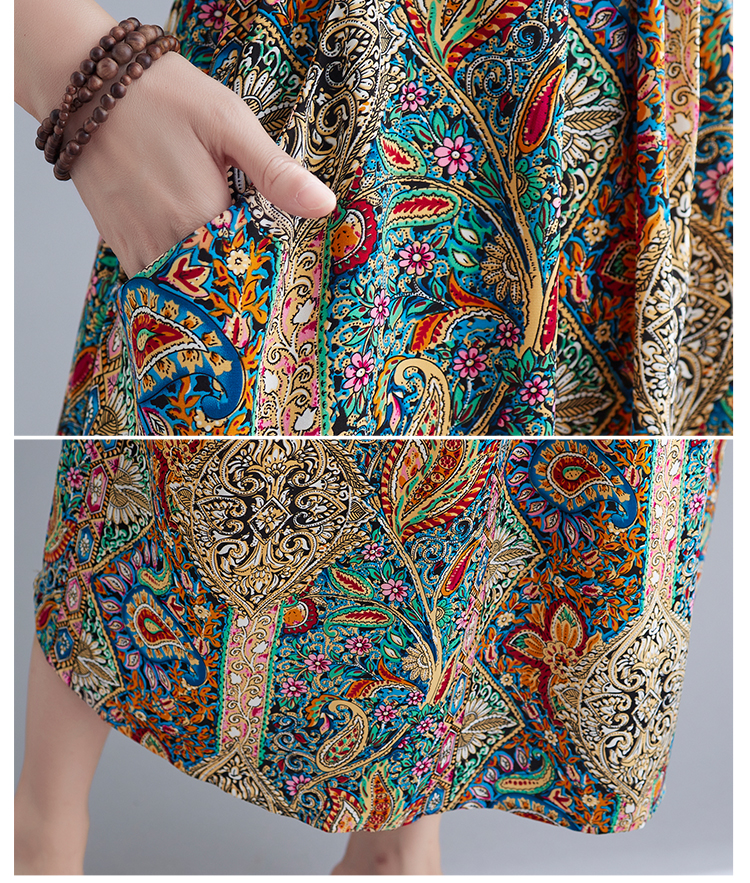실사 2026 여름 디자인 센스 루즈핏 민족 스타일 프린트 여성 드레스 품격 여행 휴가 바람 롱 스커트