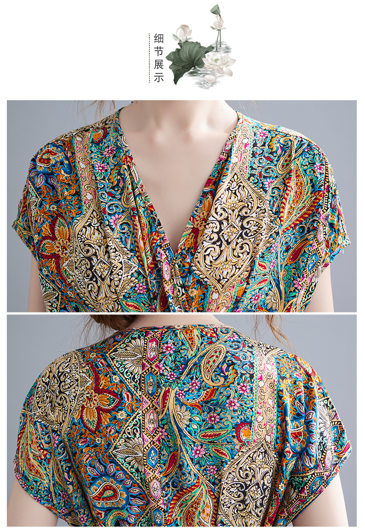 실사 여름 빅 사이즈 여성 라운드 넥 면 린넨 레트로 맨위 프린트 루즈핏 반팔