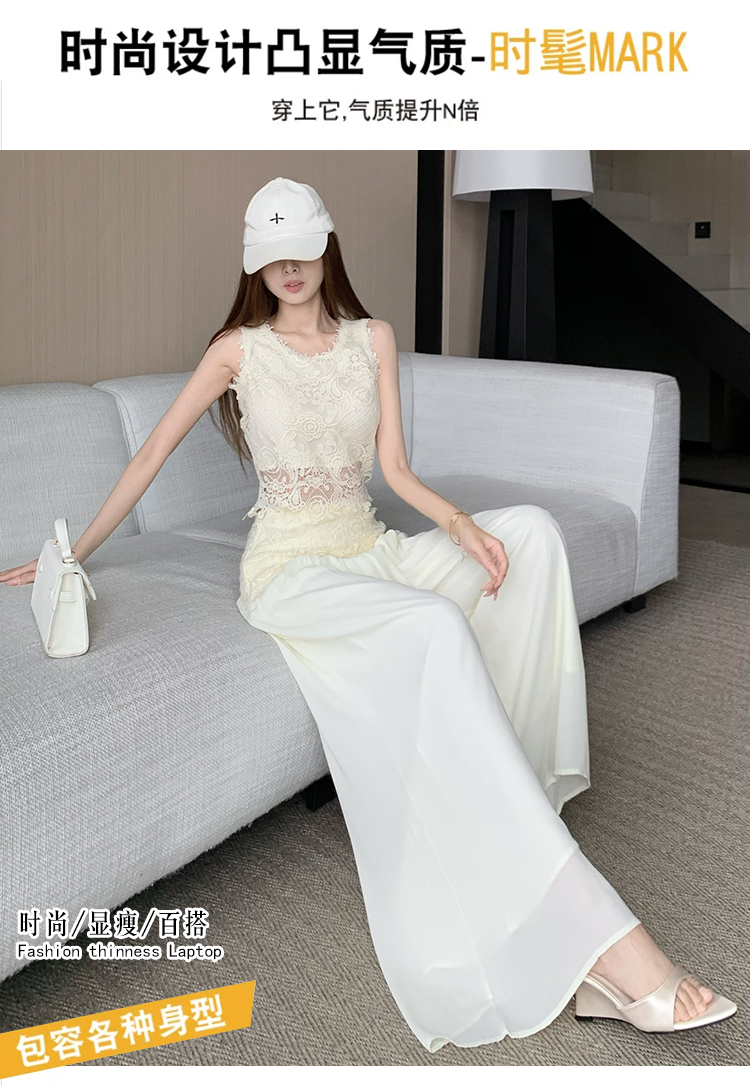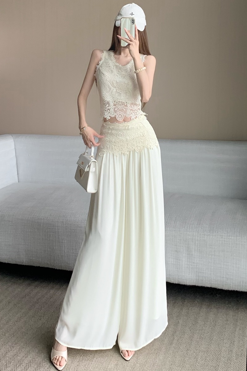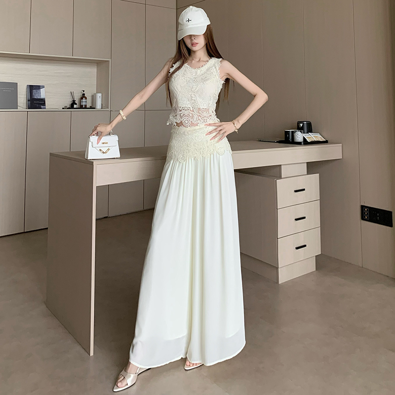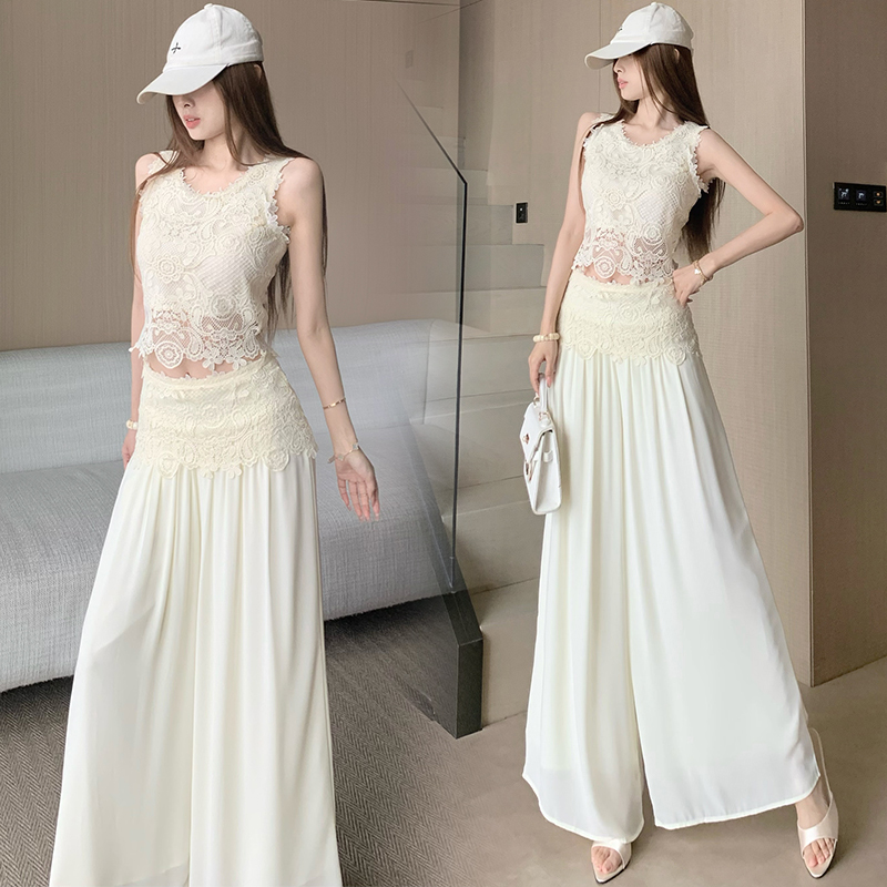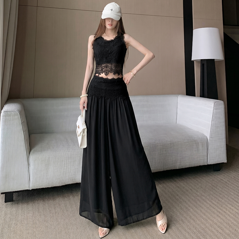 한국 스타일 작은 샤넬 스타일 쇼트 스타일 홀로우 아웃 레이스 민소매 맨위 여름 새로운 하이웨이스트 넓은 다리 캐주얼 바지 세트 여성