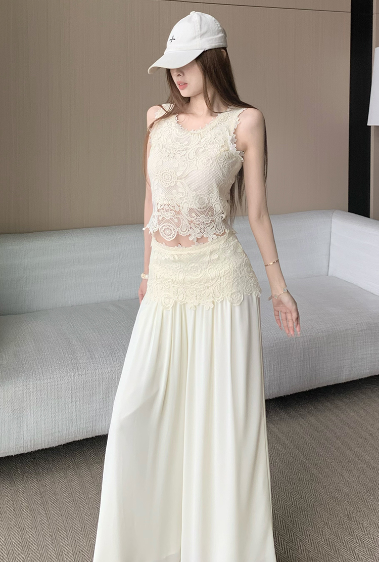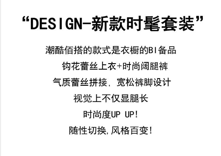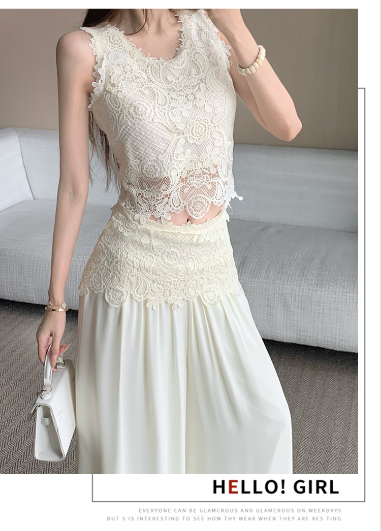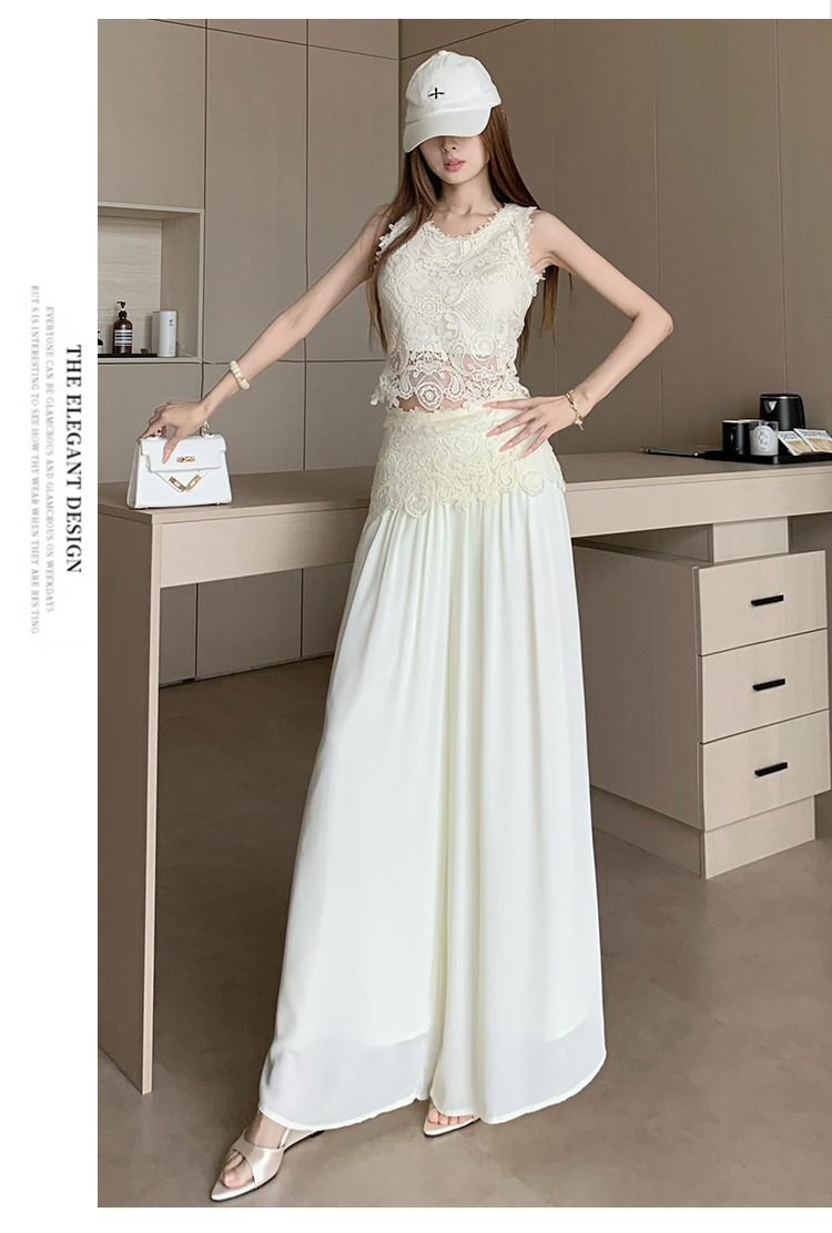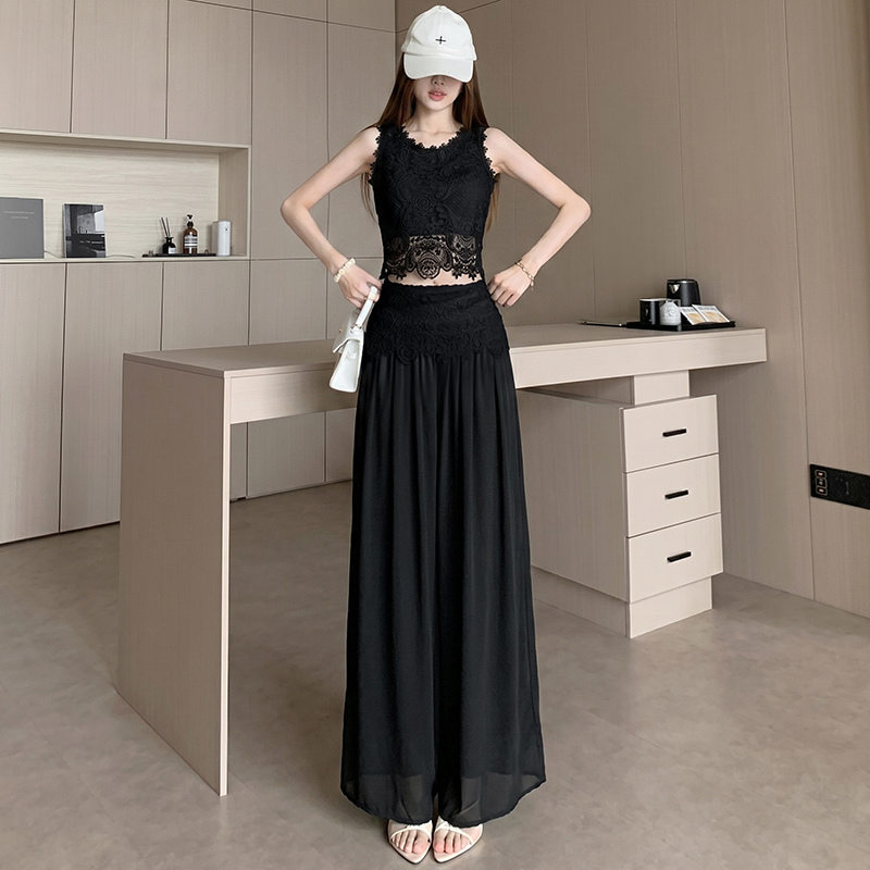 한국 스타일 작은 샤넬 스타일 쇼트 스타일 홀로우 아웃 레이스 민소매 맨위 여름 새로운 하이웨이스트 넓은 다리 캐주얼 바지 세트 여성
