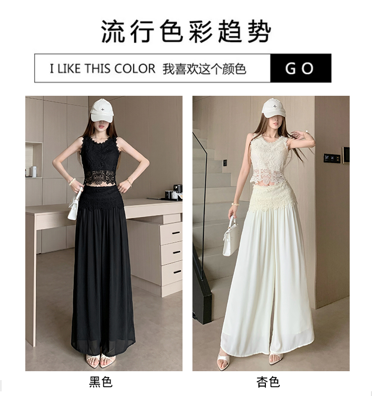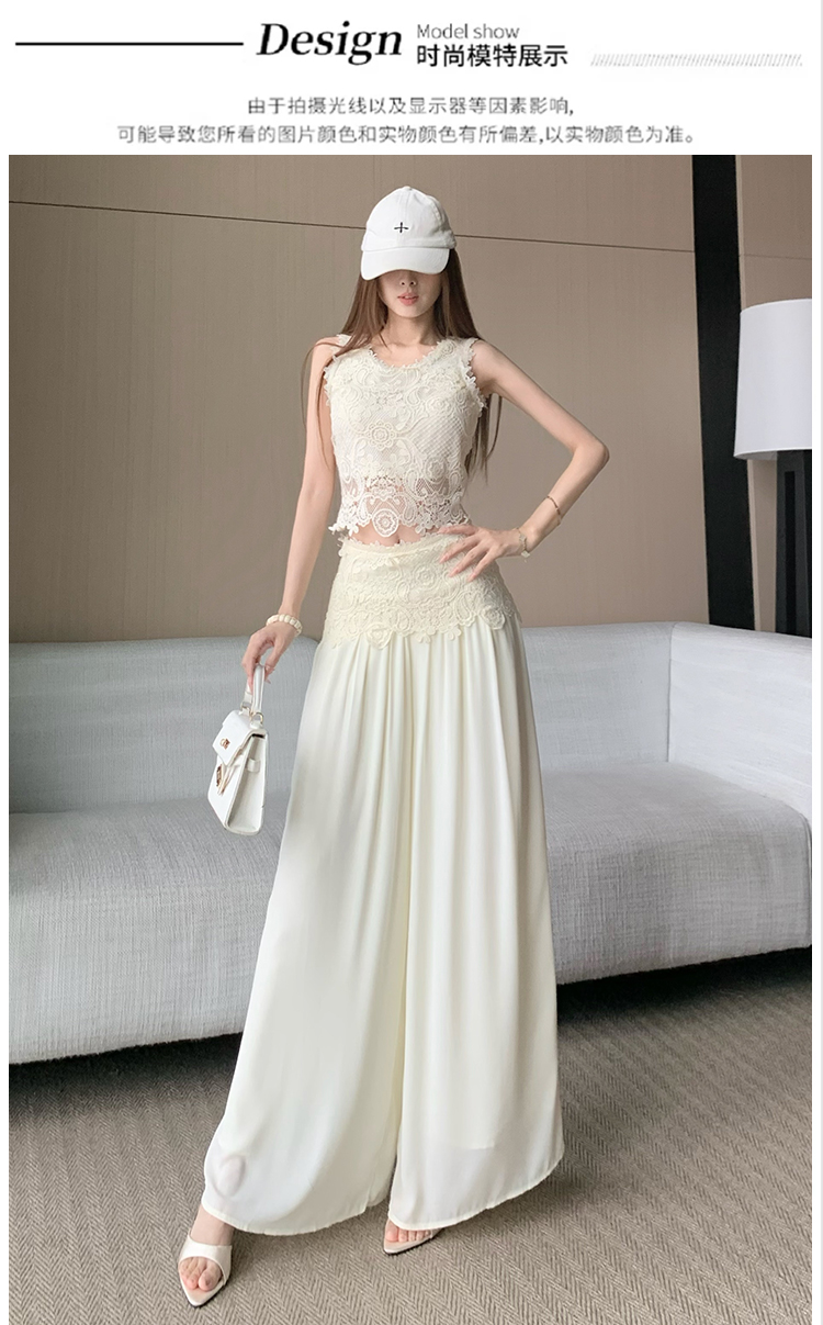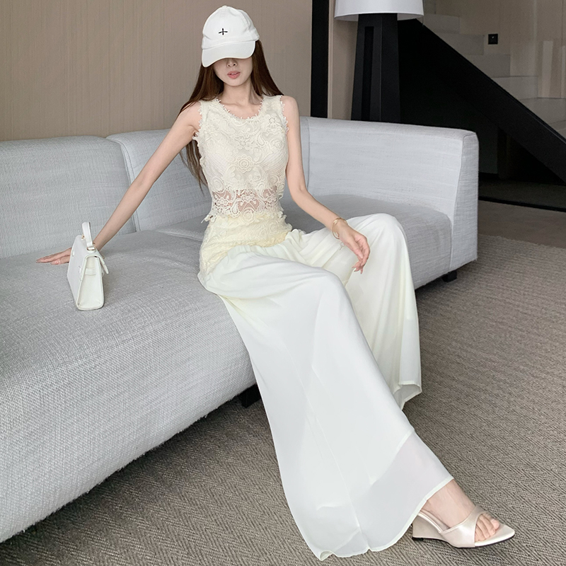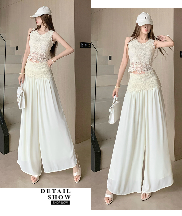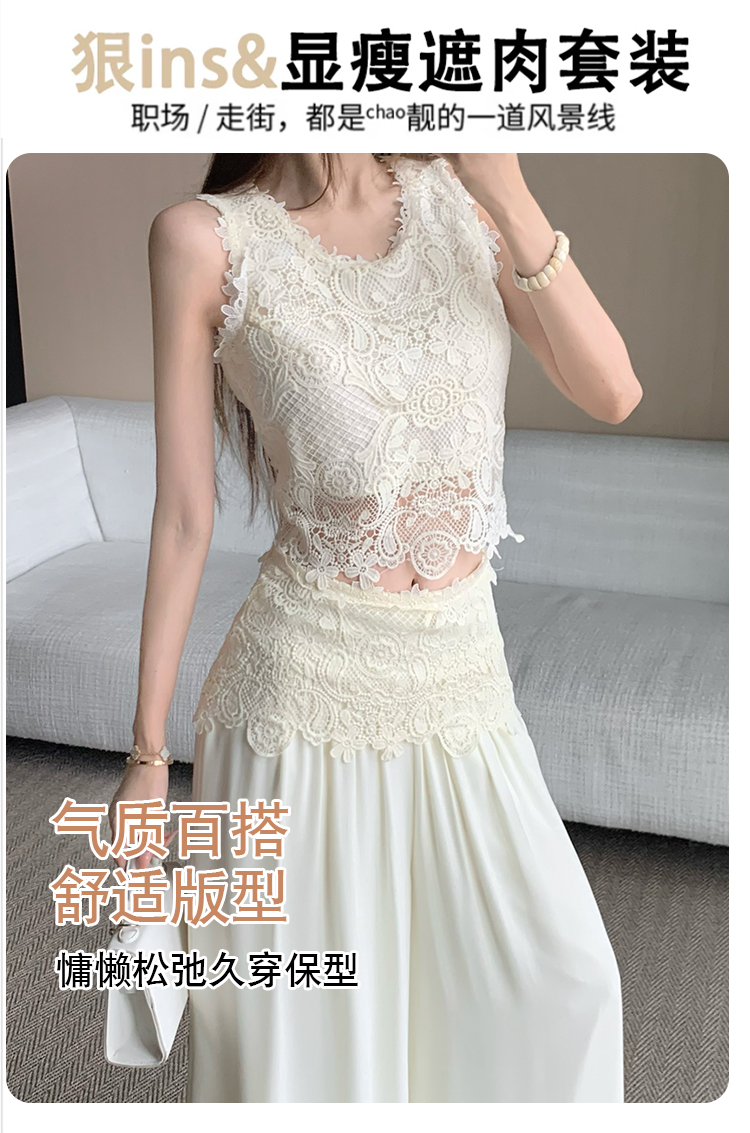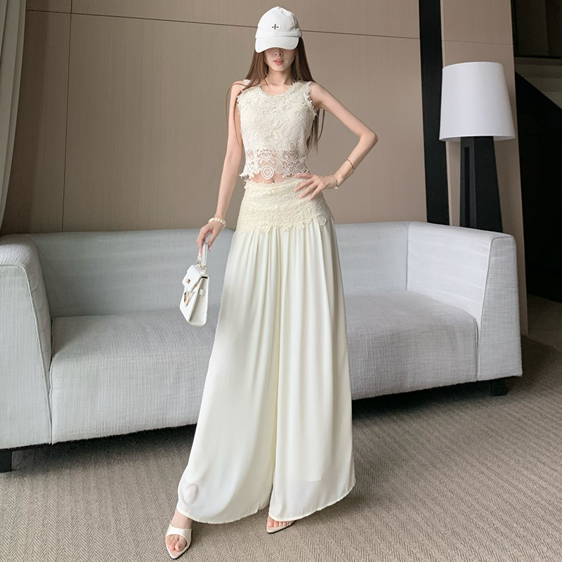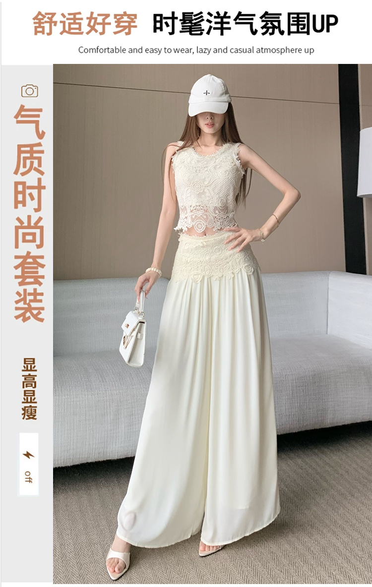 한국 스타일 작은 샤넬 스타일 쇼트 스타일 홀로우 아웃 레이스 민소매 맨위 여름 새로운 하이웨이스트 넓은 다리 캐주얼 바지 세트 여성