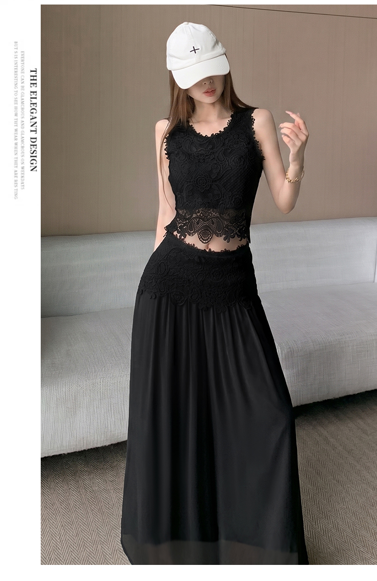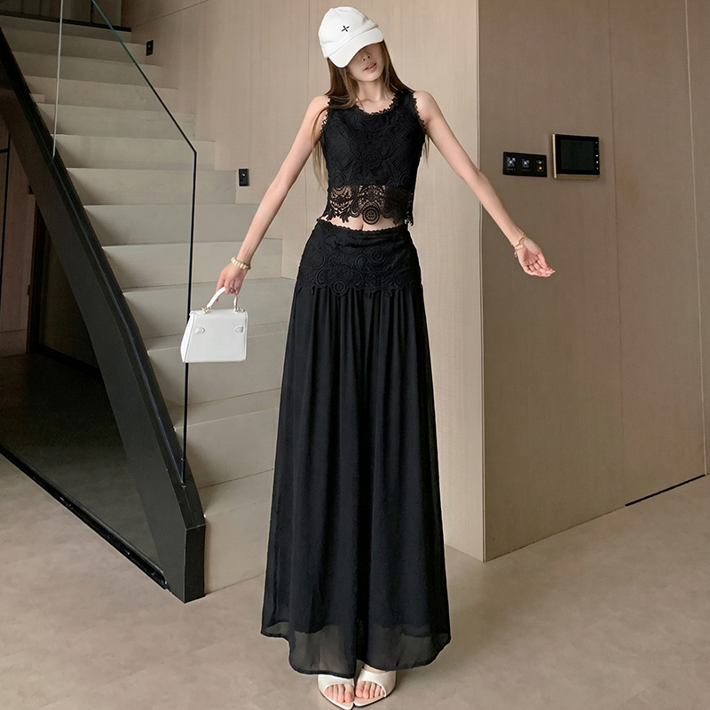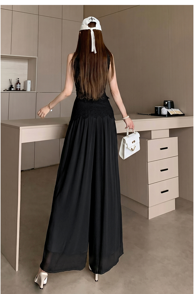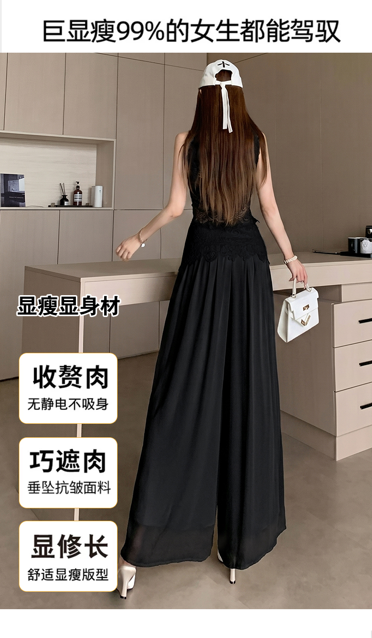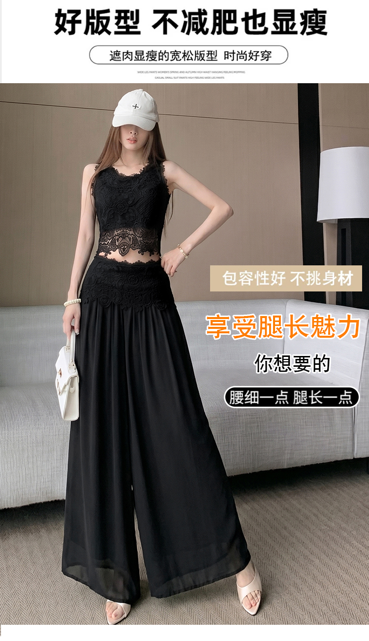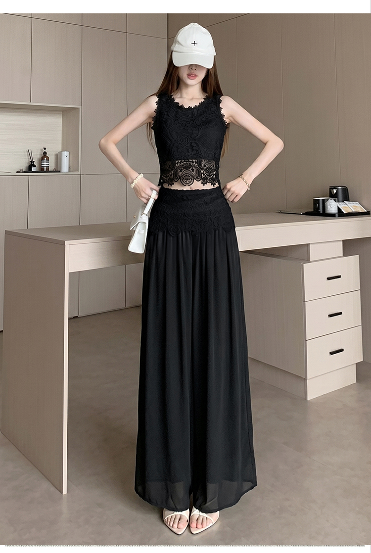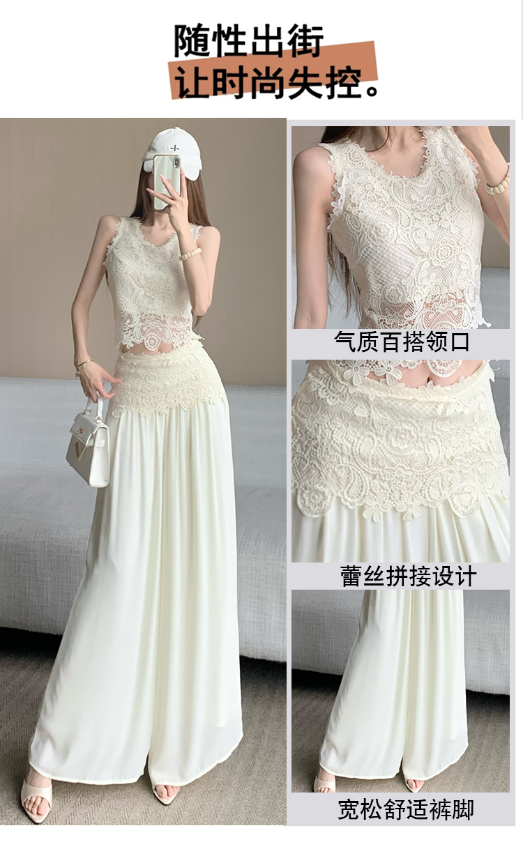 한국 스타일 작은 샤넬 스타일 쇼트 스타일 홀로우 아웃 레이스 민소매 맨위 여름 새로운 하이웨이스트 넓은 다리 캐주얼 바지 세트 여성