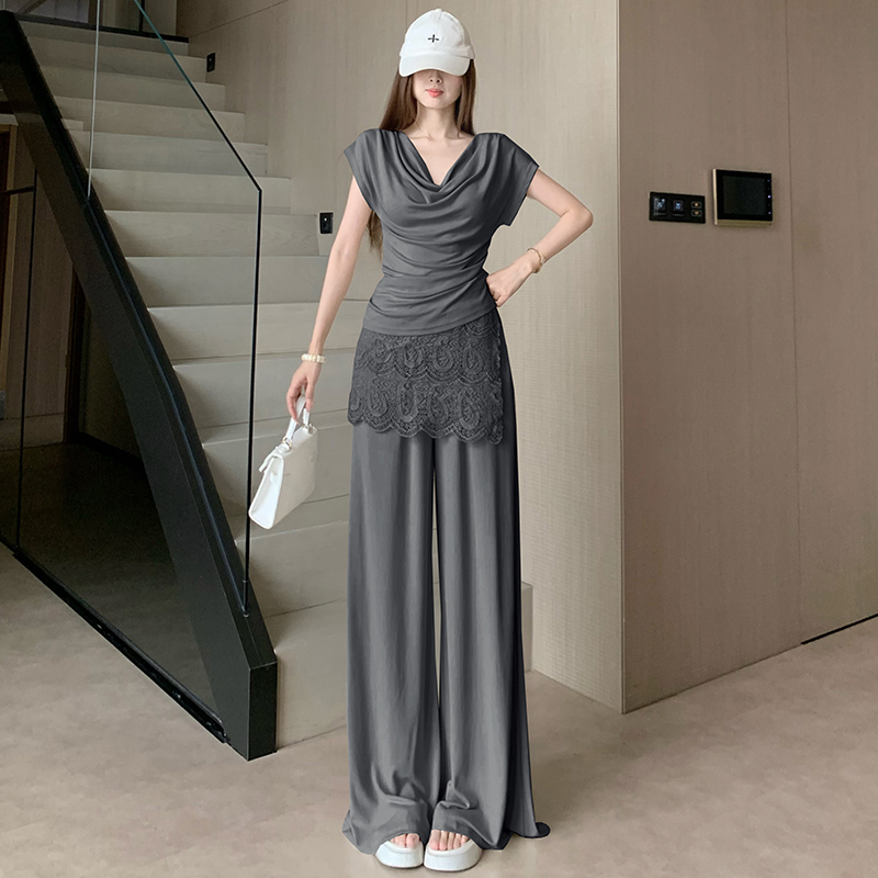 한국 스타일 작은 샤넬 스타일 쇼트 스타일 홀로우 아웃 레이스 민소매 맨위 여름 새로운 하이웨이스트 넓은 다리 캐주얼 바지 세트 여성