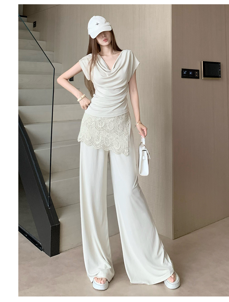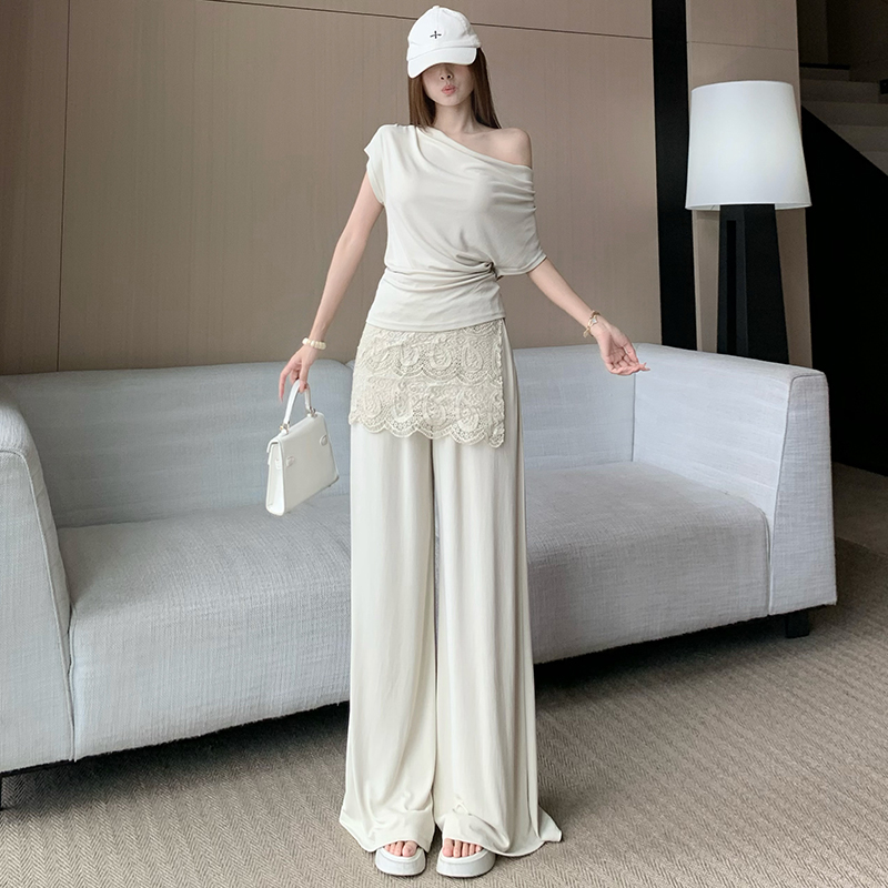 화이트 레이스 방귀 커튼 부츠컷 바지 여성 여름 얇은 스타일 페이크 레이어드 패치워크 하이웨이스트 슬림해 보이는 몸매 가꾸기 바닥 청소 캐주얼 바지