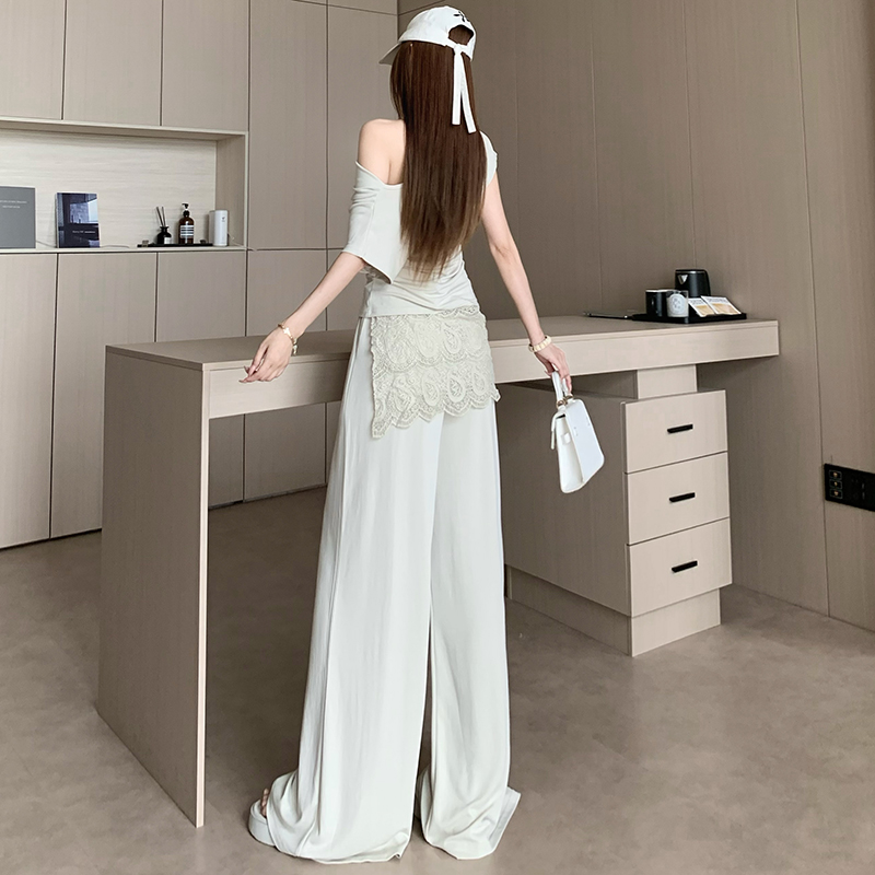 새로운 프랑스식 낭만주의 프릴 보트넥 몸매 가꾸기 맨위 하이웨이스트 슬림해 보이는 와이드 레그 팬츠 투피스 슈트 여성 여름