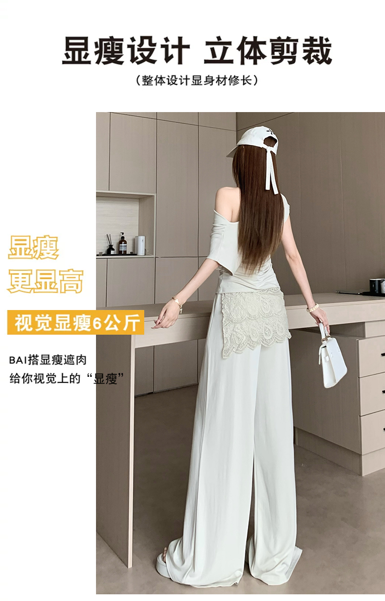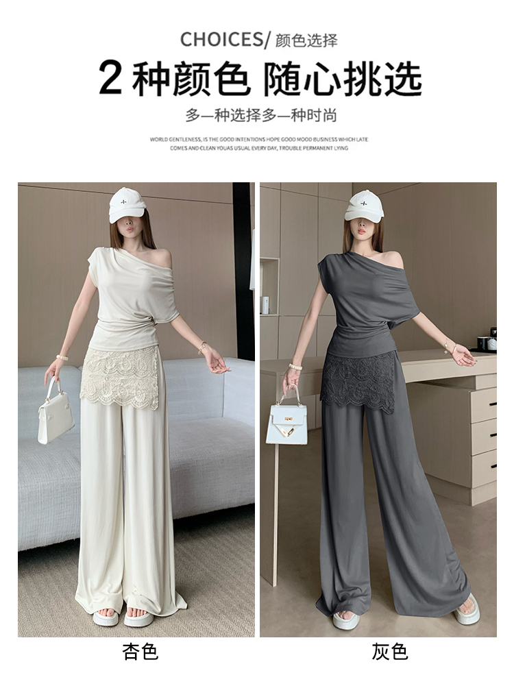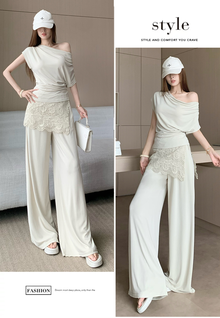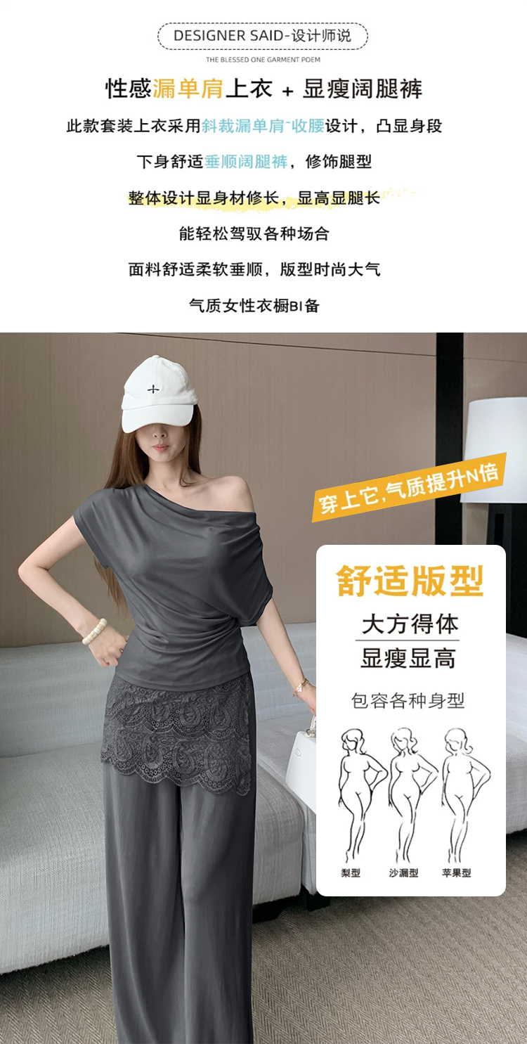 방귀 커튼 바지 세트 여성 여름 패션 품격 작은 대중 외국 가스 비스듬한 어깨 오프숄더 반팔 부츠컷 바지 슬림해 보이는 투피스 세트