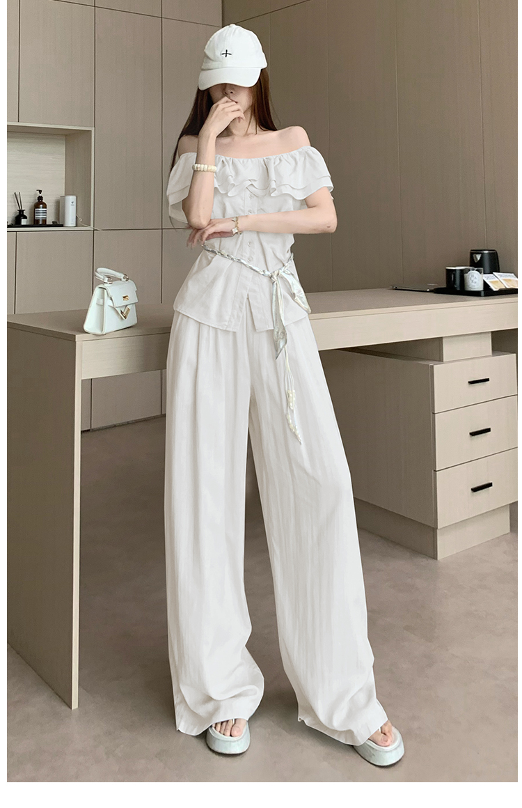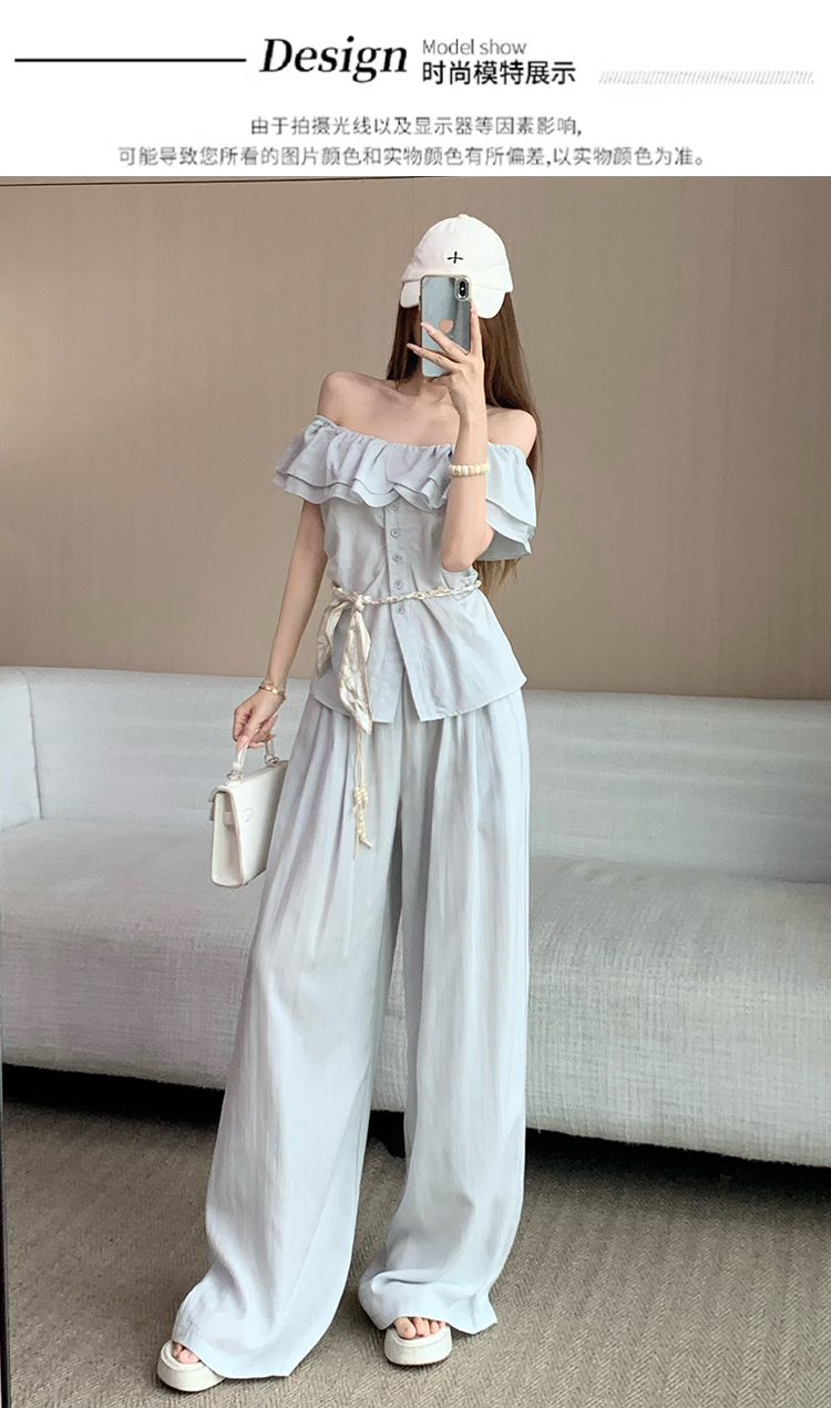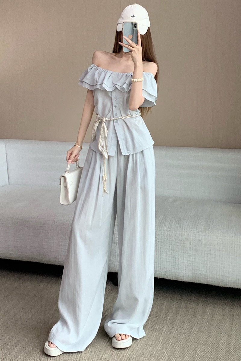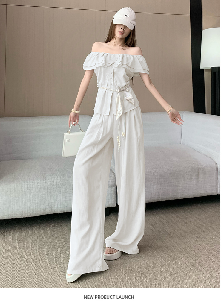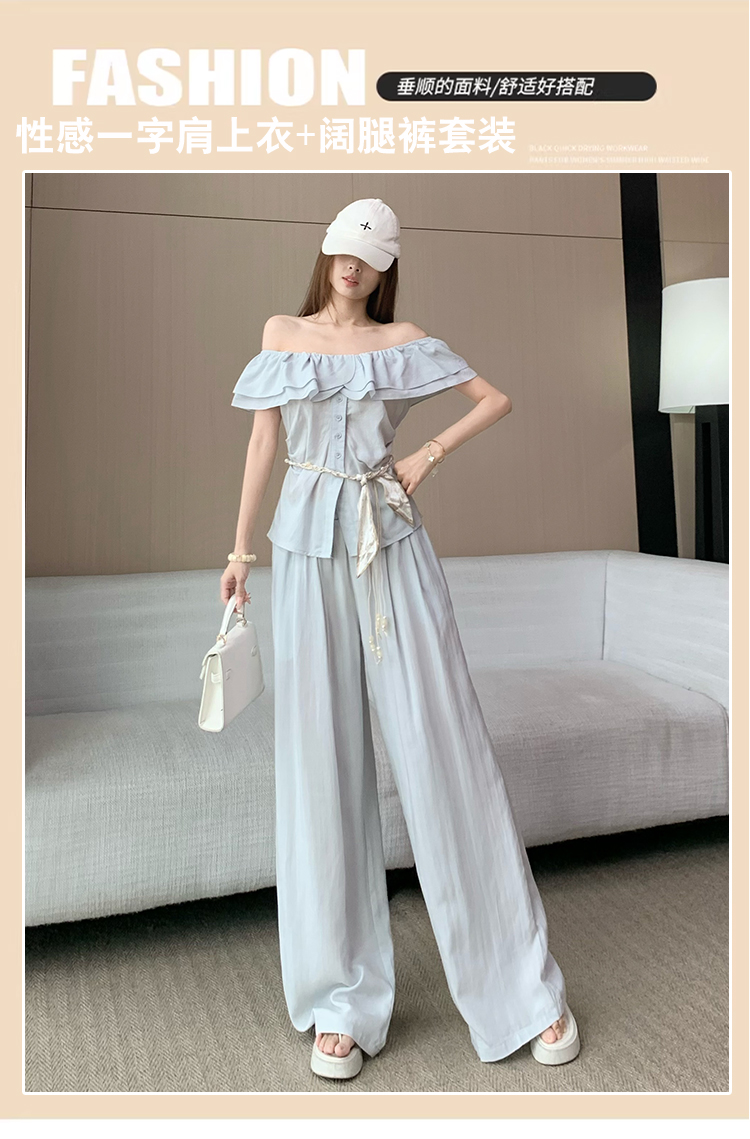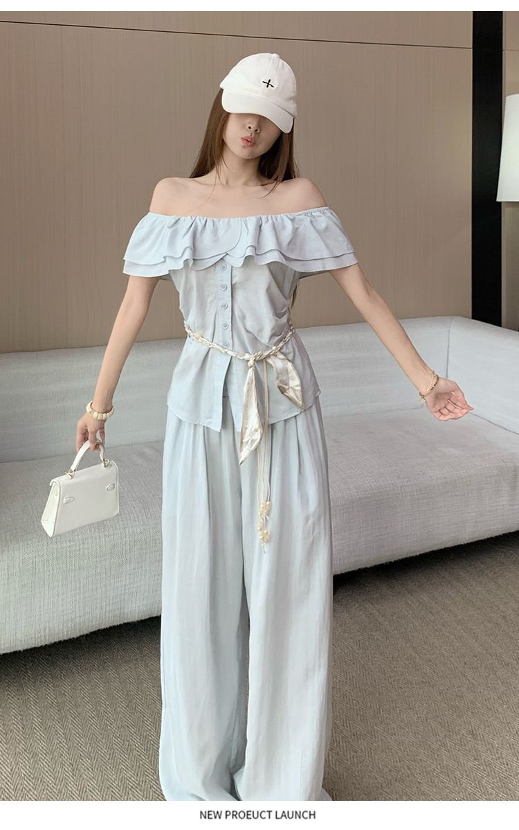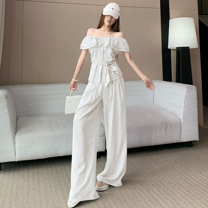 새로운 프랑스식 낭만주의 프릴 보트넥 몸매 가꾸기 맨위 하이웨이스트 슬림해 보이는 와이드 레그 팬츠 투피스 슈트 여성 여름