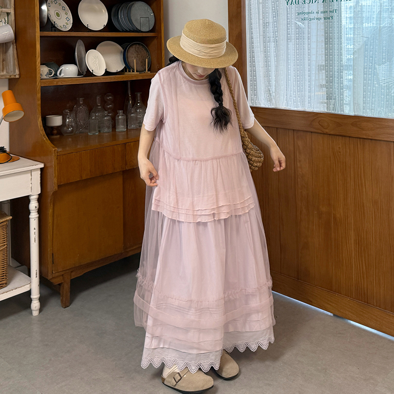 실사 2026 여름 드레스 새로운 민소매 망사 치마 인사이드 가져 가라. 반팔 티셔츠 반신 치마 세트