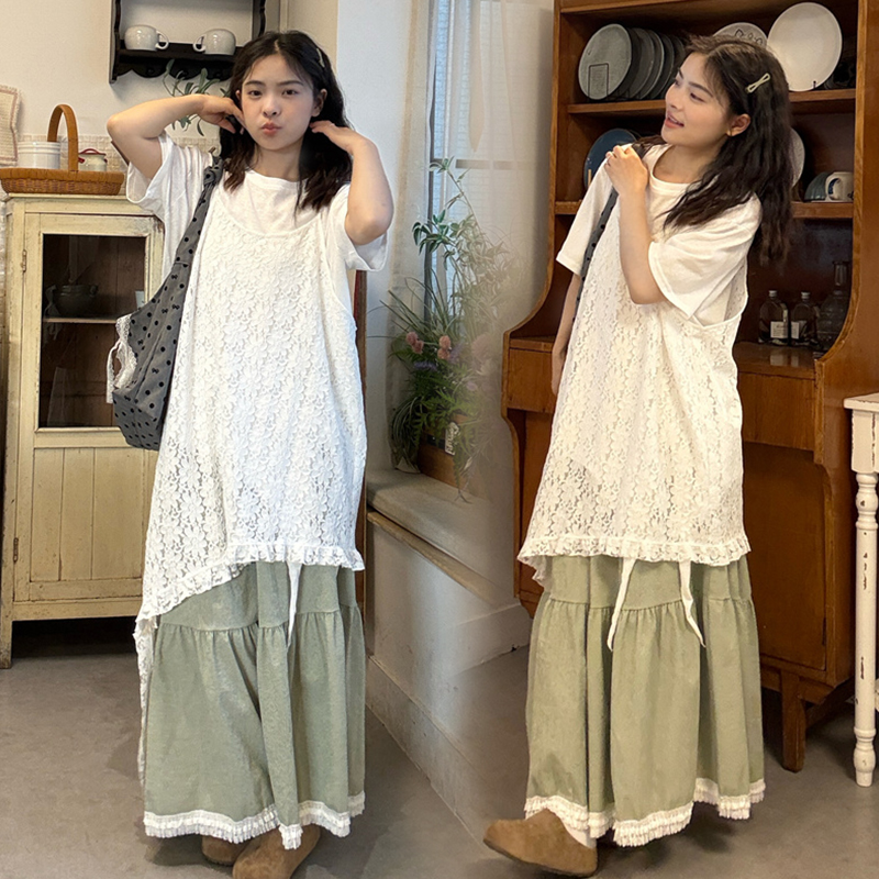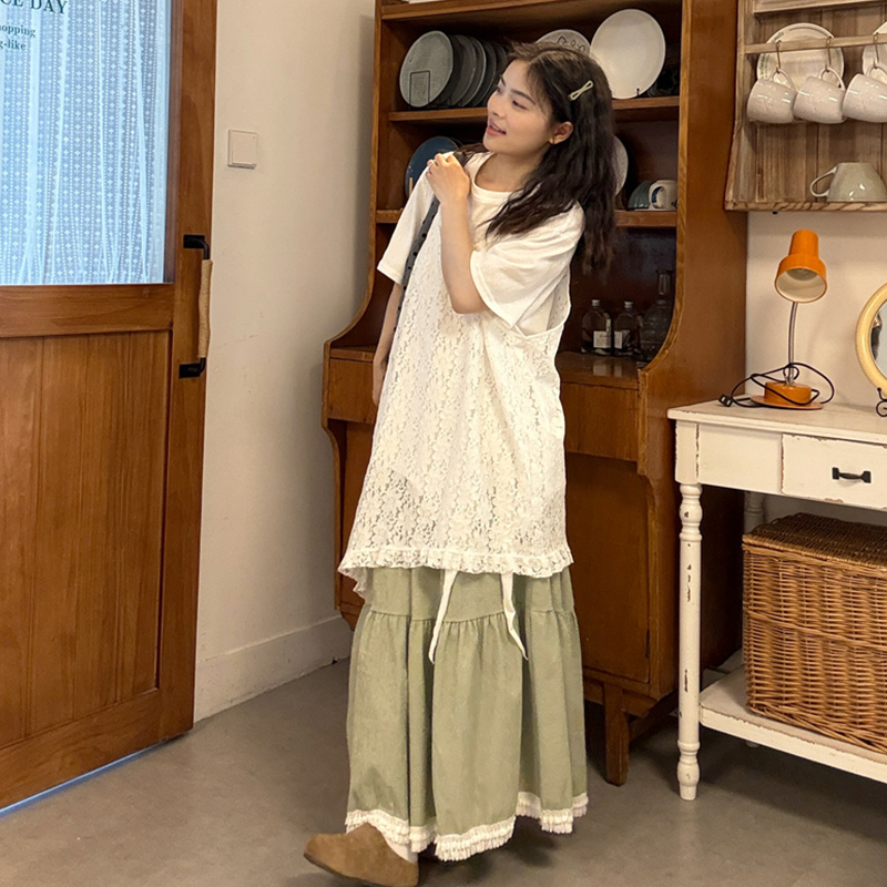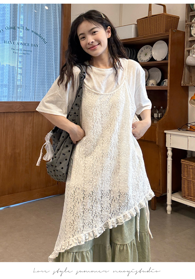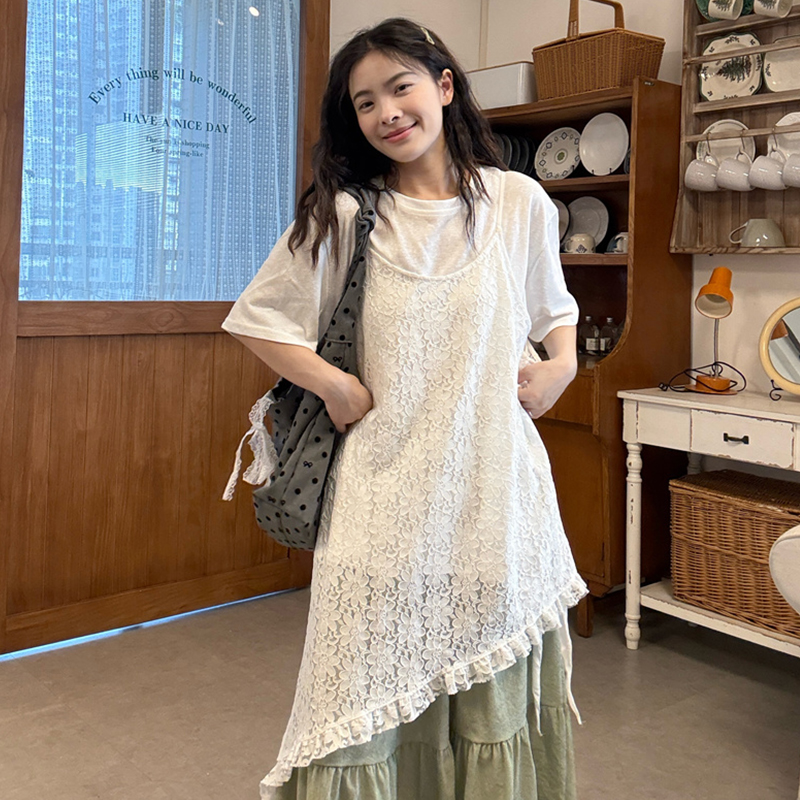 실사 2026 여름 섹션 임산부 자수 레이스 슬립 드레스 스택 착용 화이트 티셔츠 레이스 반 스커트 세트