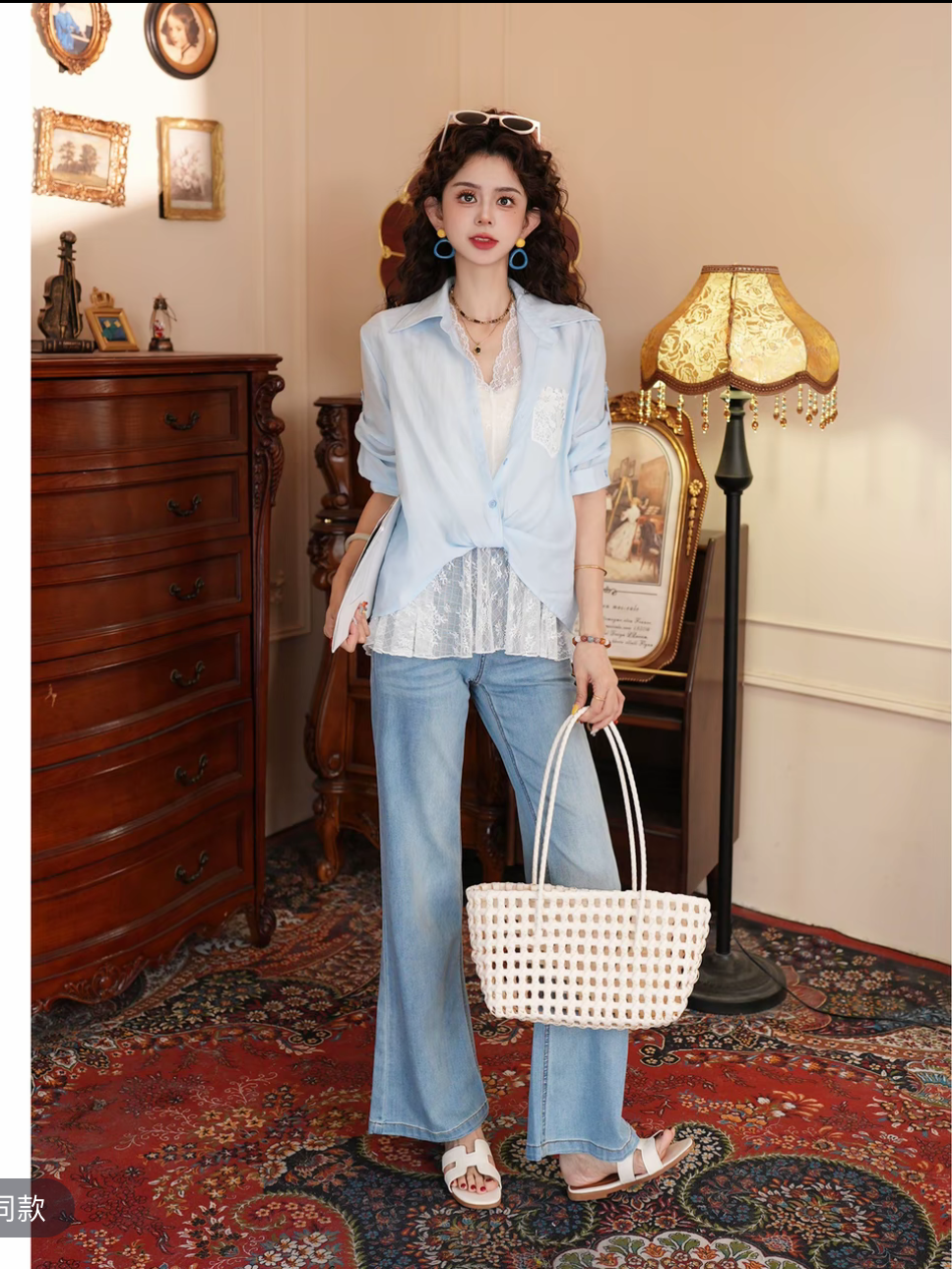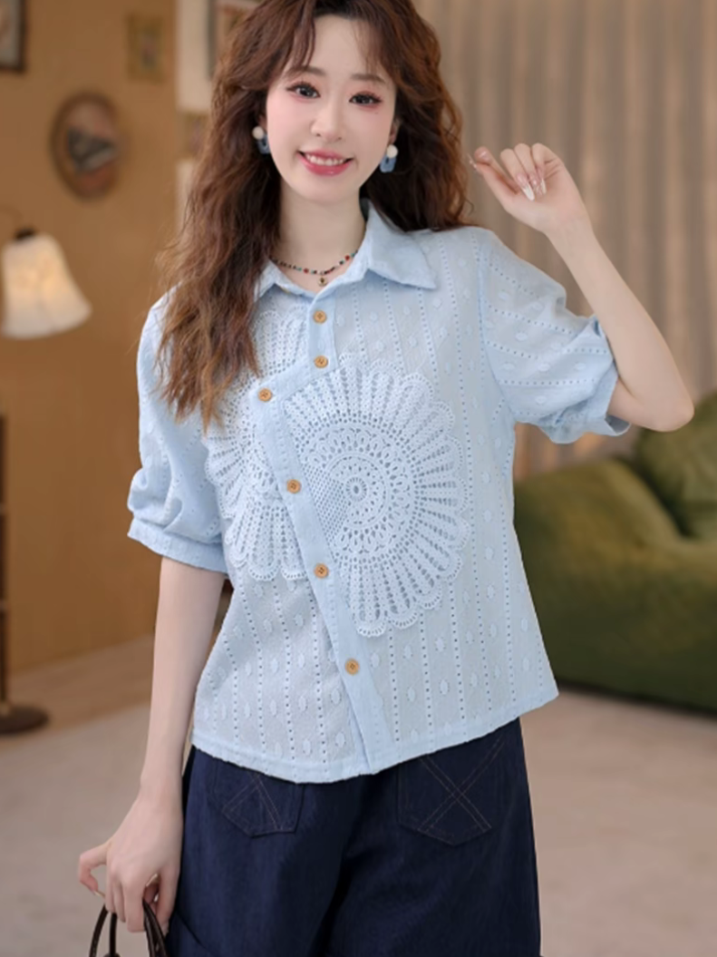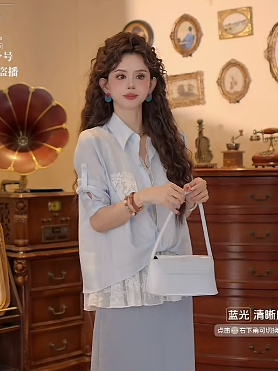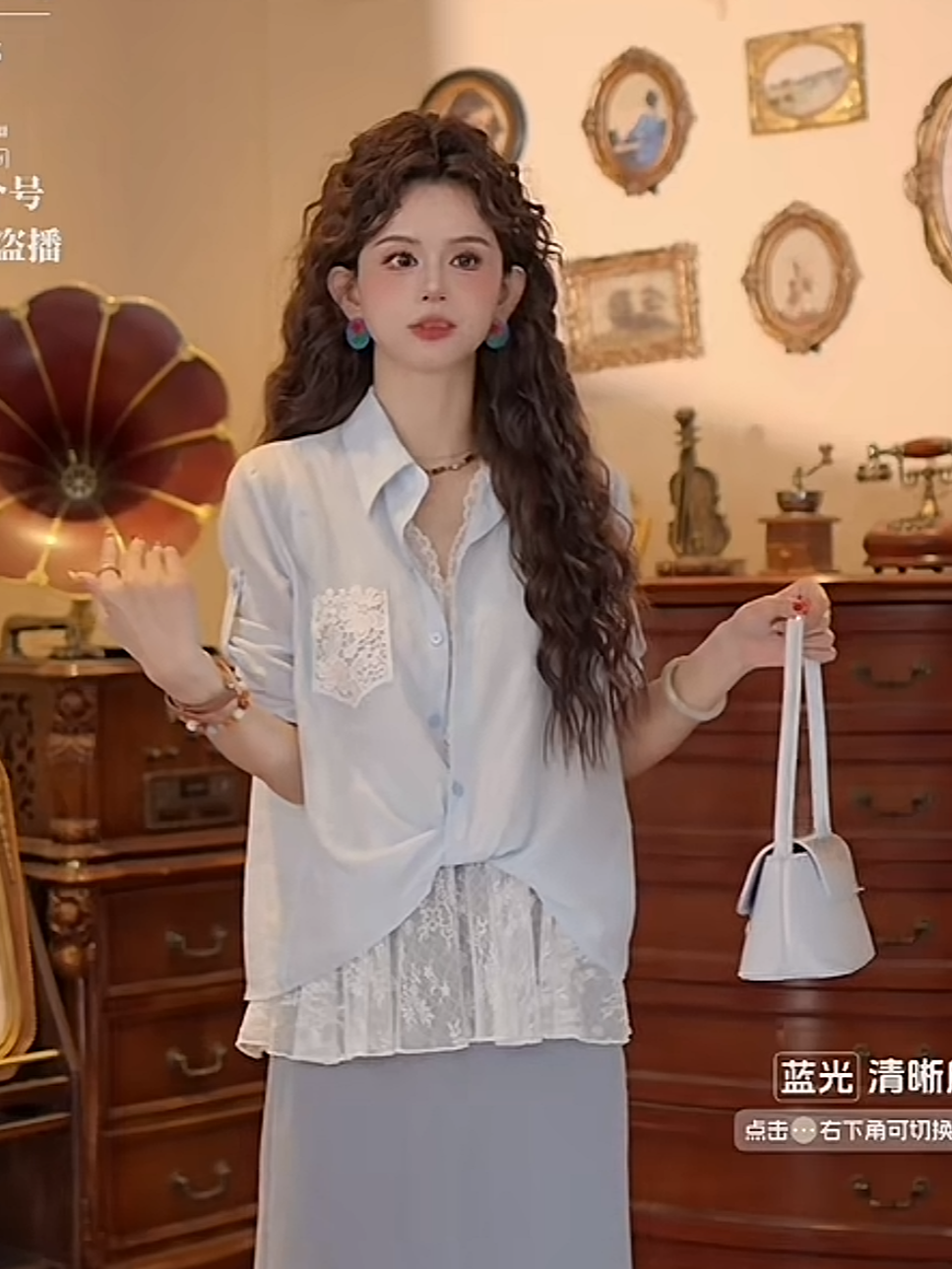 멀리 웨이브 떠 다니는 섬 레트로 레이스 조각 페이크 레이어드 루즈핏 다용도 여름 셔츠