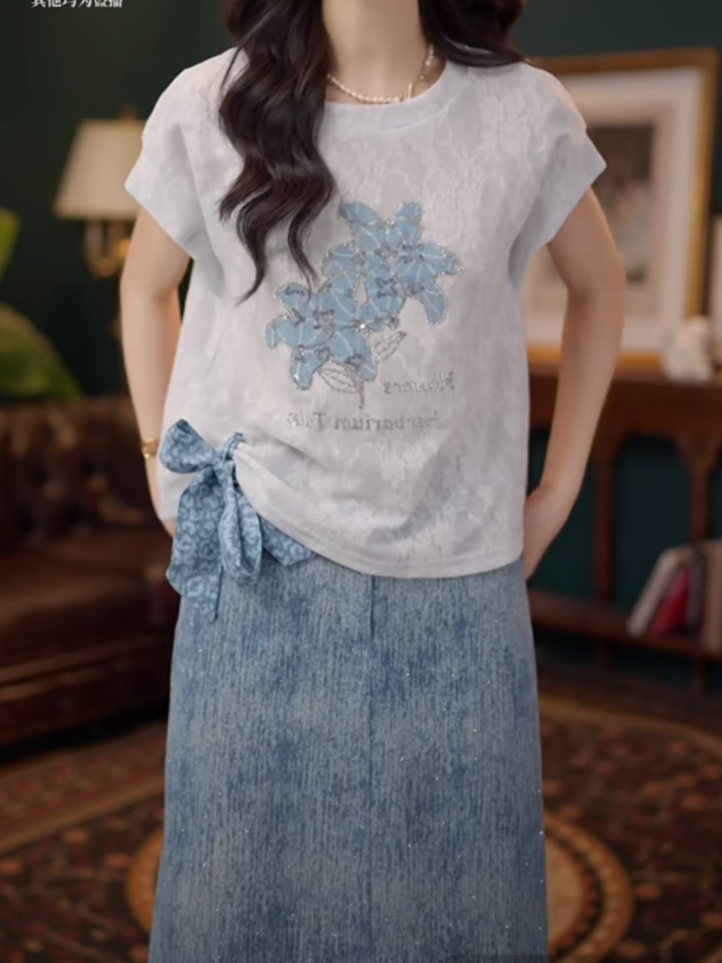 레트로 항구 바람 연령 감소 티셔츠 외국 가스 다용도 꽃 라운드 넥 반팔 10 반 스커트