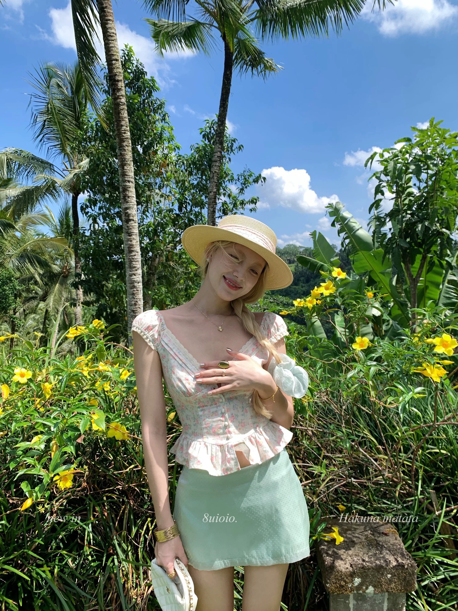향나무 믹스 재스민 ~ 중 바람 V넥 꽃무늬 여성 셔츠 여름 새로운 프릴 쇼트 스타일 맨위 반신 스커트