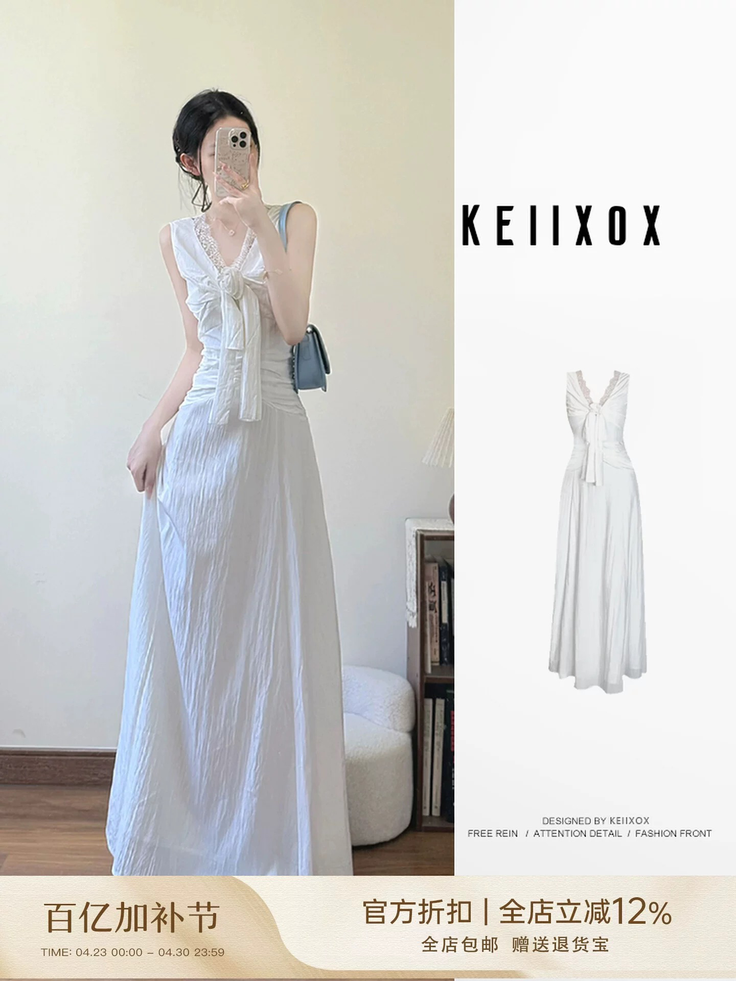 V넥 프랑스식 민소매 여성 드레스 여름 화이트 몸매 가꾸기 한 마디 롱 스커트 디자인 센스 작은 대중 치마