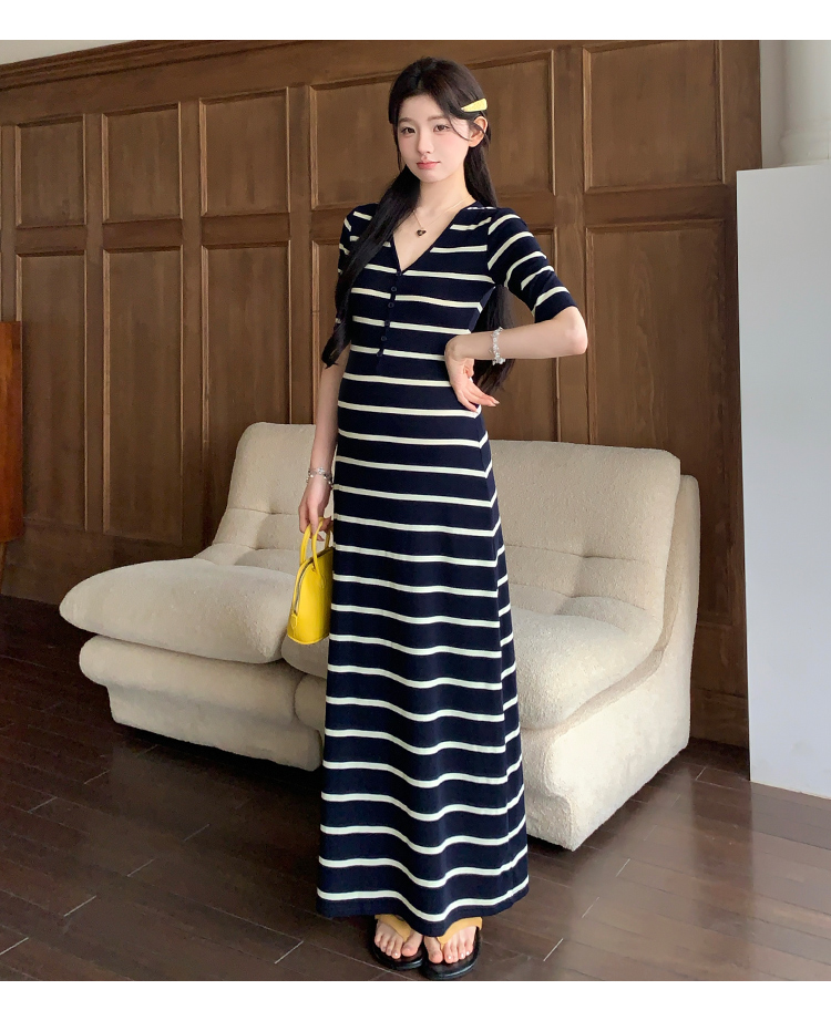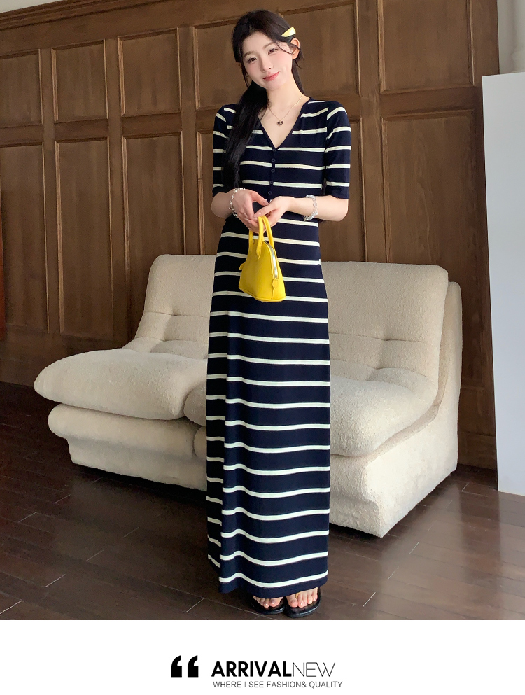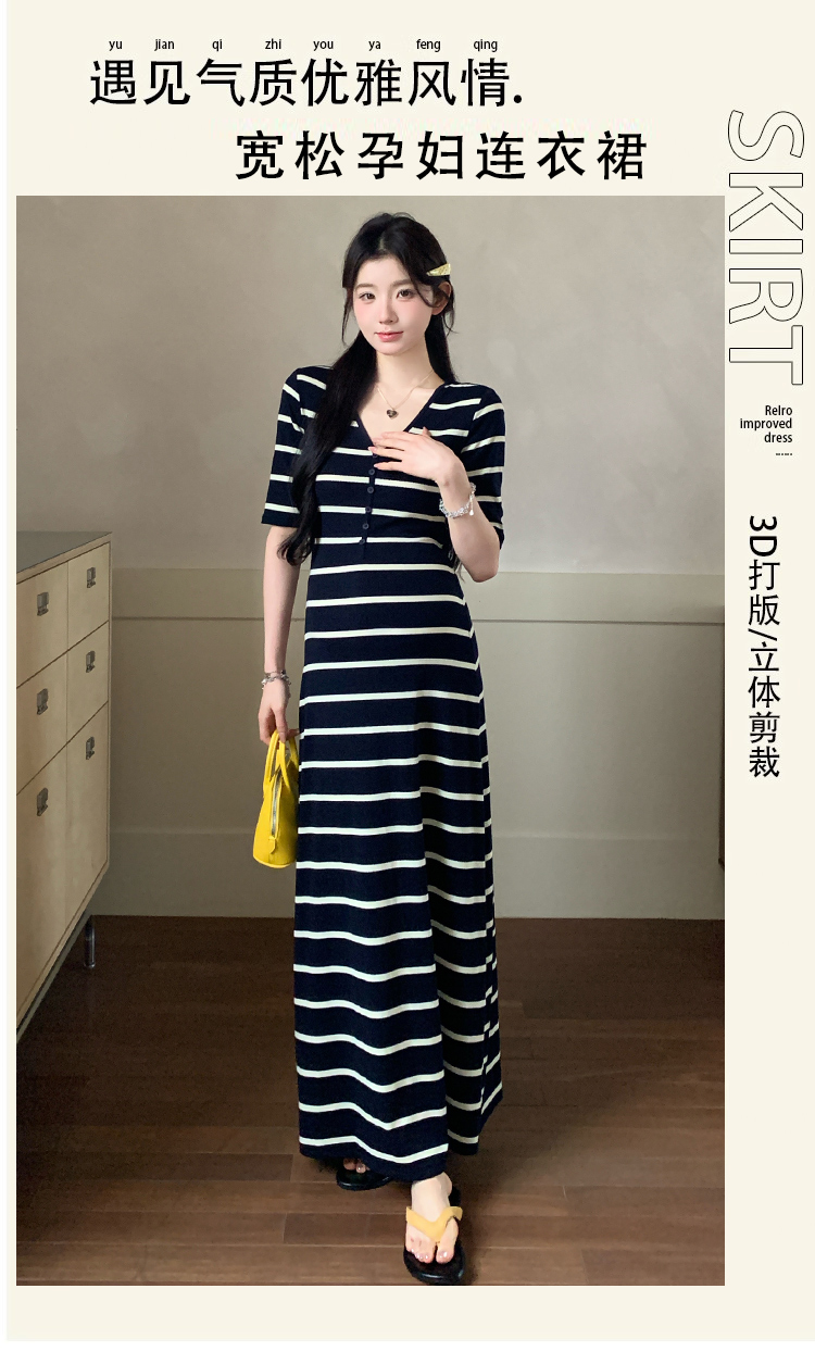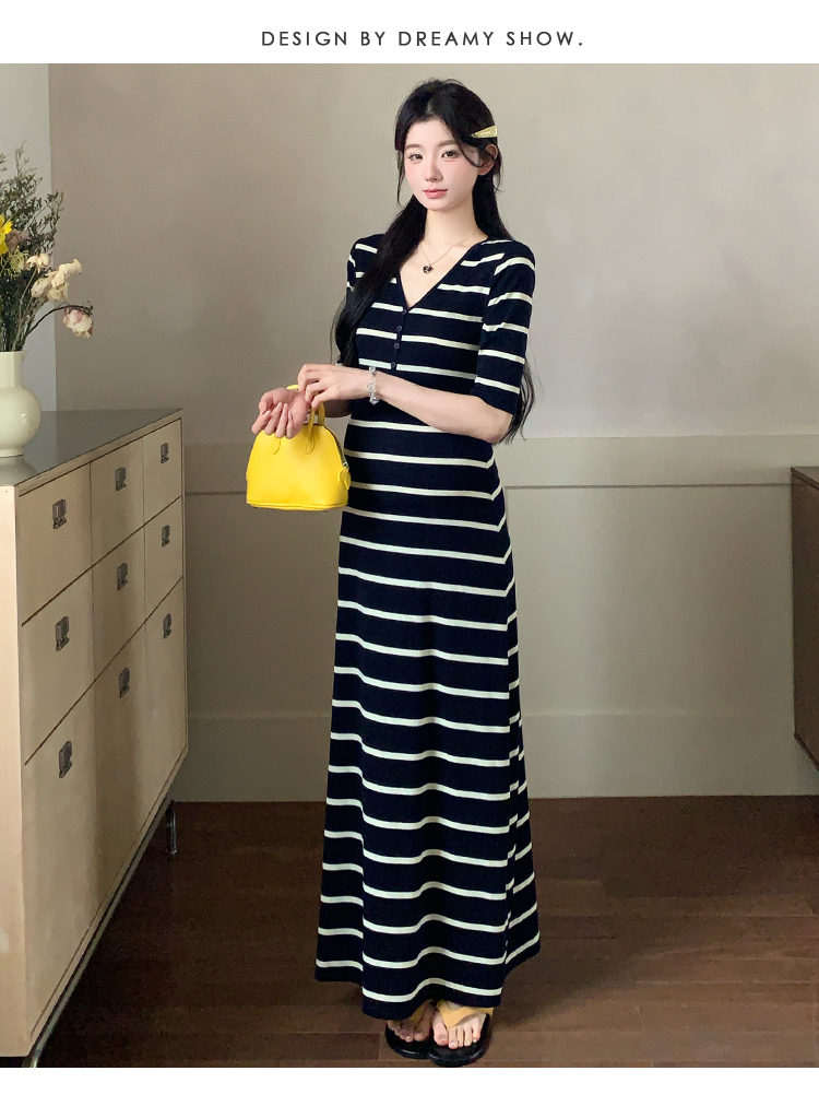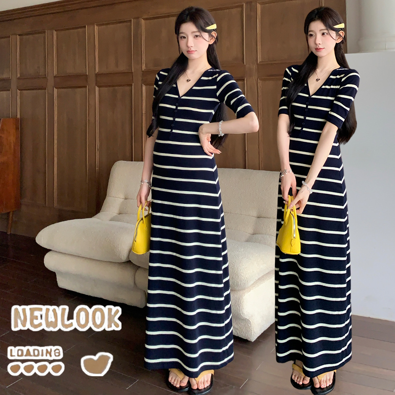 실사 지금 여름 신제품 스트라이프 V넥 중간 소매 매운맛 엄마 드레스