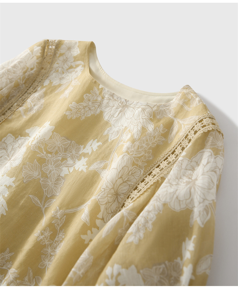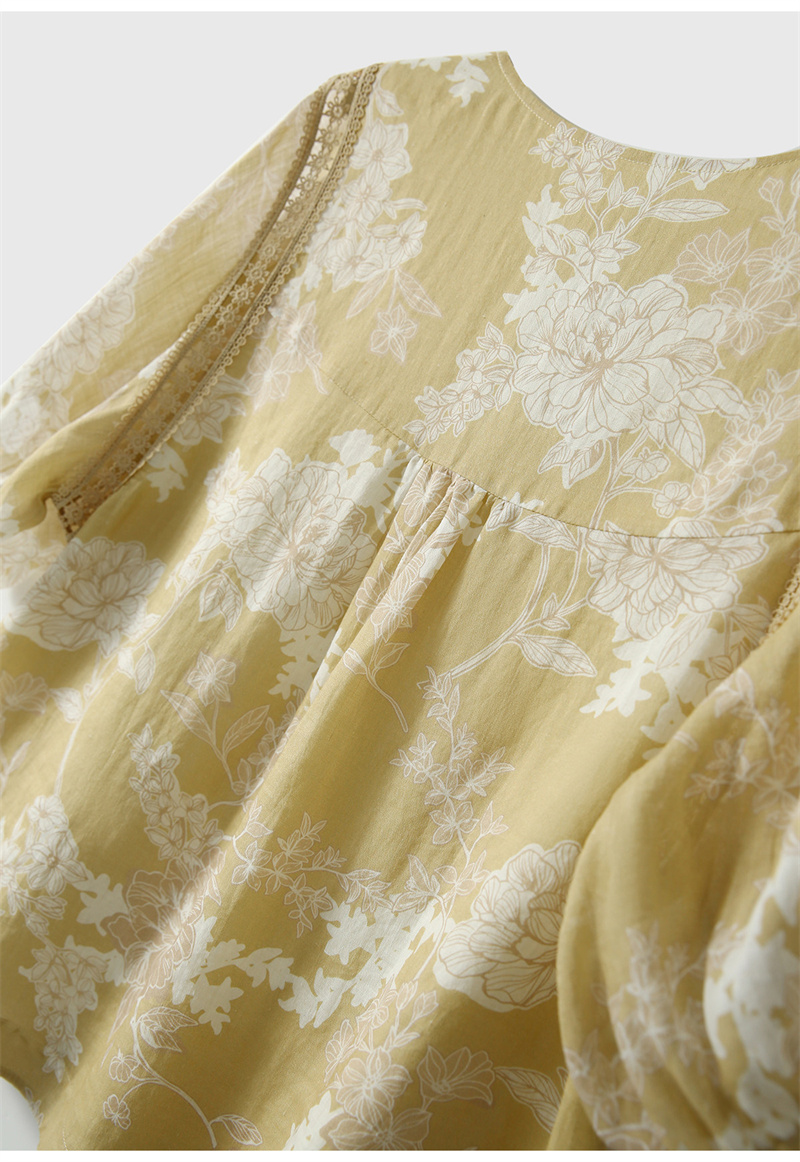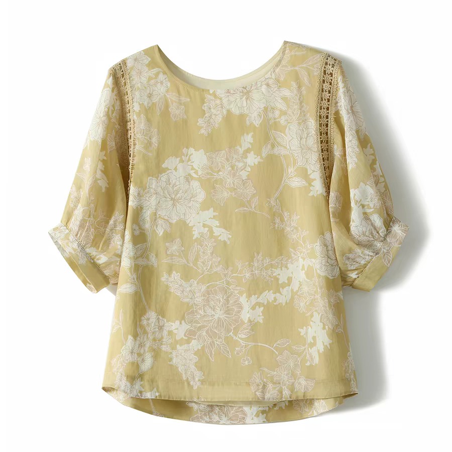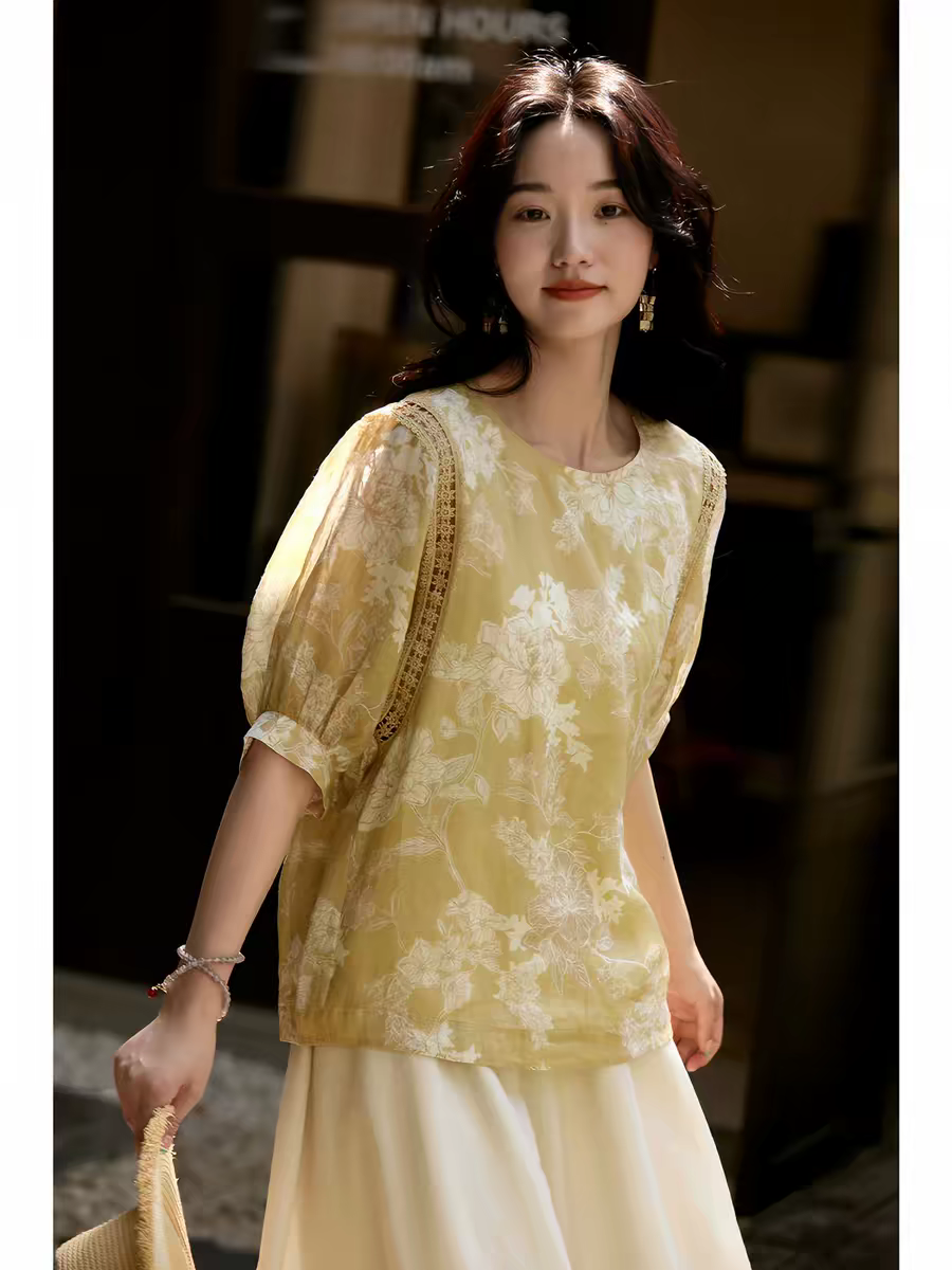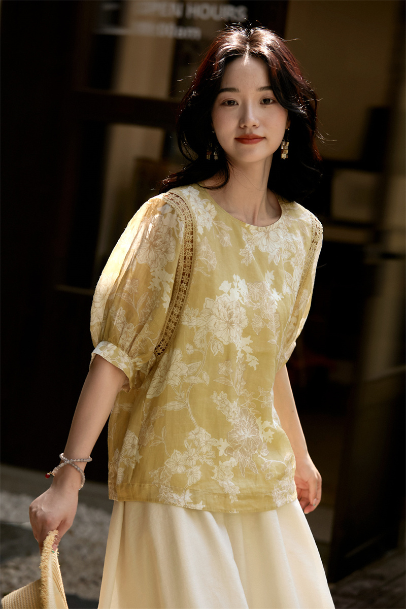 모 향기로운 얕은 얇은 스타일 면 린넨 종이 절단 프린트 홀로우 아웃 레이스 벌룬 소매 작은 셔츠 맨위 여성 26 여름 の