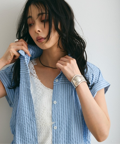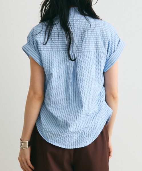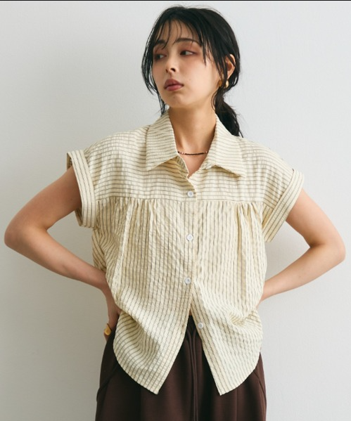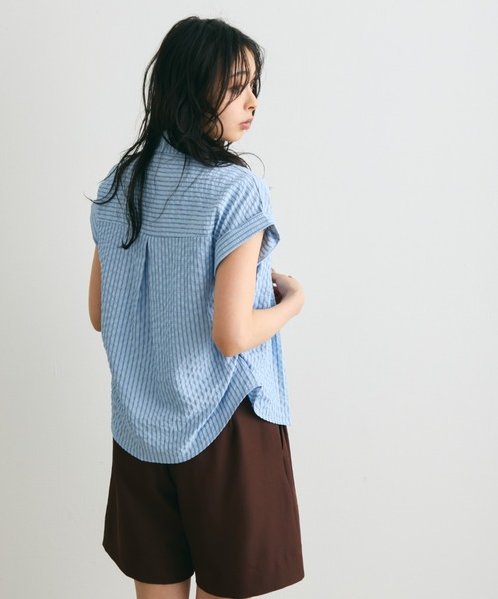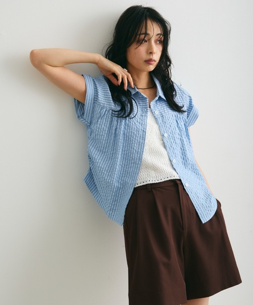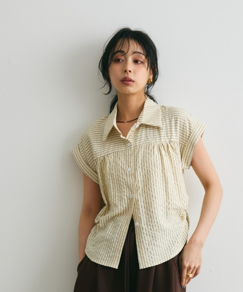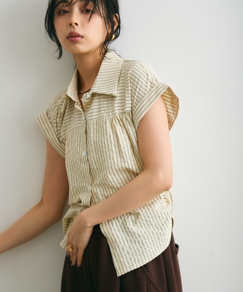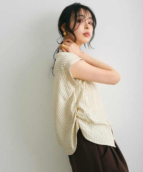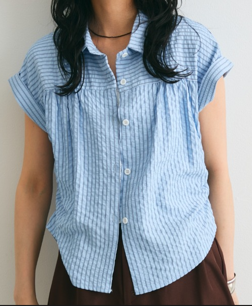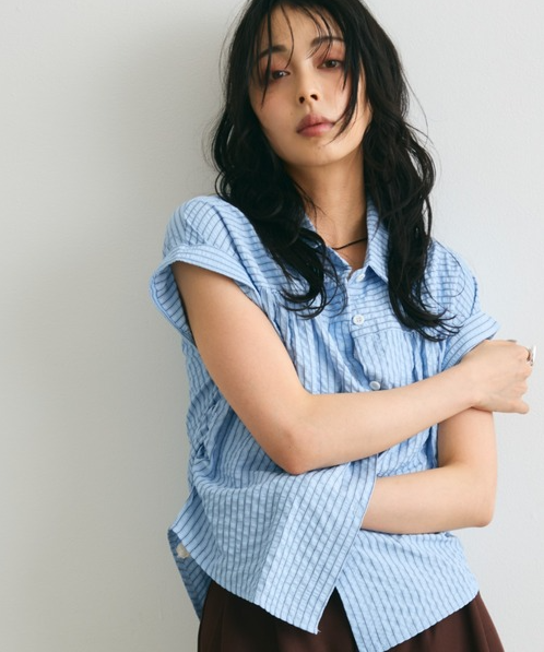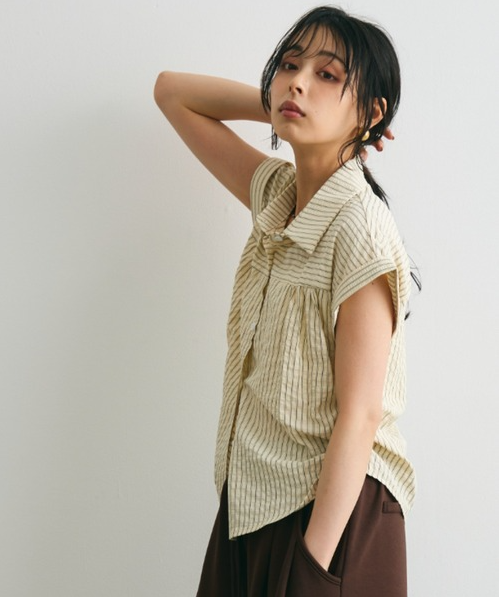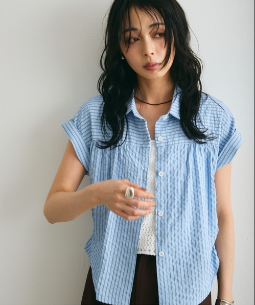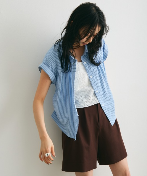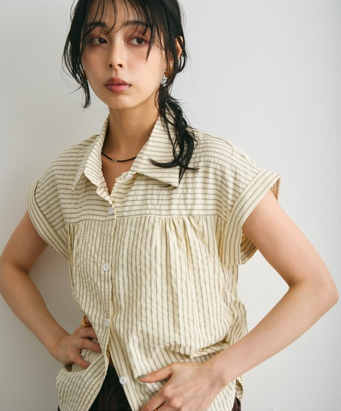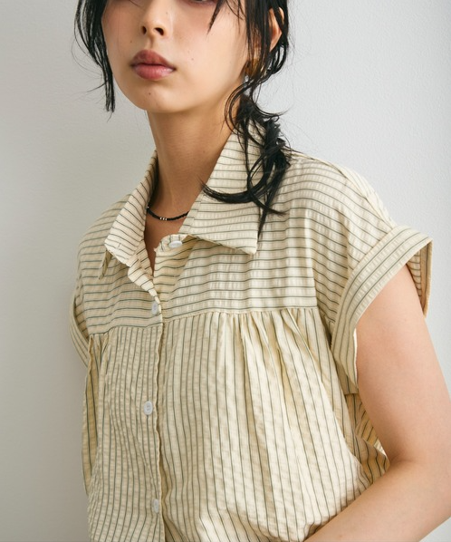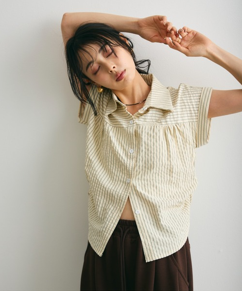 일본식 질감 센스 세로 줄무늬 여성 셔츠 루즈핏 슬림해 보이는 주름 폴로 칼라 반팔 여름 얇은 스타일 셔츠
