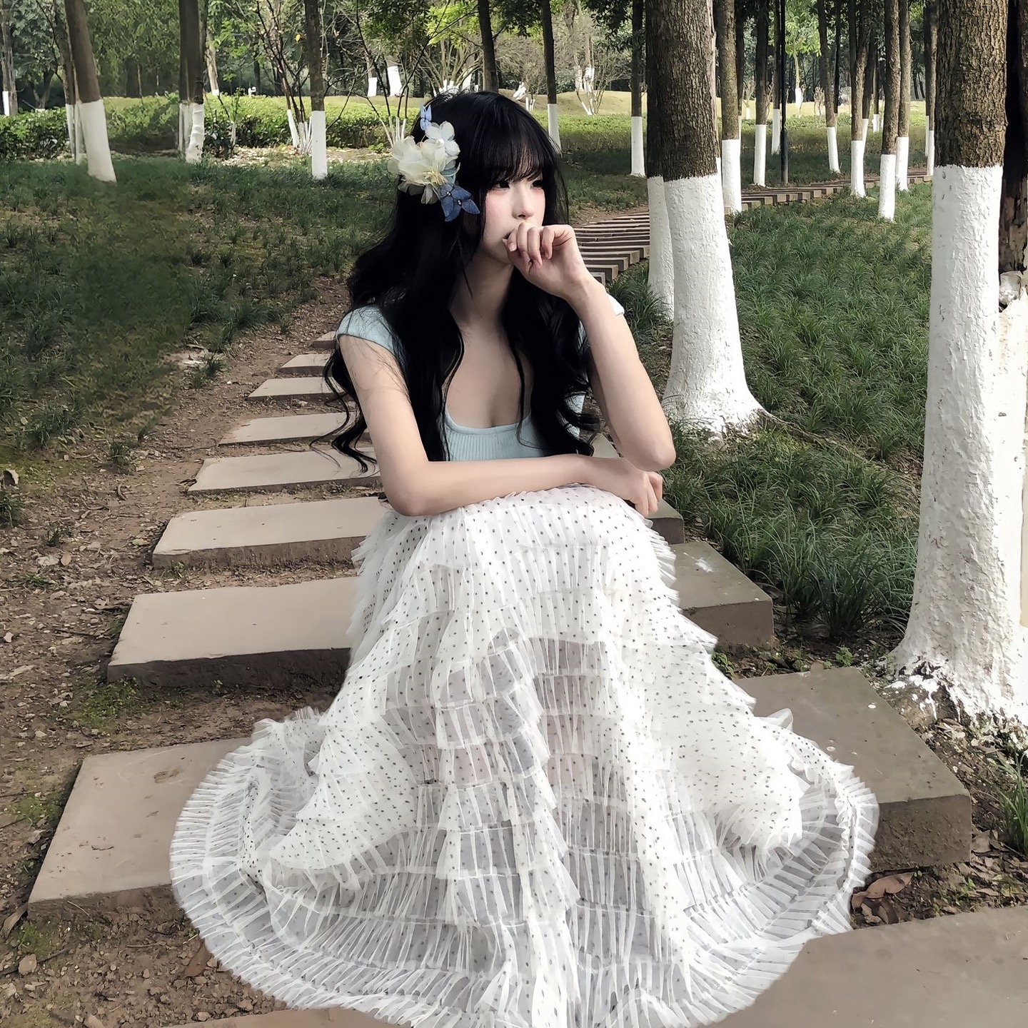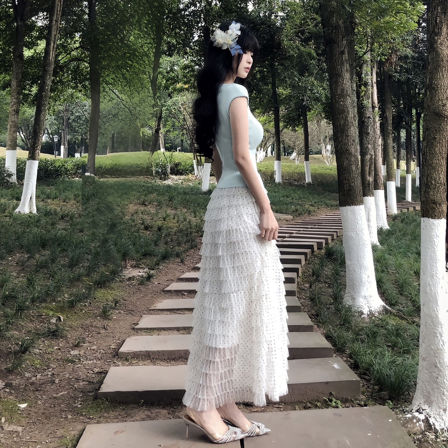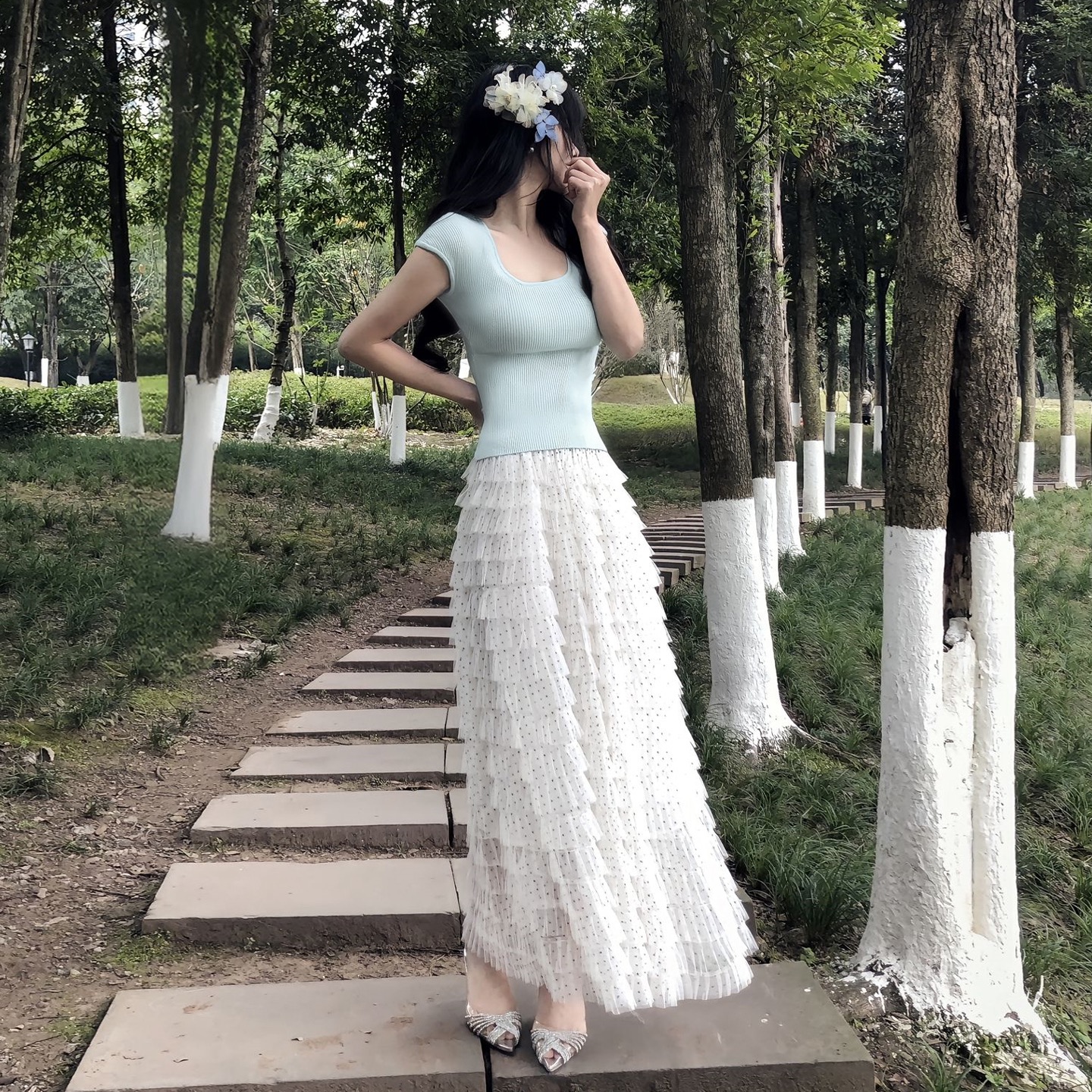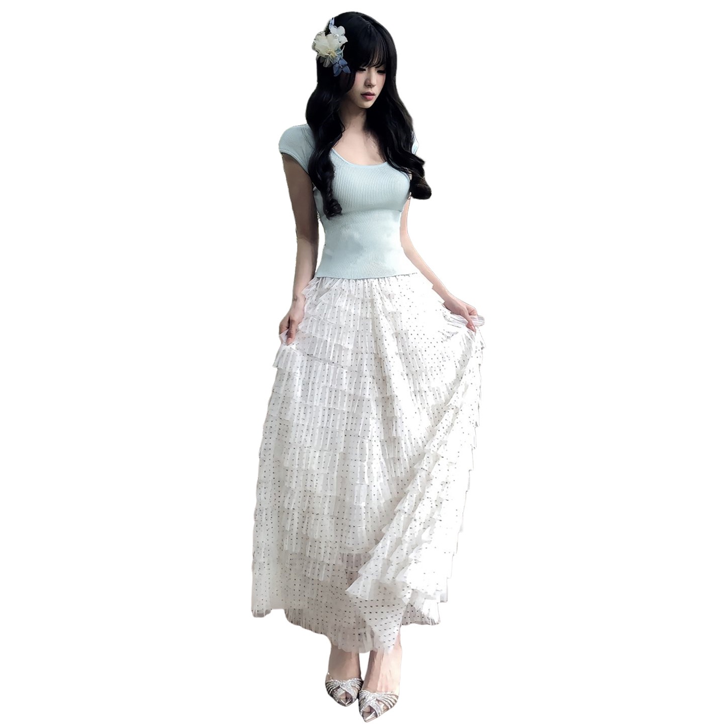 조기 봄 점프 슈트 치마 여성 의류 2026 새로운 부드러운 한 부서 달콤한 자매 착용 가져 가라. 파란색 불규칙 롱 스커트 세트