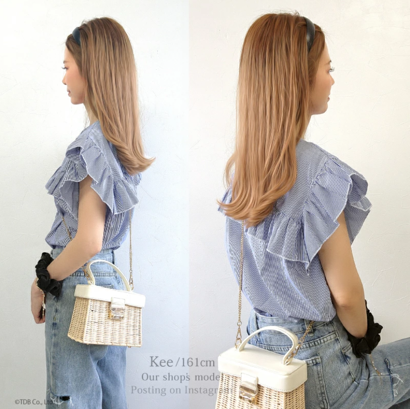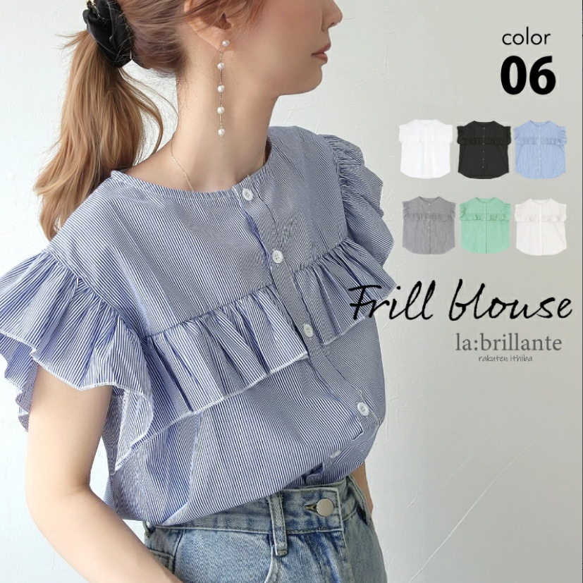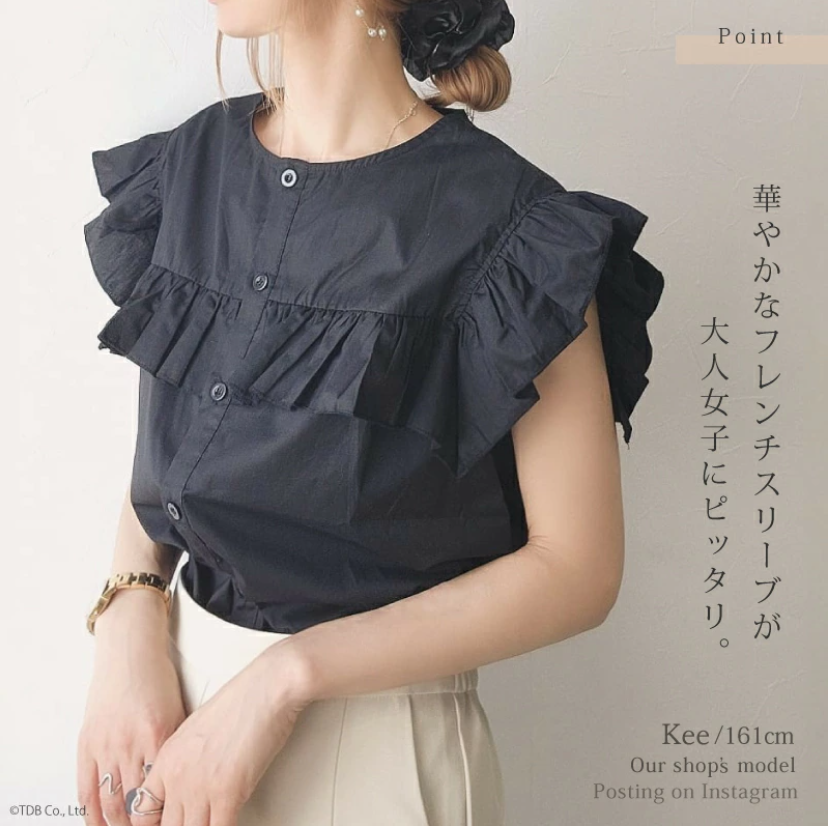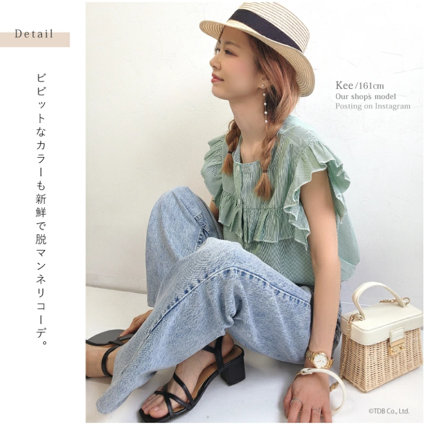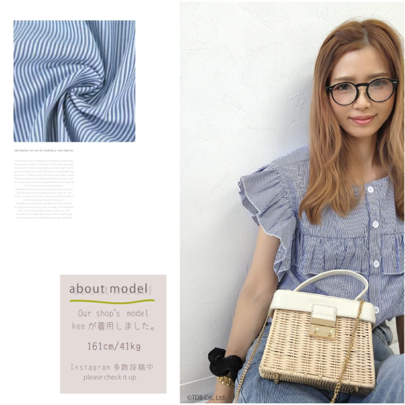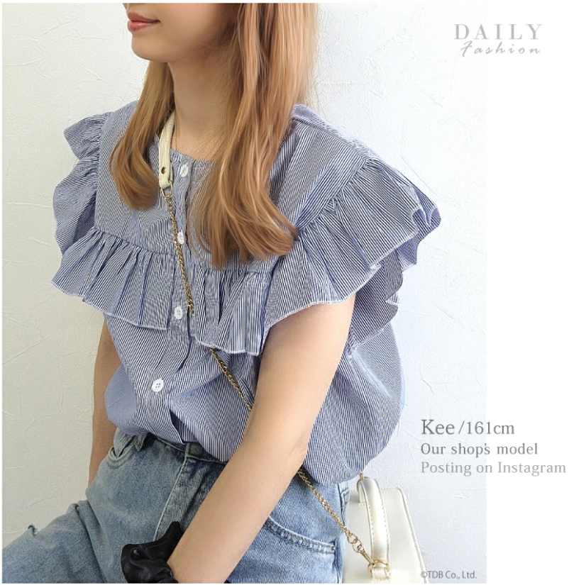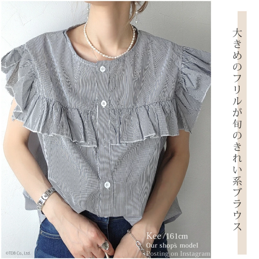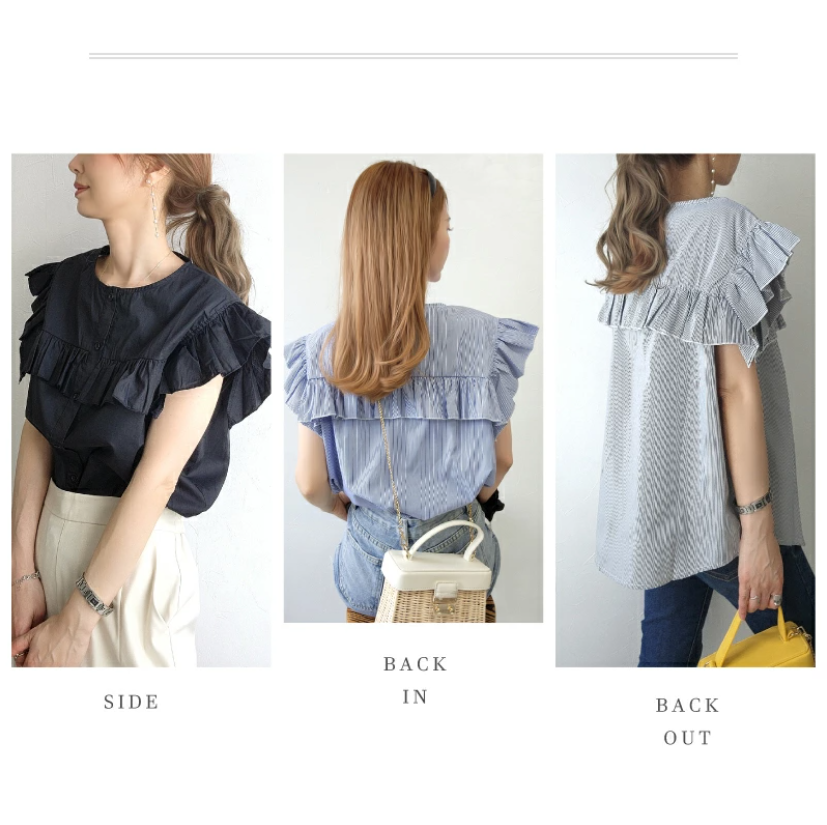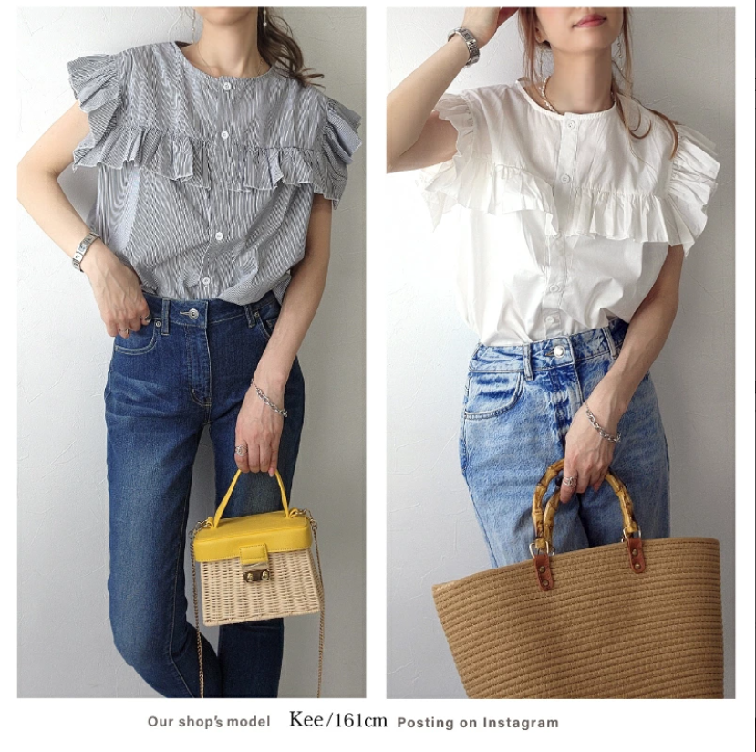 일본식 스트라이프 프릴 반팔 셔츠 루즈핏 라운드 넥 Feifei 소매 디자인 센스 여름 셔츠