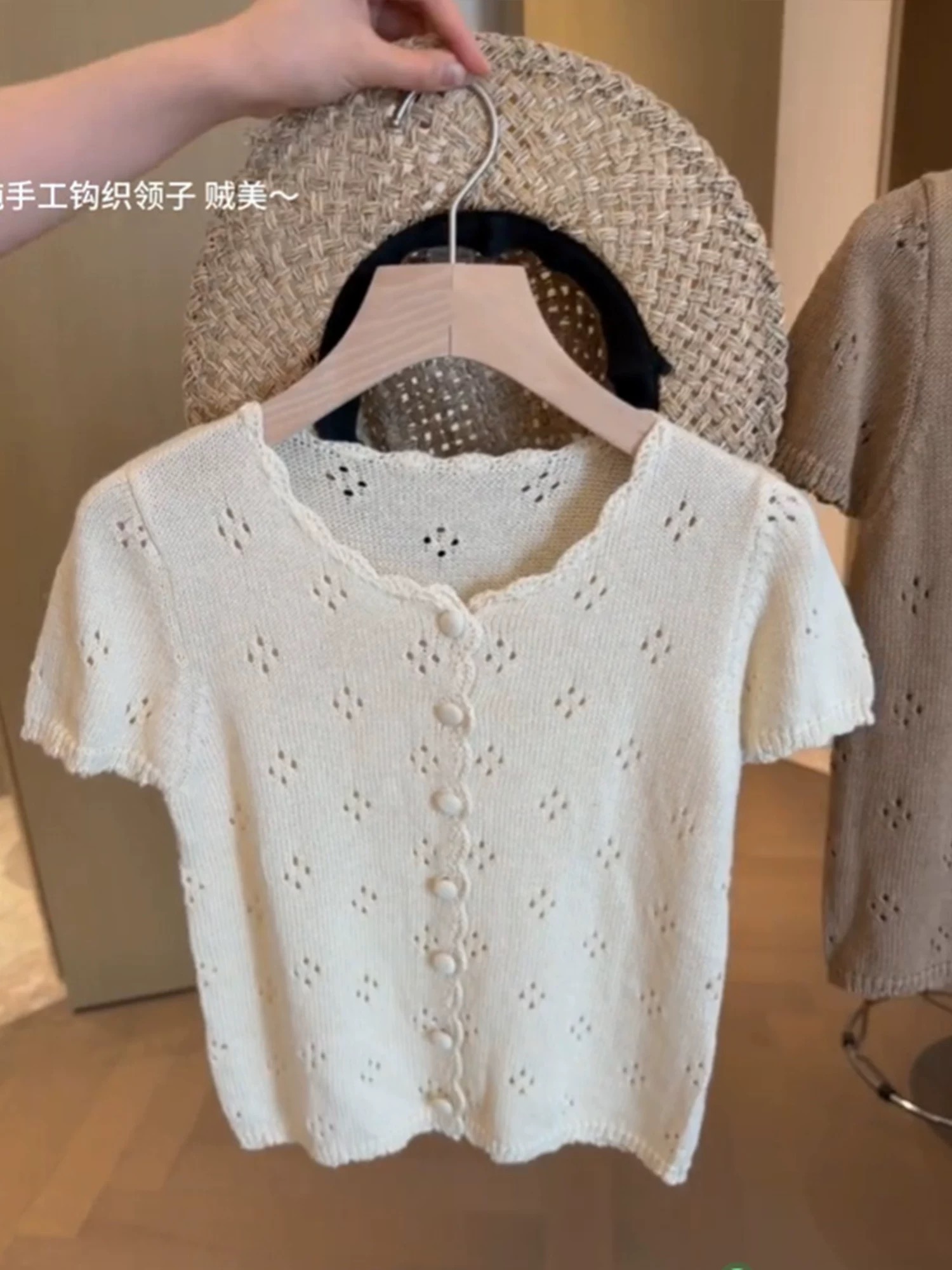 한 부서 목이버섯 레이스 화이트 홀로우 아웃 반팔 니트 오픈 가디건 여성 여름 슬림해 보이는 얇은 스타일 맨위