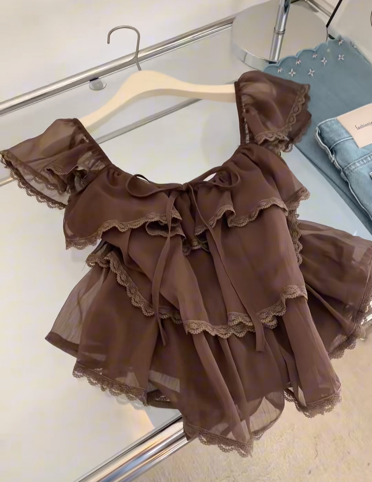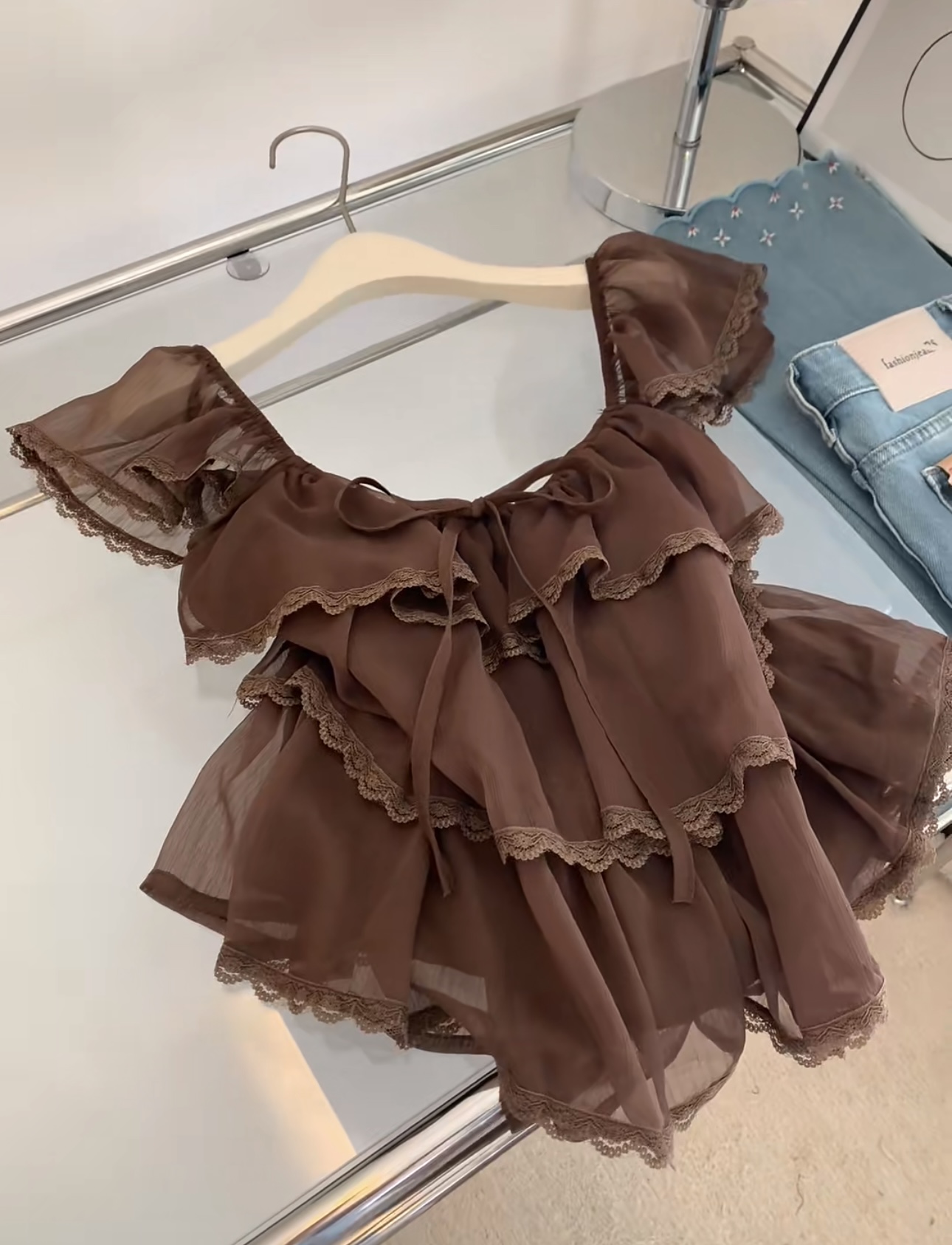 한 부서 달콤함 레이스 조각 프릴 작은 날다 소매 여성 셔츠 여름 새로운 패션 연령 감소 루즈핏 풀오버 맨위