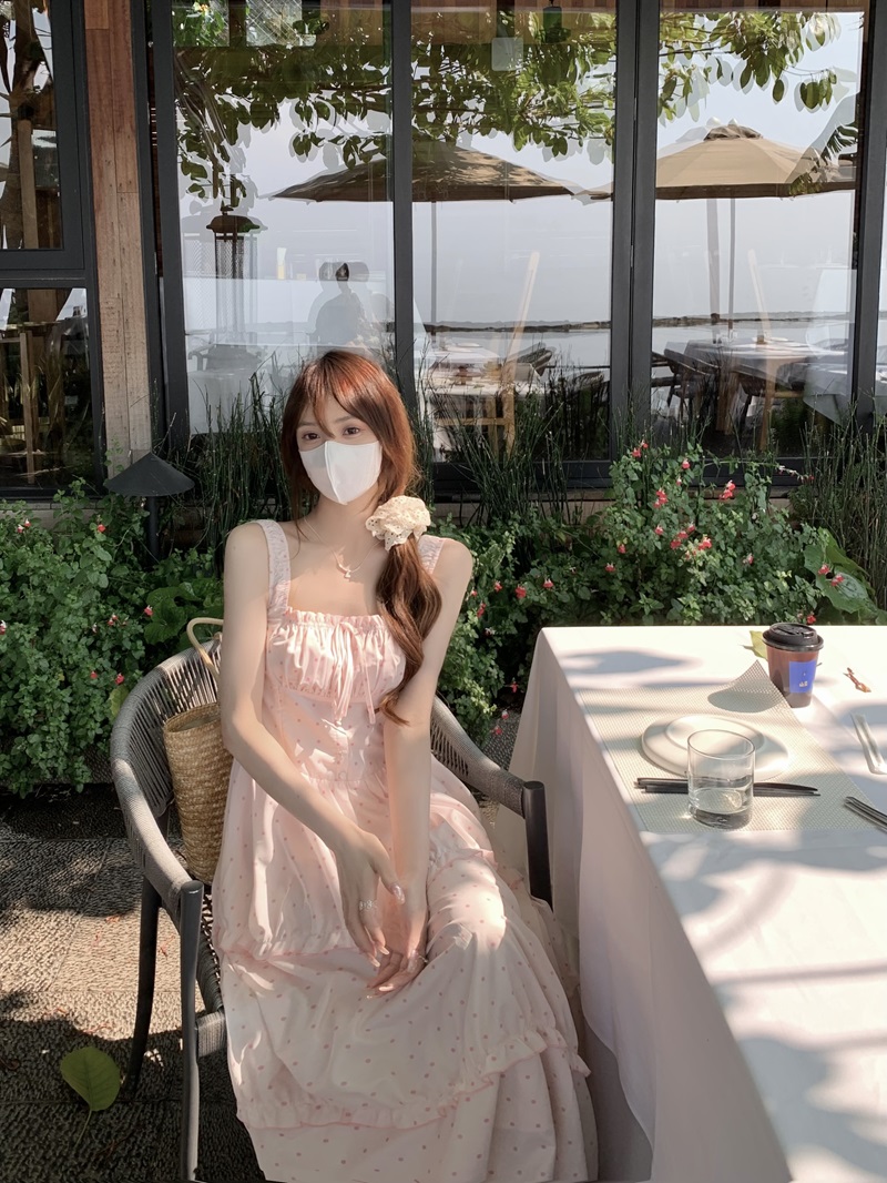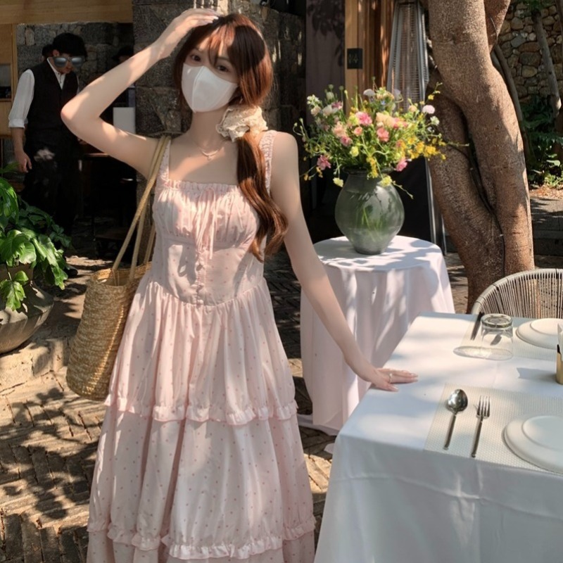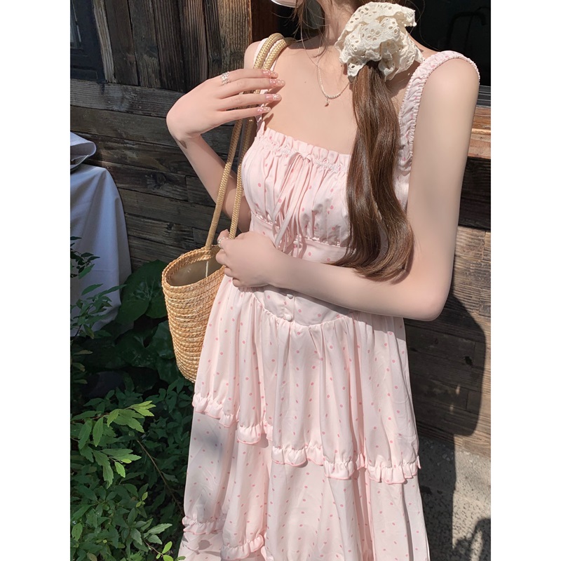 실사 정가 여름 새로운 도트 무늬 요정 품격 핑크색 슬립 드레스