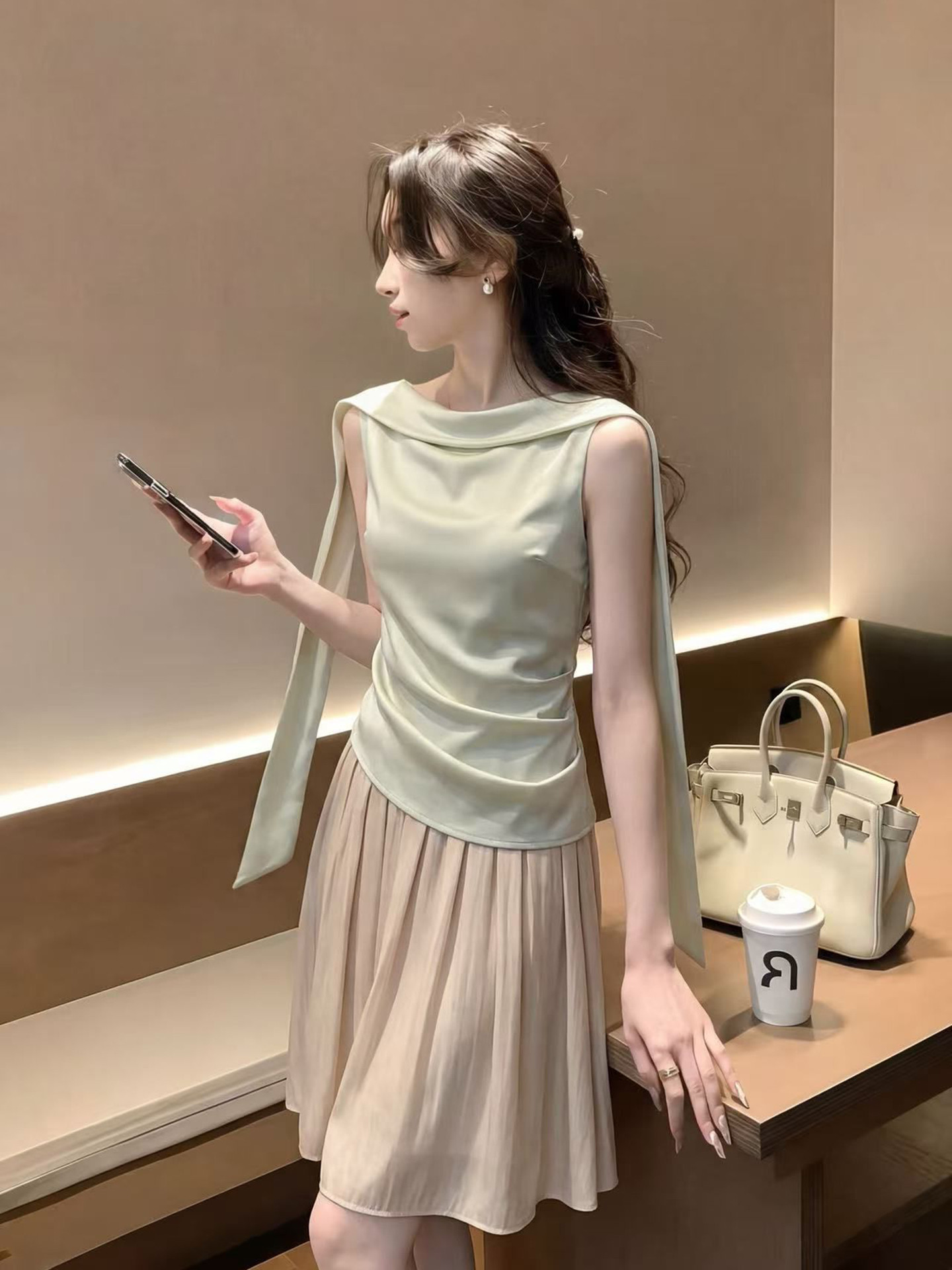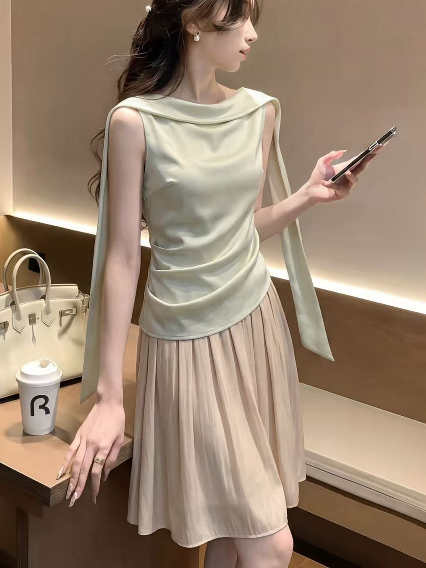 멘 시우스 정의 같은 단락 품격 달콤함 황색 민소매 작은 대중 허리 수축 슬림해 보이는 드레스 주름 장식 휴가 바람 롱 스커트 여성