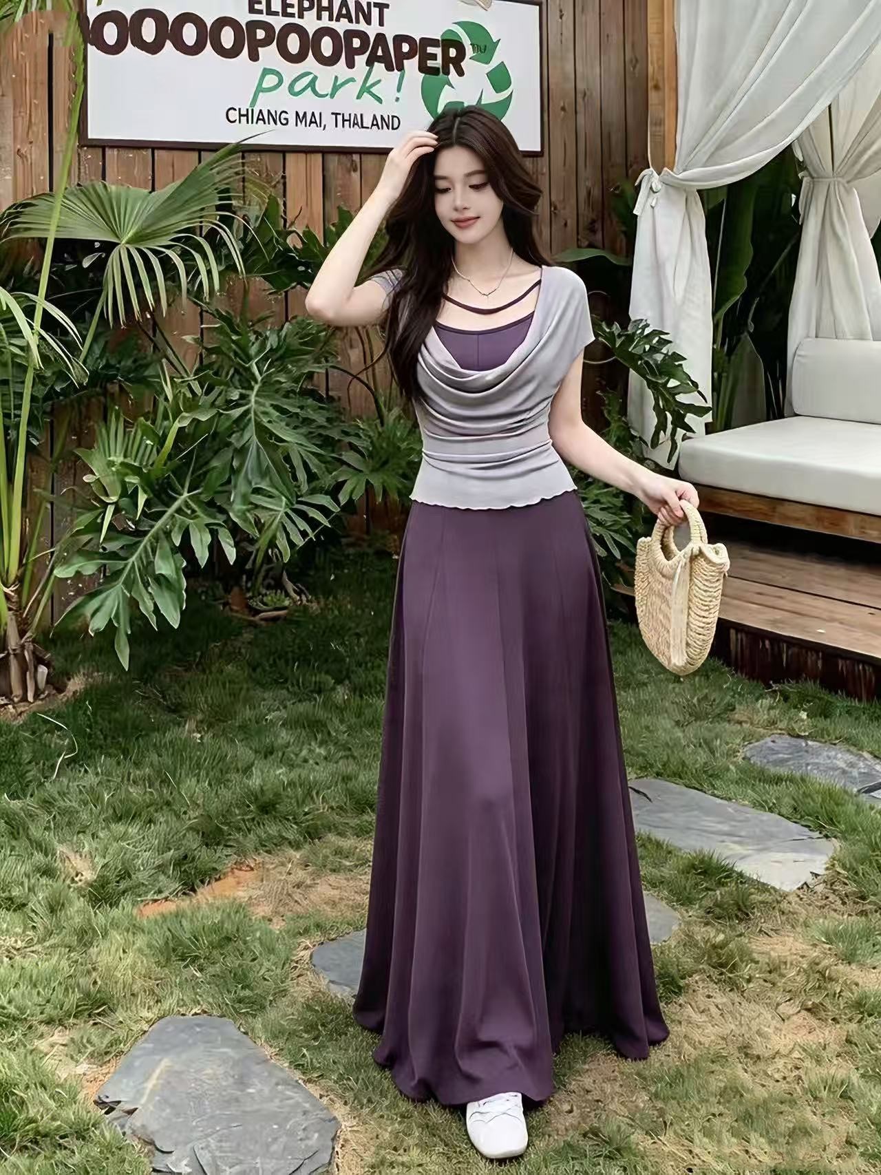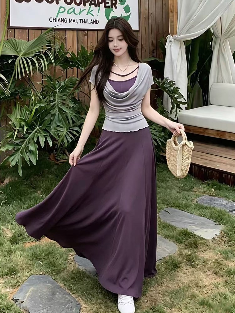 2026 여름 새로운 지방 mm 디자인 센스 페이크 레이어드 패치워크 허리 수축 연령 감소 고급 품격 중간 길이 드레스