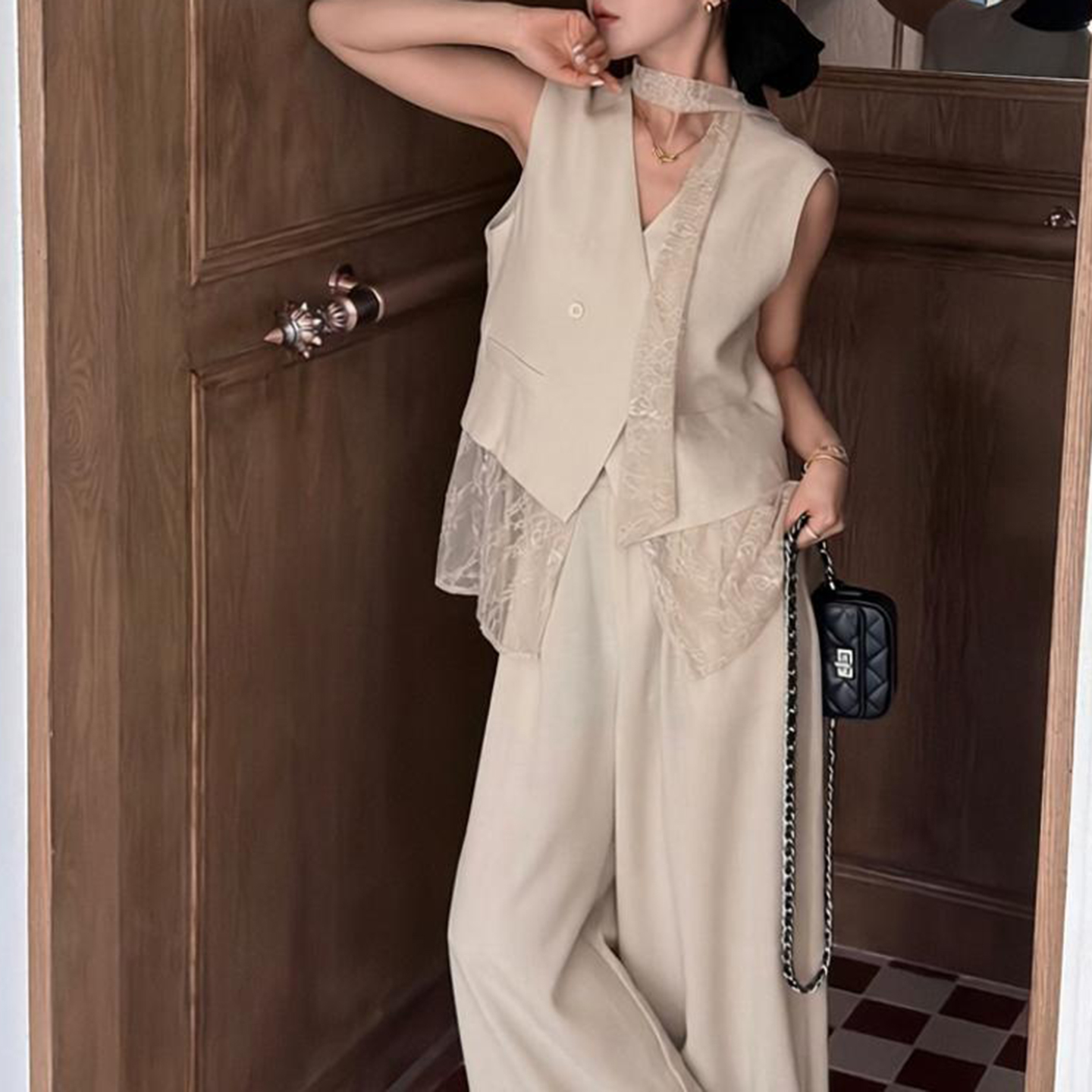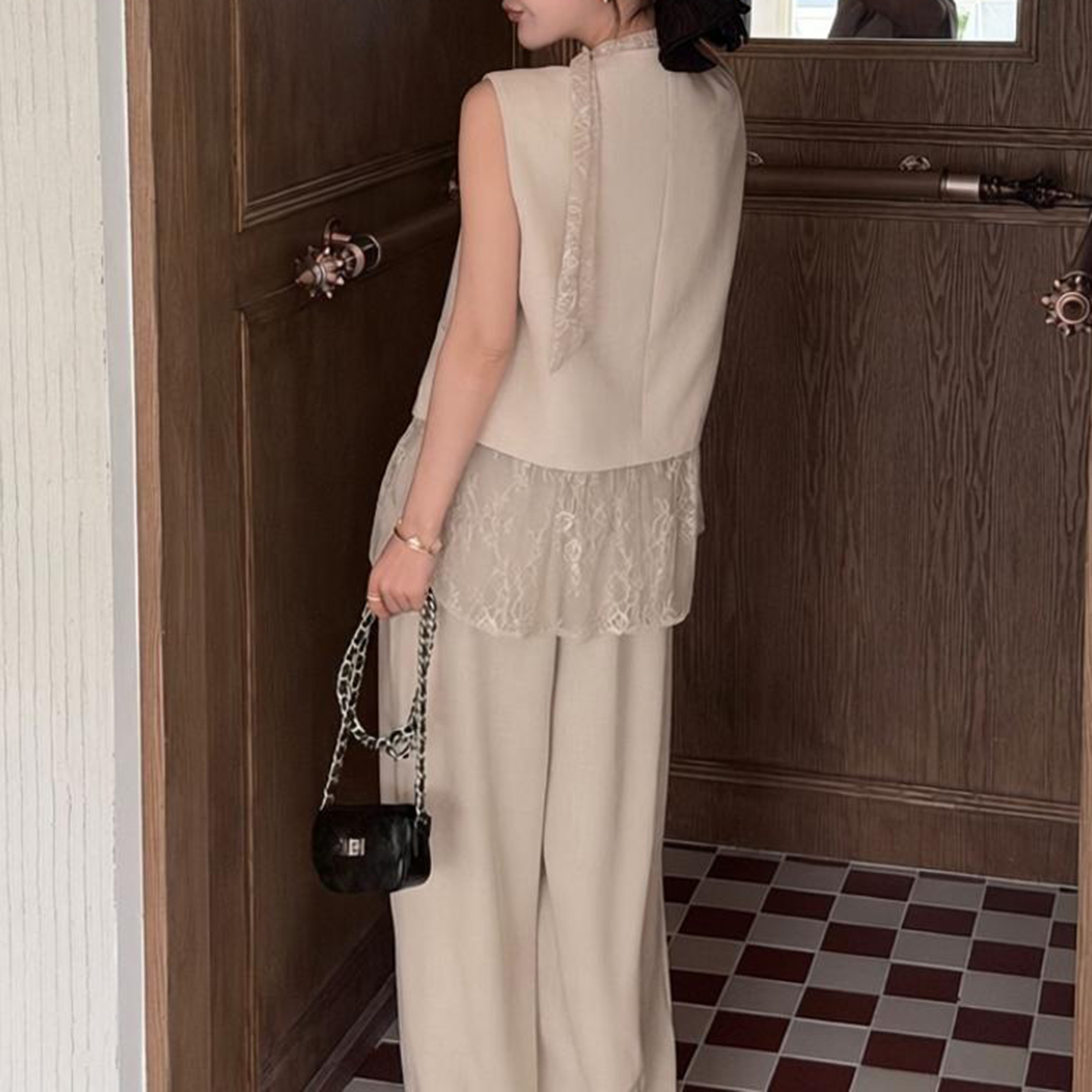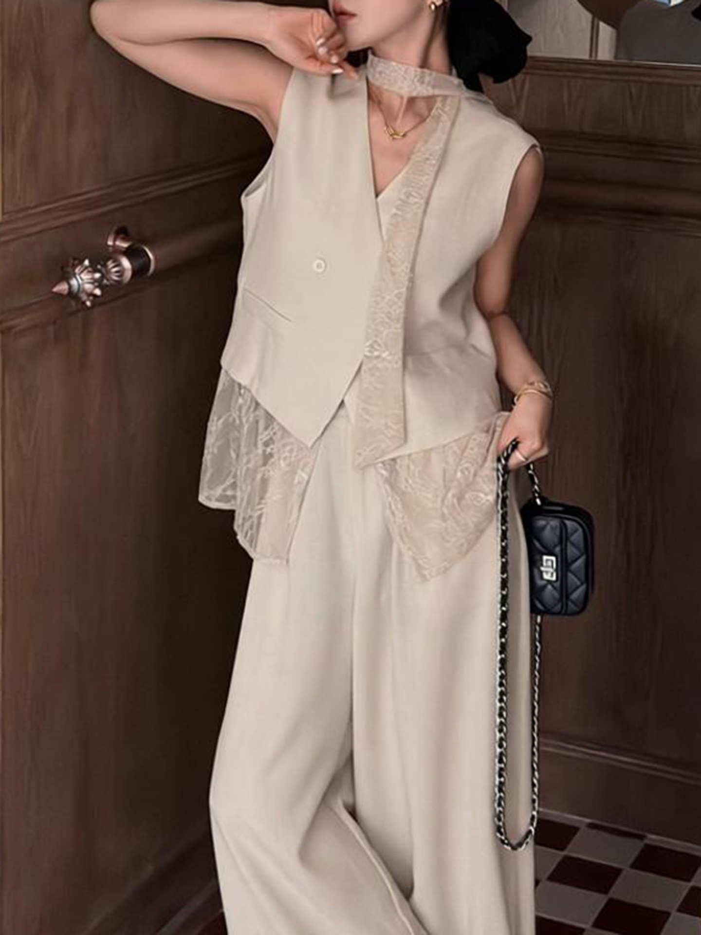 경관 그림 2026 여름 새로운 한국 스타일 패션 품격 패치워크 레이스 베스트 하이웨이스트 와이드 레그 팬츠 패션 세트