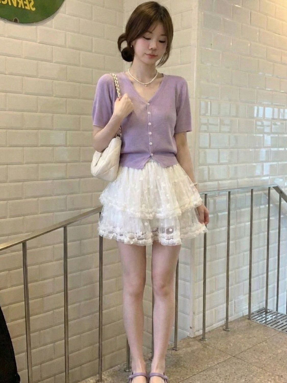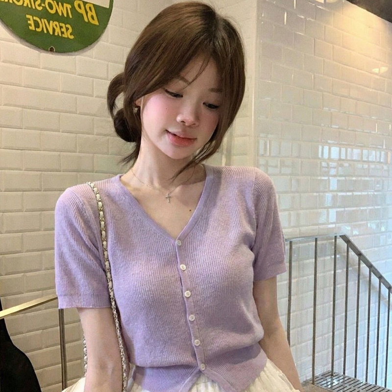 보라색 V넥 얼음 실크 니트 반팔 오픈 가디건 여성 여름 새로운 맨위 자이언트 잘 생긴 작은 대중 고유 한 슈퍼 잘 생긴 티셔츠