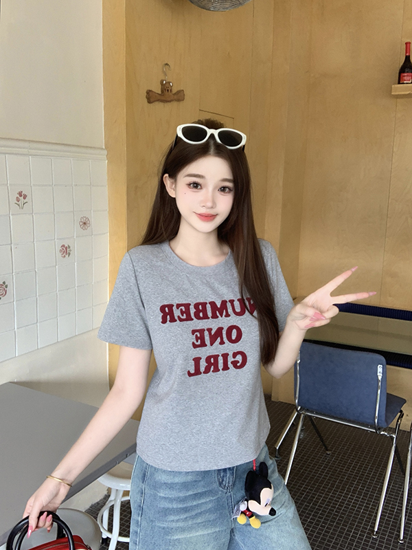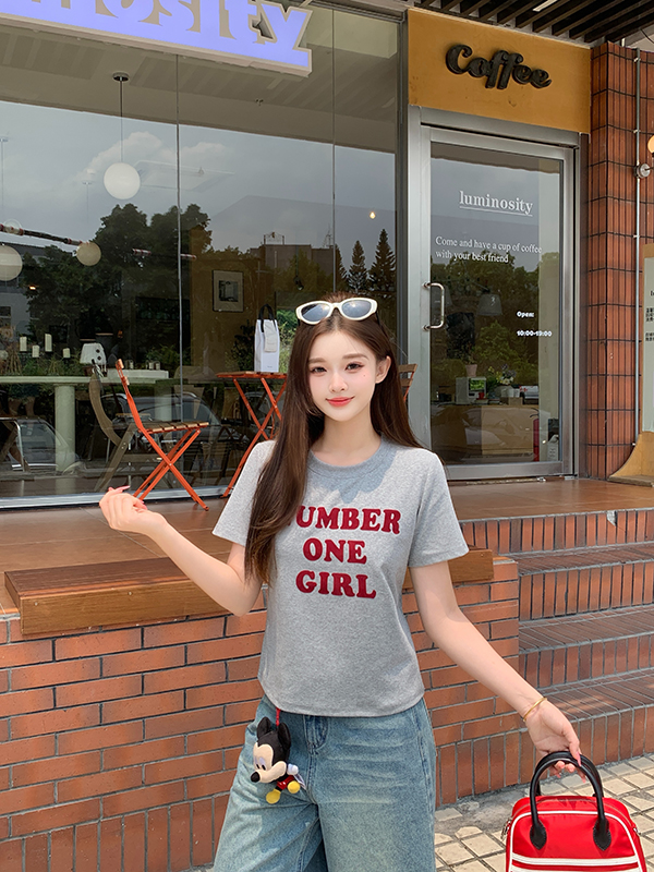 실사 정가 2026 년 여름 새로운 루즈핏 슬림해 보이는 호박 알파벳 프린트 반팔 티셔츠 맨위 여성