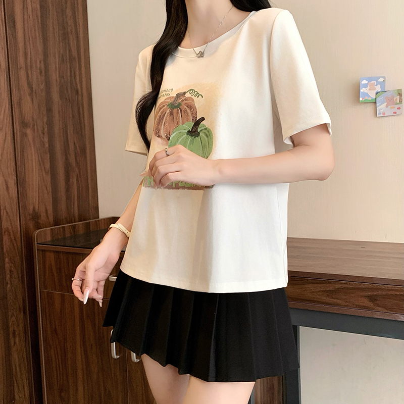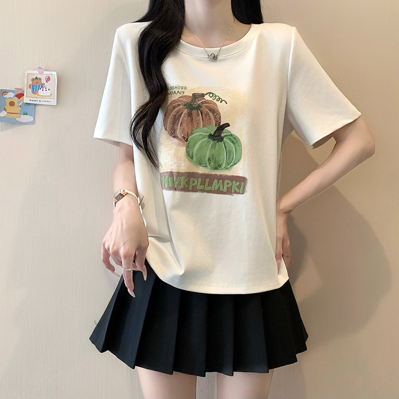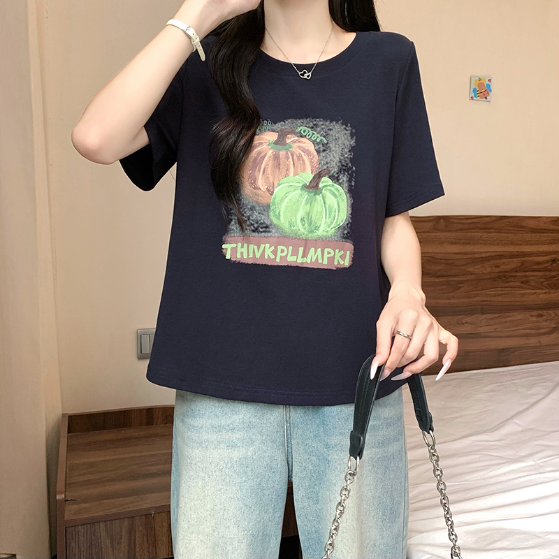 실사 정가 2026 년 여름 새로운 루즈핏 슬림해 보이는 호박 알파벳 프린트 반팔 티셔츠 맨위 여성